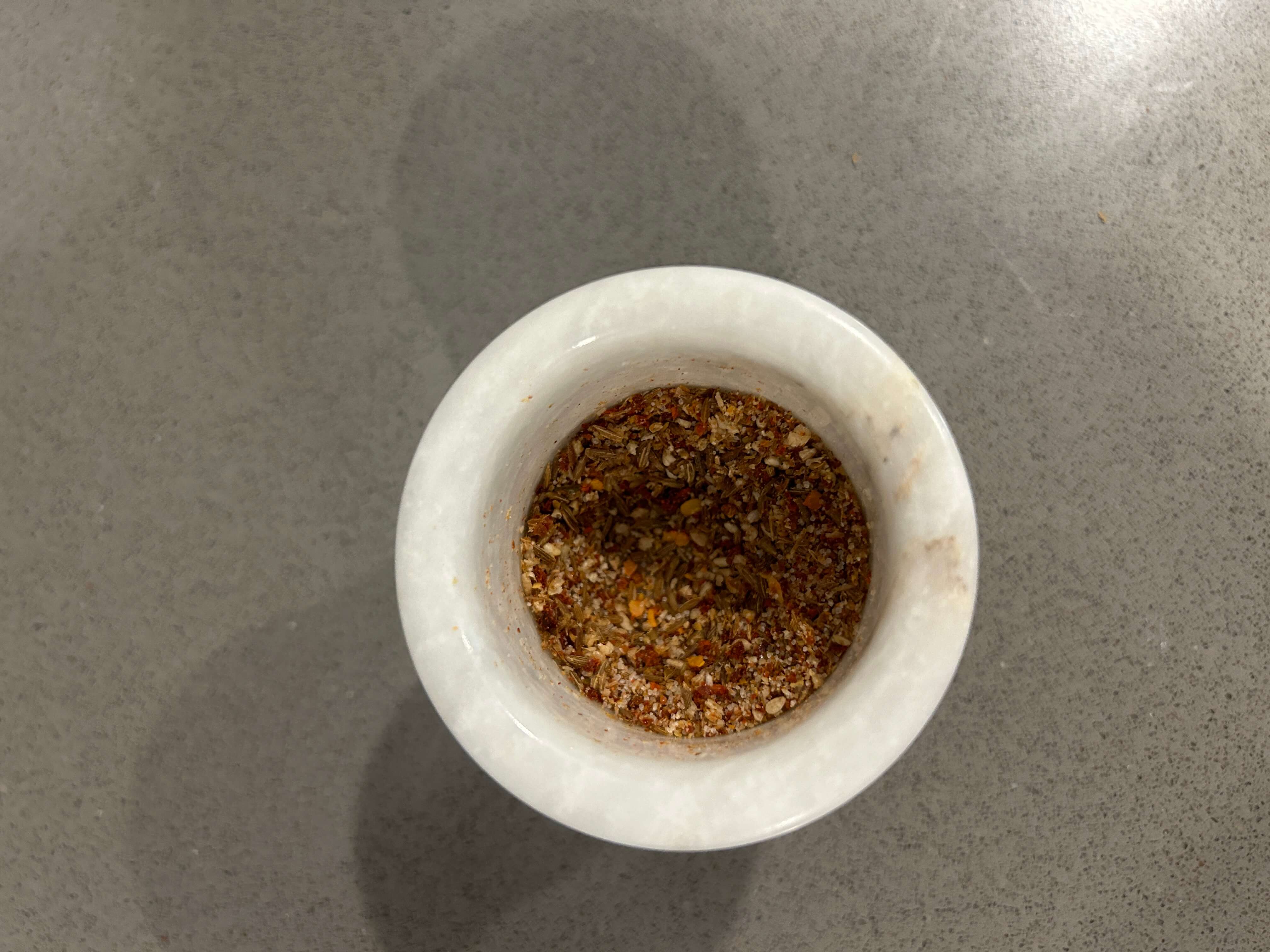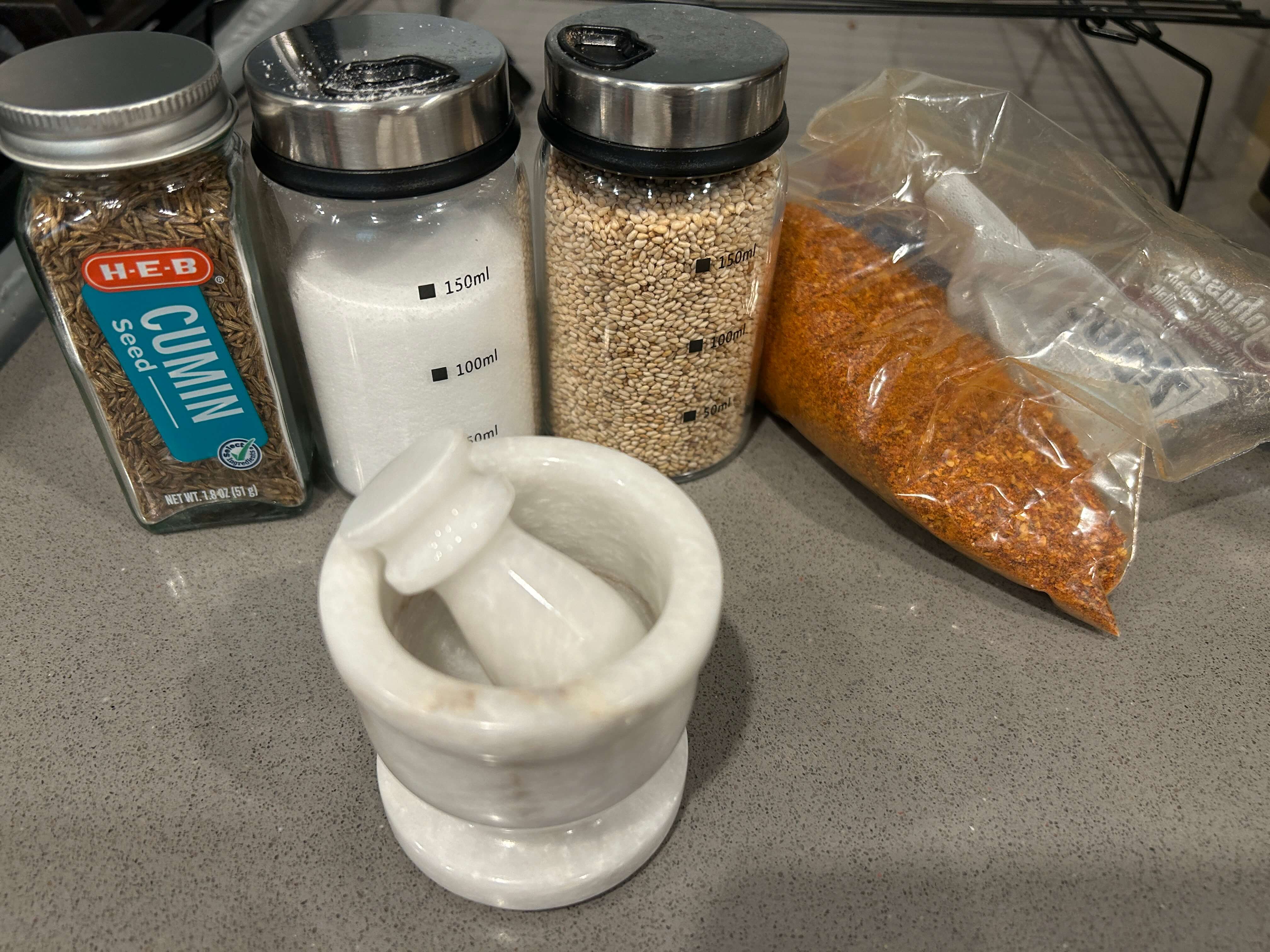 8. 큐민, 소금, 깨, 고춧가루를 미니절구에 넣고 갈아줍니다. (선호하는 굵기만큼)