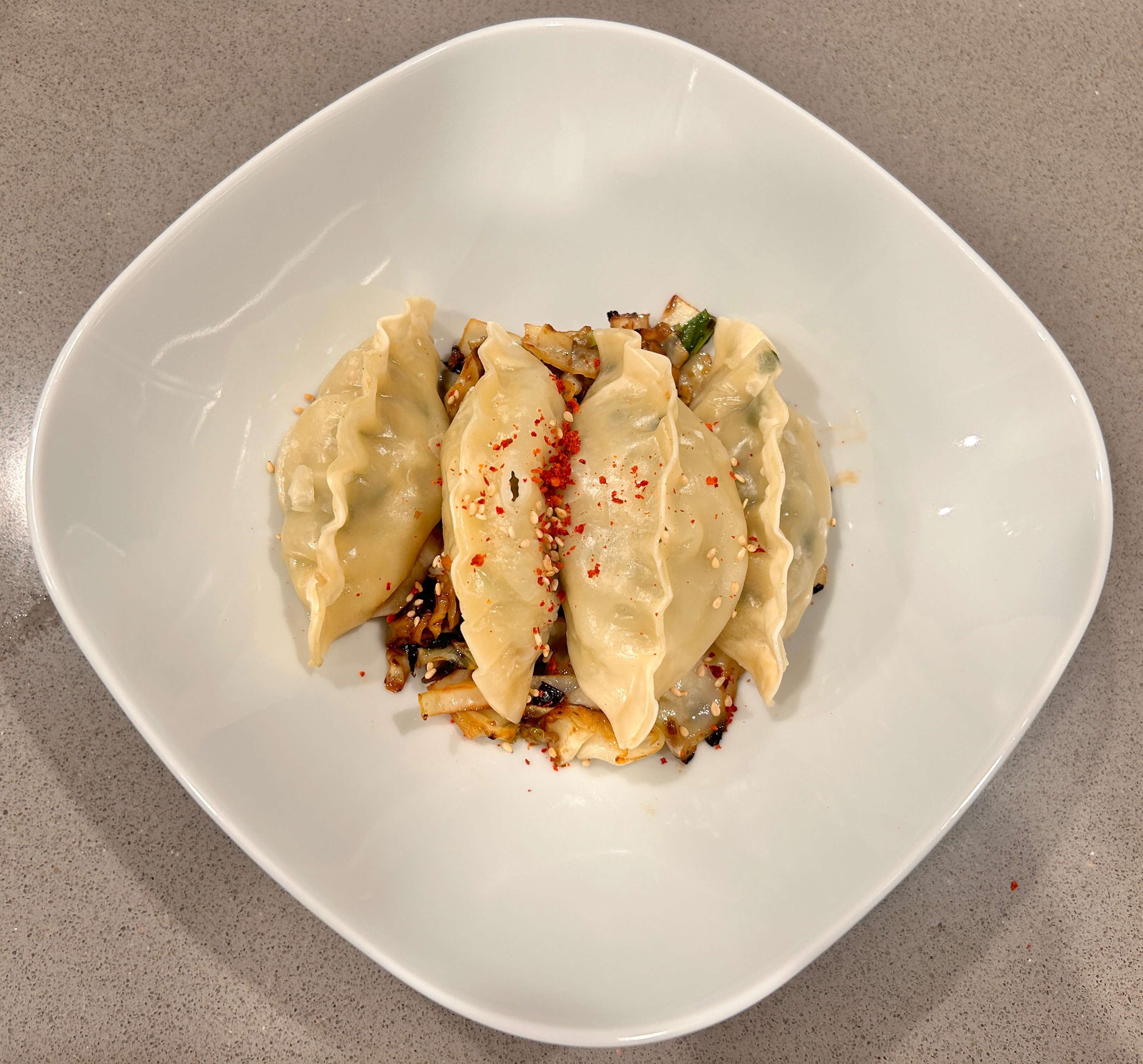 8. 양배추담은 그릇 위에 만두를 올려줍니다.