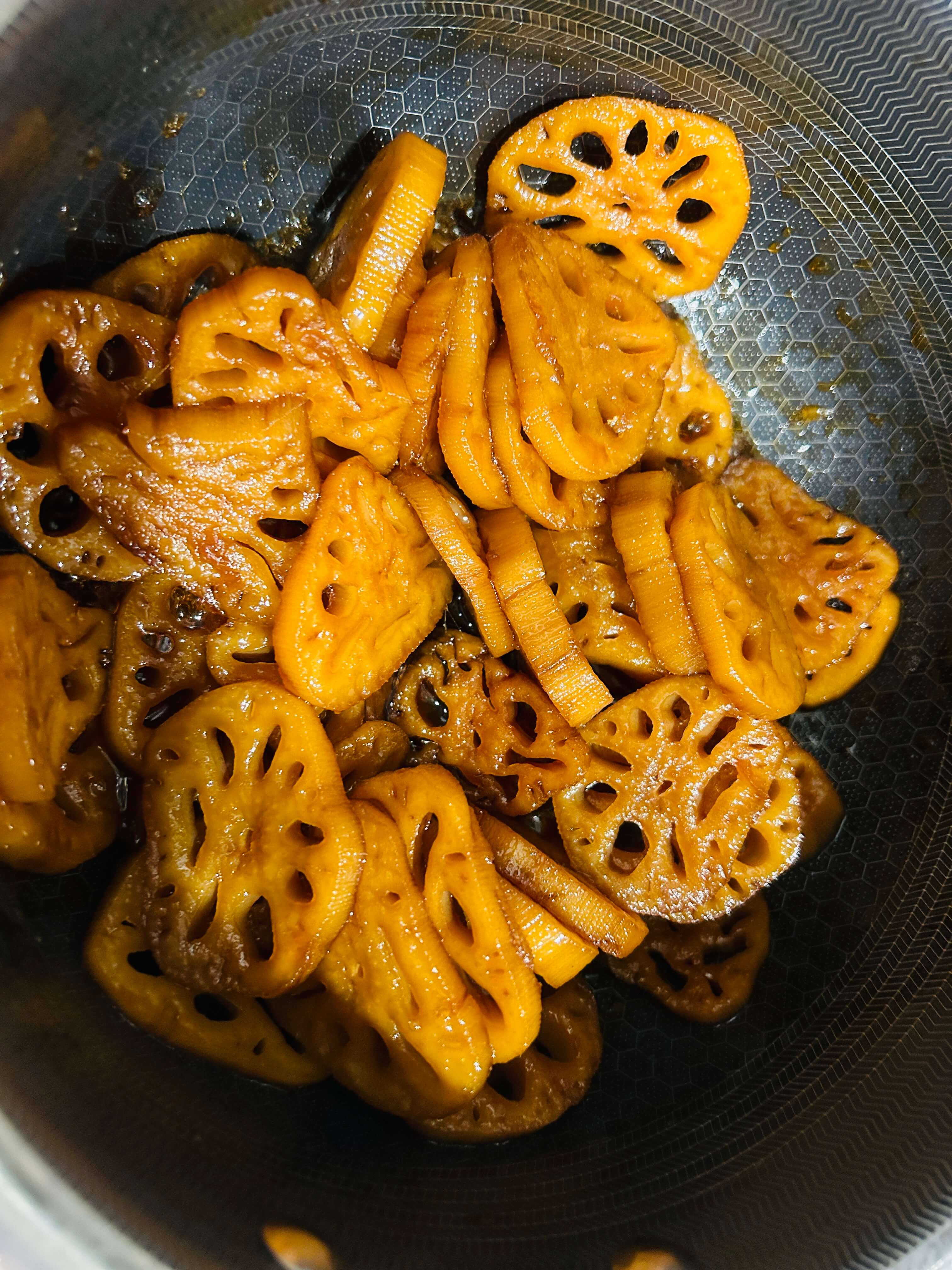 5. 삶은 연근에 물:간장:설탕 = 1:1:0.5를 넣고 물엿을 한 바퀴 정도 넣어줍니다.