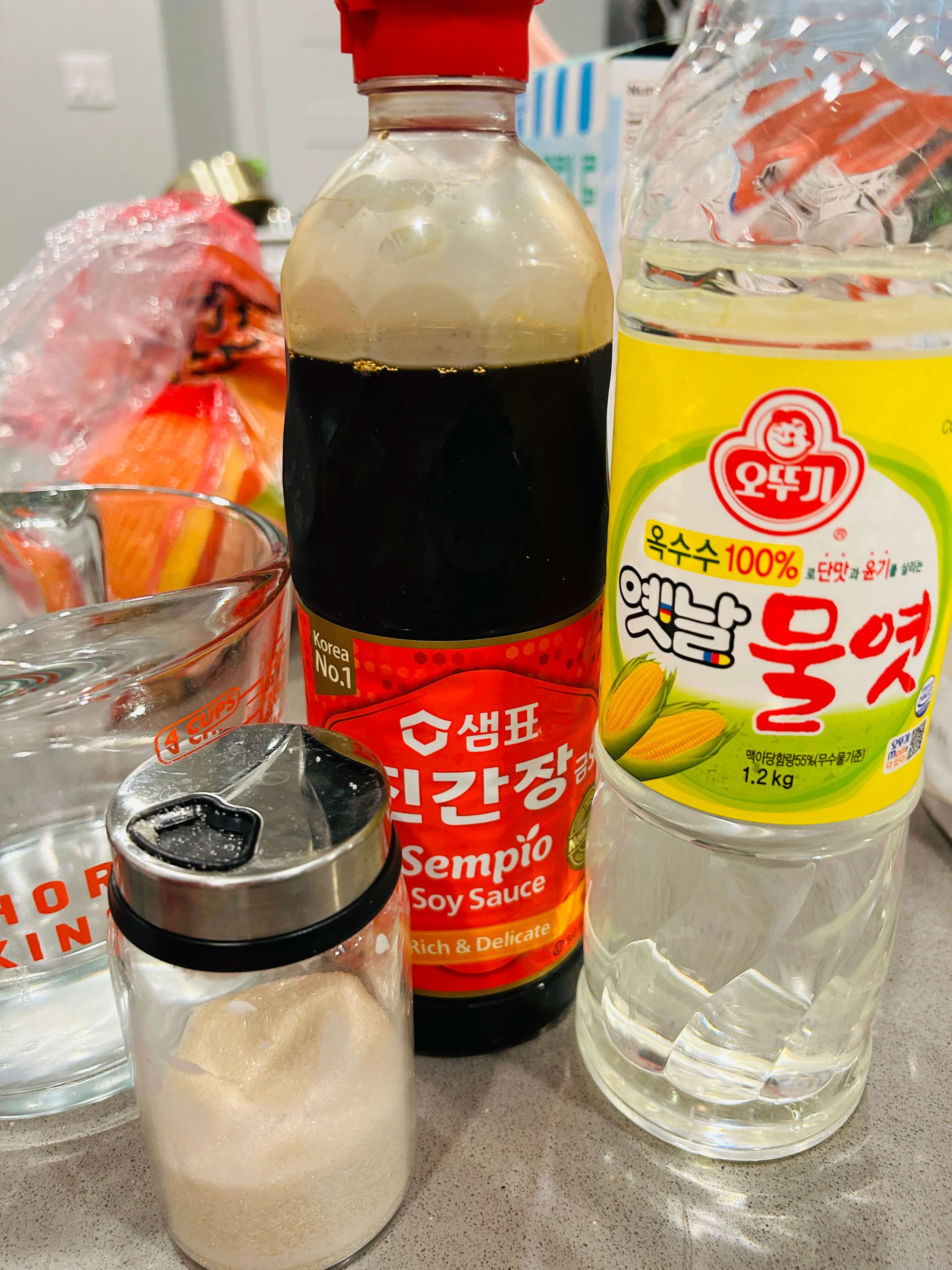 4. 연근조림 소스로, 물, 진간장, 설탕, 물엿을 준비해 줍니다.
