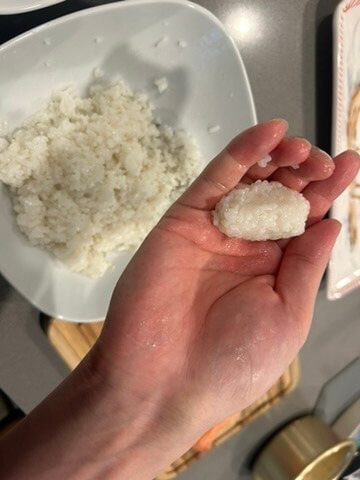 7. 식초물을 손에 한번 묻힌 후 초밥 모양을 잡아 줍니다. (이렇게 하면 손에 밥알이 붙지 않습니다.)