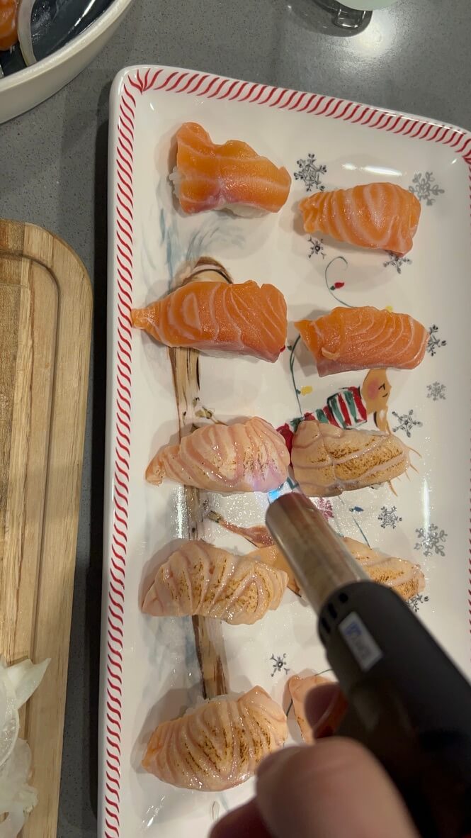 9. 토치로 연어 윗면을 그을려줍니다.