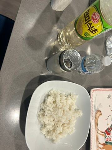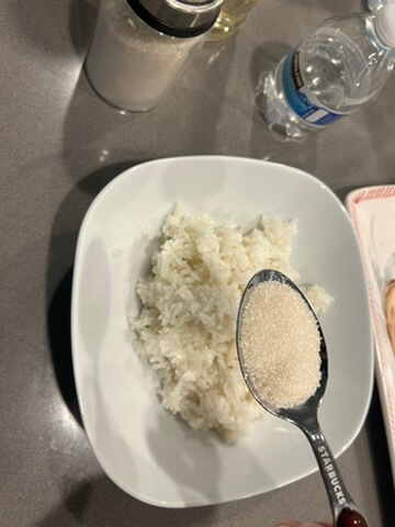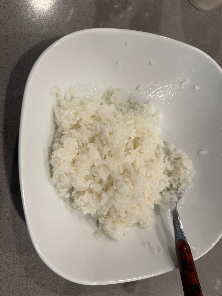 5. 단촛물 (설탕 1, 물 2, 식초 3 숟갈)을 만들어 밥이랑 잘 섞어줍니다.