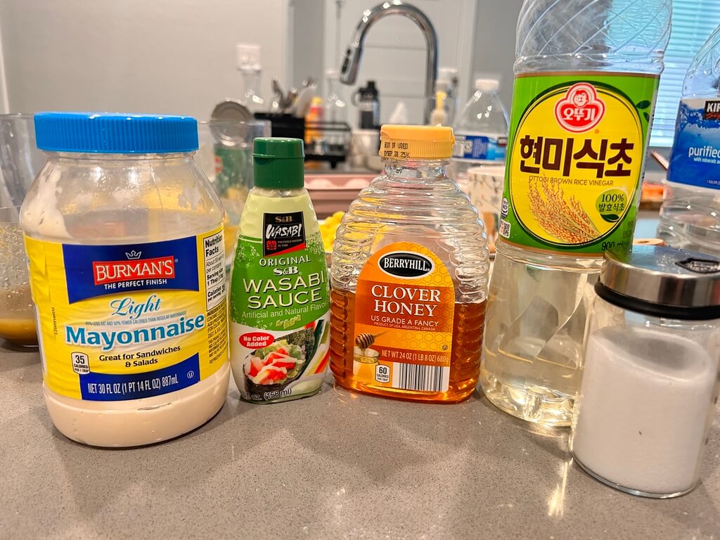 11. 고추냉이 마요소스를 위해 마요네즈, 꿀, 고추냉이, 소금, 식초를 준비합니다.