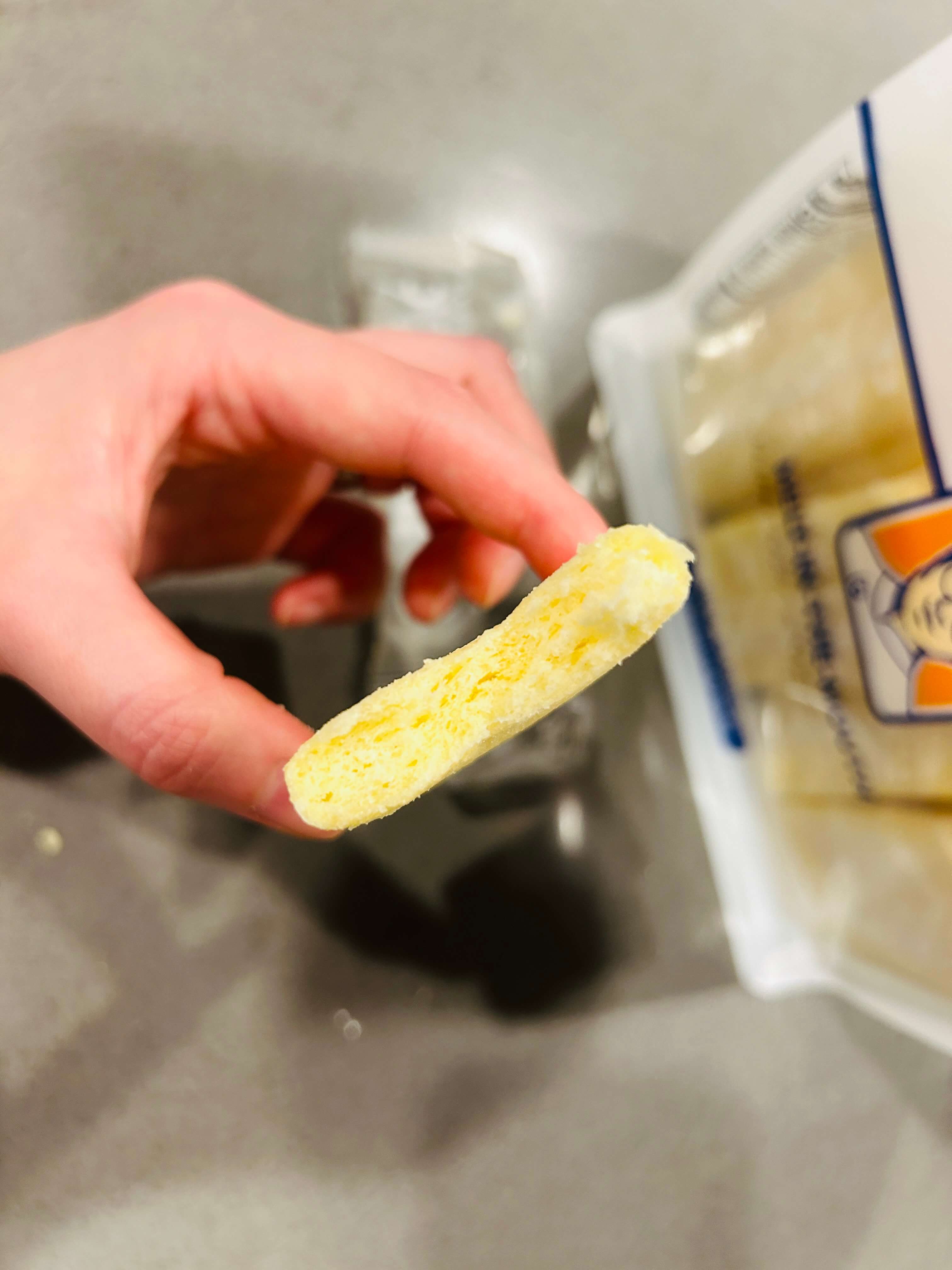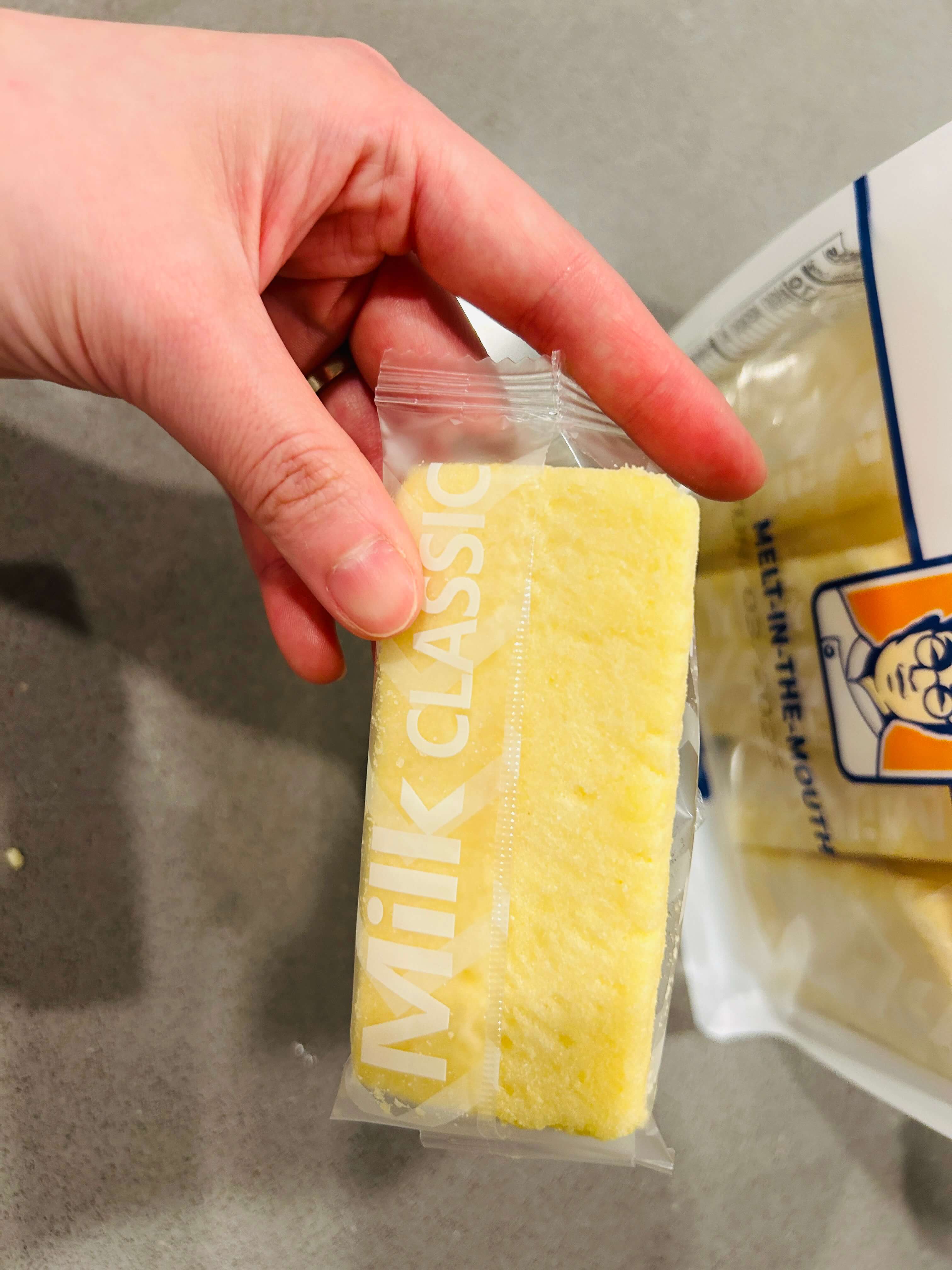이렇게 과자 하나 하나씩 낱개로 포장되어 있습니다. 과자가 봉지에 딱 맞추어 제작되어 있는지라 까는 게 깔끔하진 않았습니다. 과자가 부드럽기 때문에 봉지 개봉하시다가 과자 부스러기가 많이 나오기 때문에 이점 유의하시면 좋으실 것 같습니다.