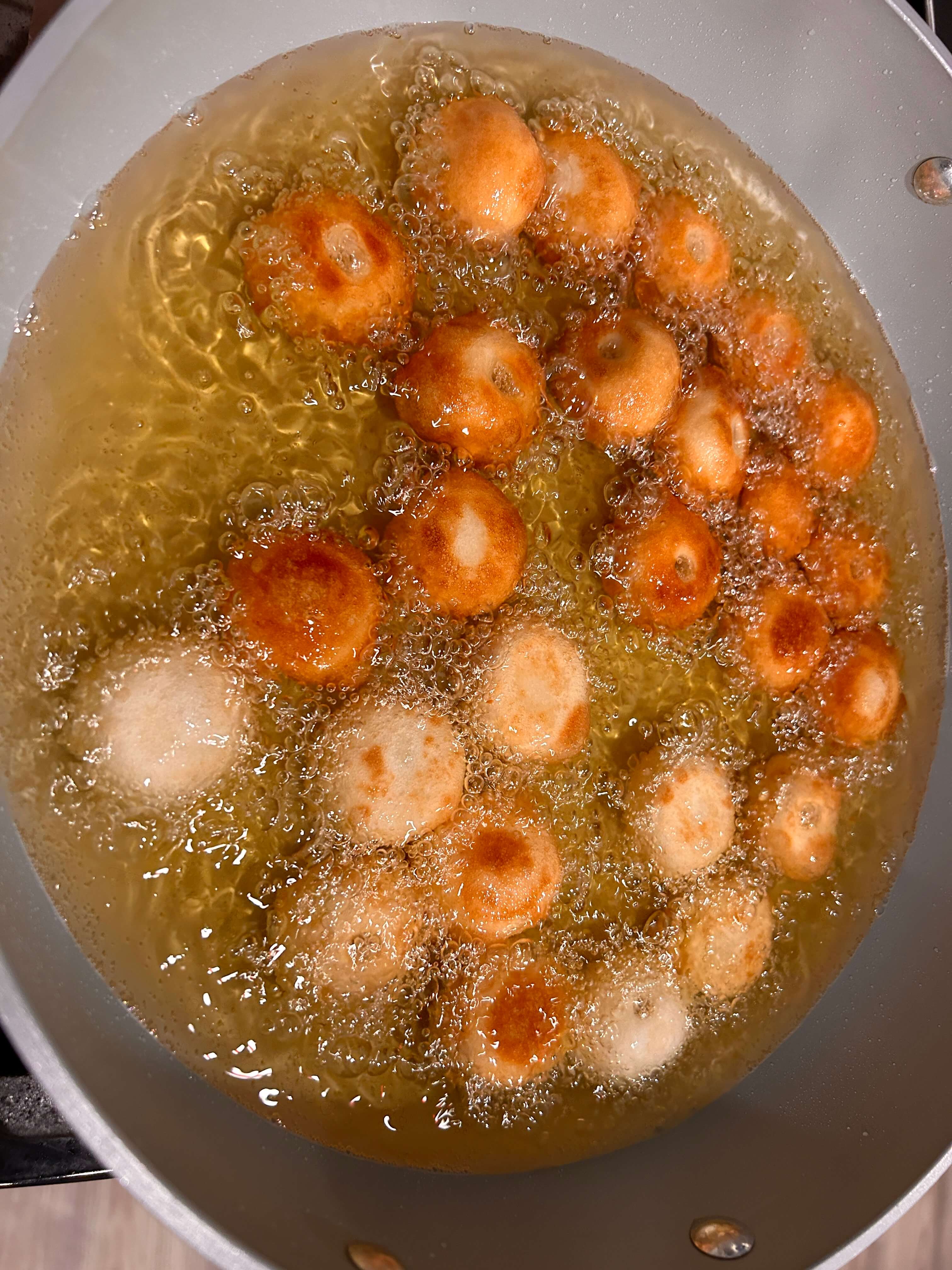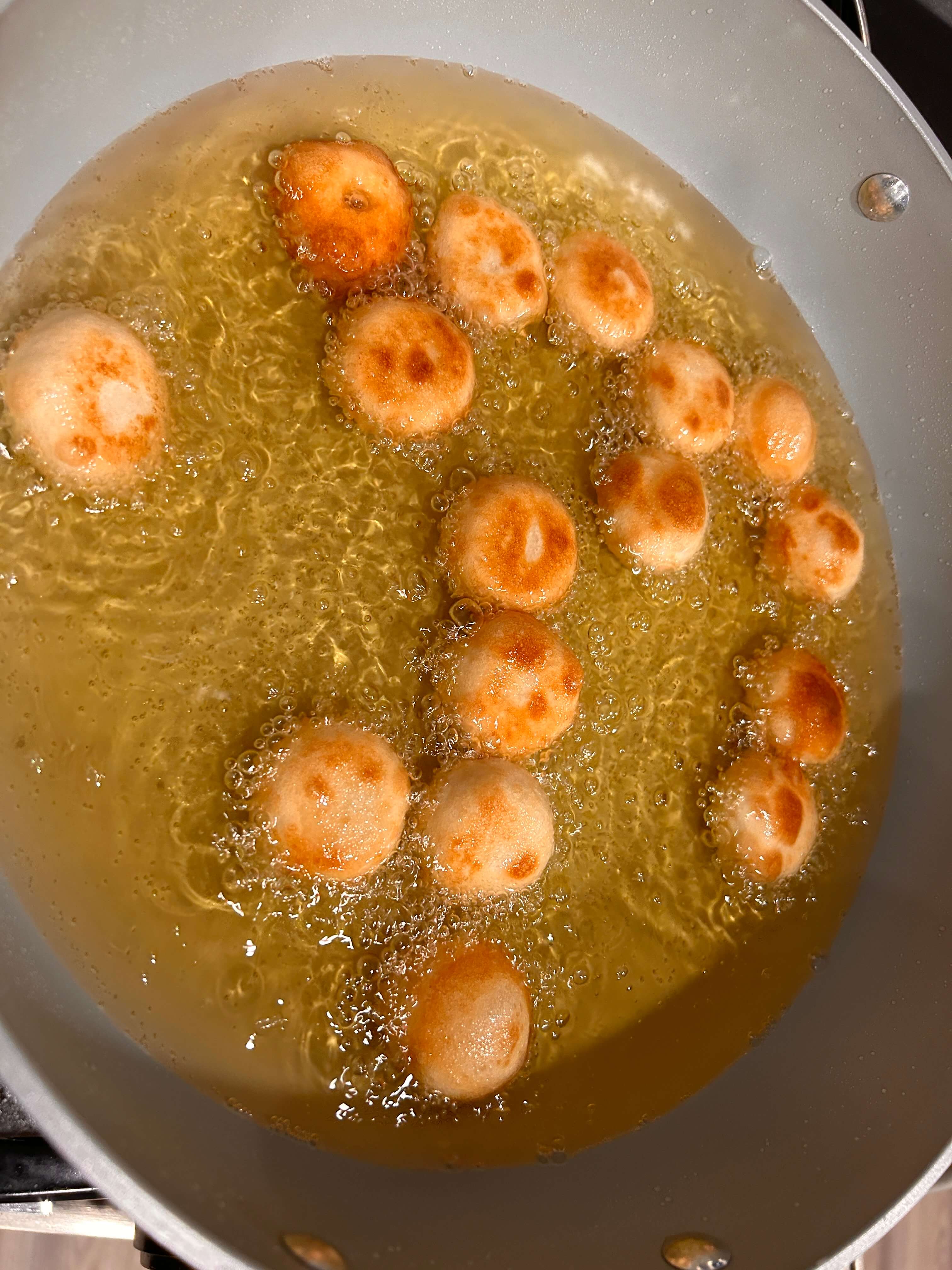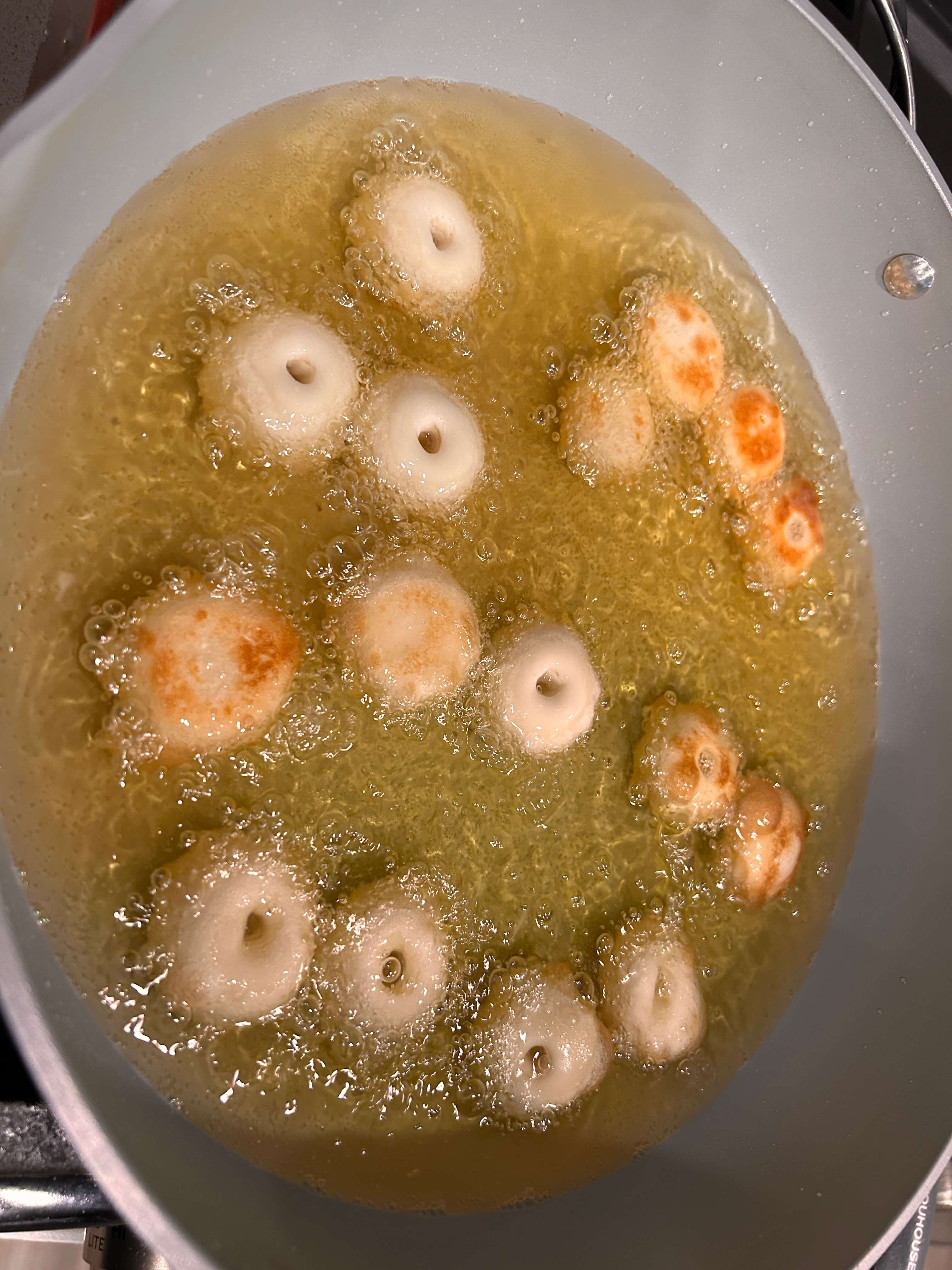 10. 달궈진 기름에 반죽을 넣어 서로 붙지 않게 노릇노릇해질 때까지 튀겨줍니다.