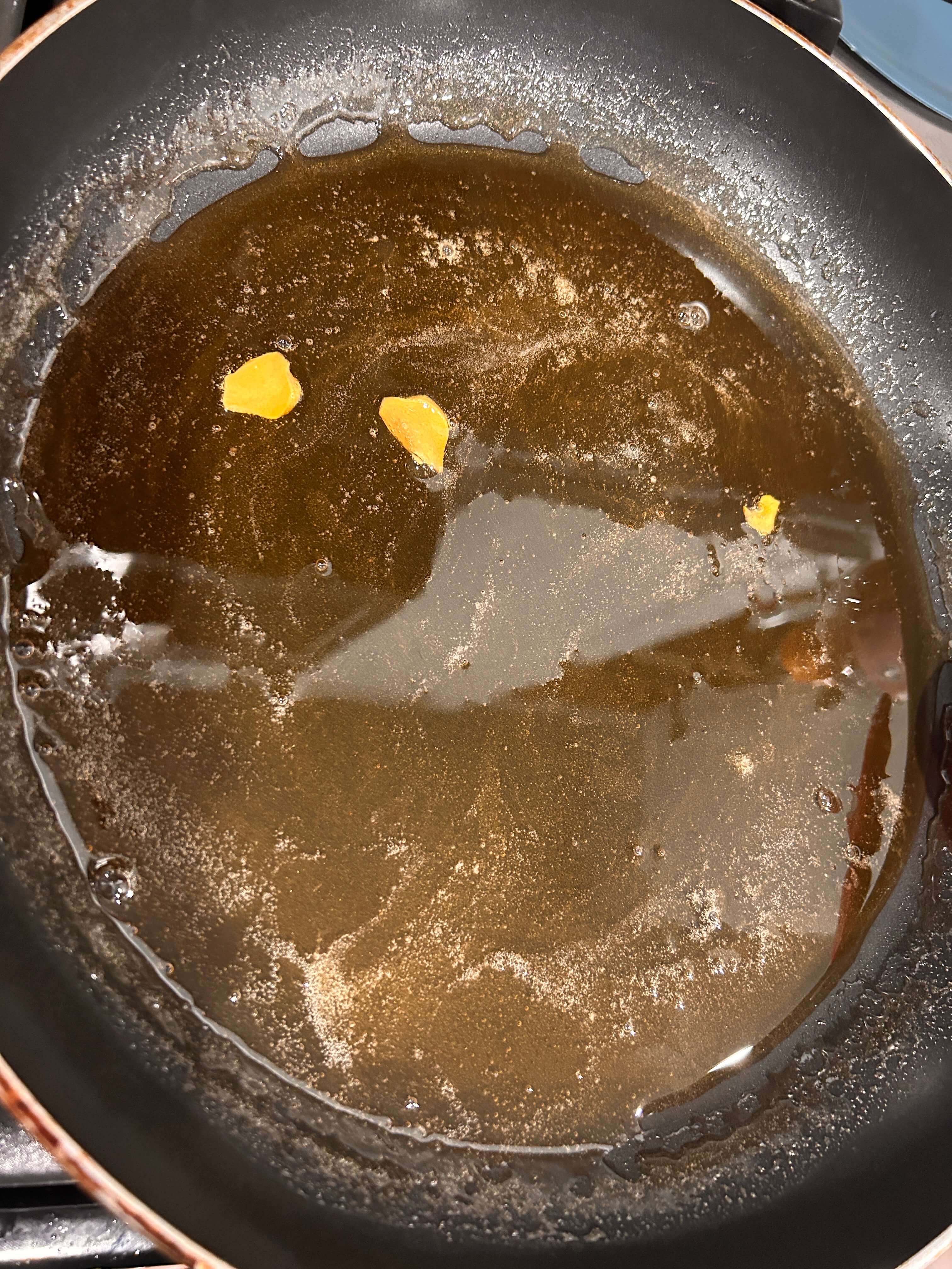 7. 반죽이 숙성될 동안 팬에 물, 조청, 생강 그리고 시나몬 가루를 넣고 약불에서 잘 끓여줍니다.