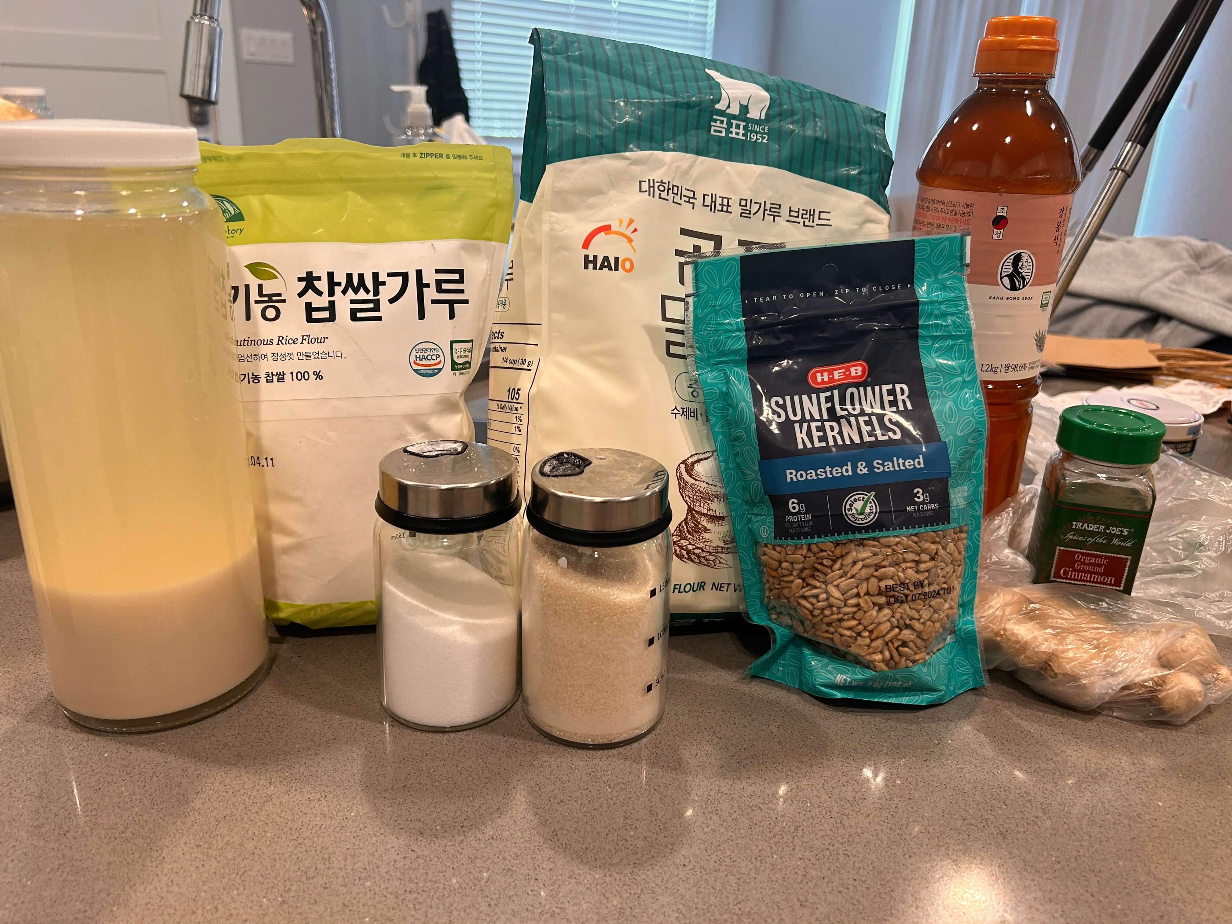 1. 찹쌀가루, 밀가루, 막걸리, 소금, 설탕, 조청, 시나몬가루, 해바라기씨, 생강을 준비해 줍니다.