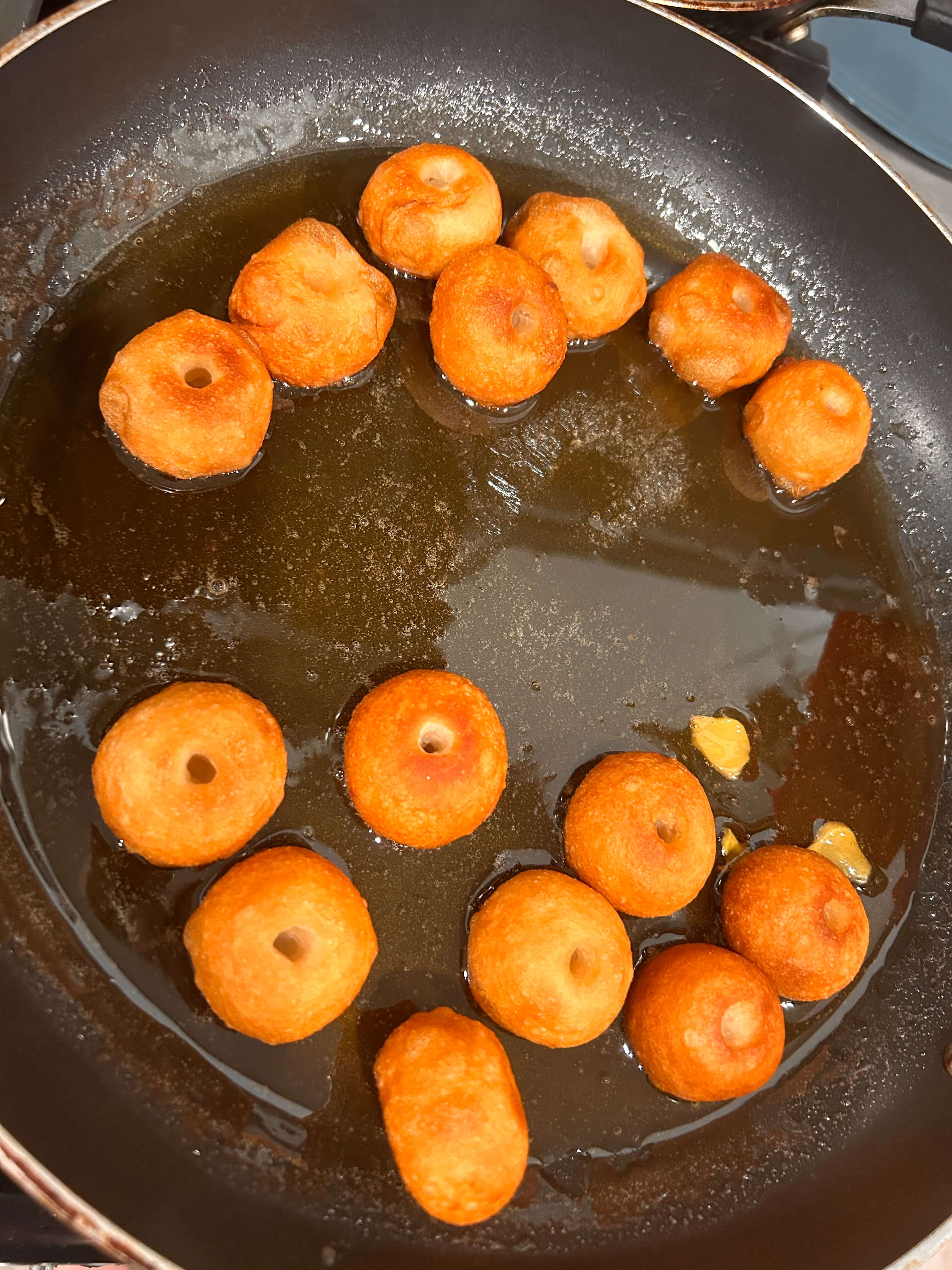 10. 달궈진 기름에 반죽을 넣어 서로 붙지 않게 노릇노릇해질 때까지 튀겨줍니다.