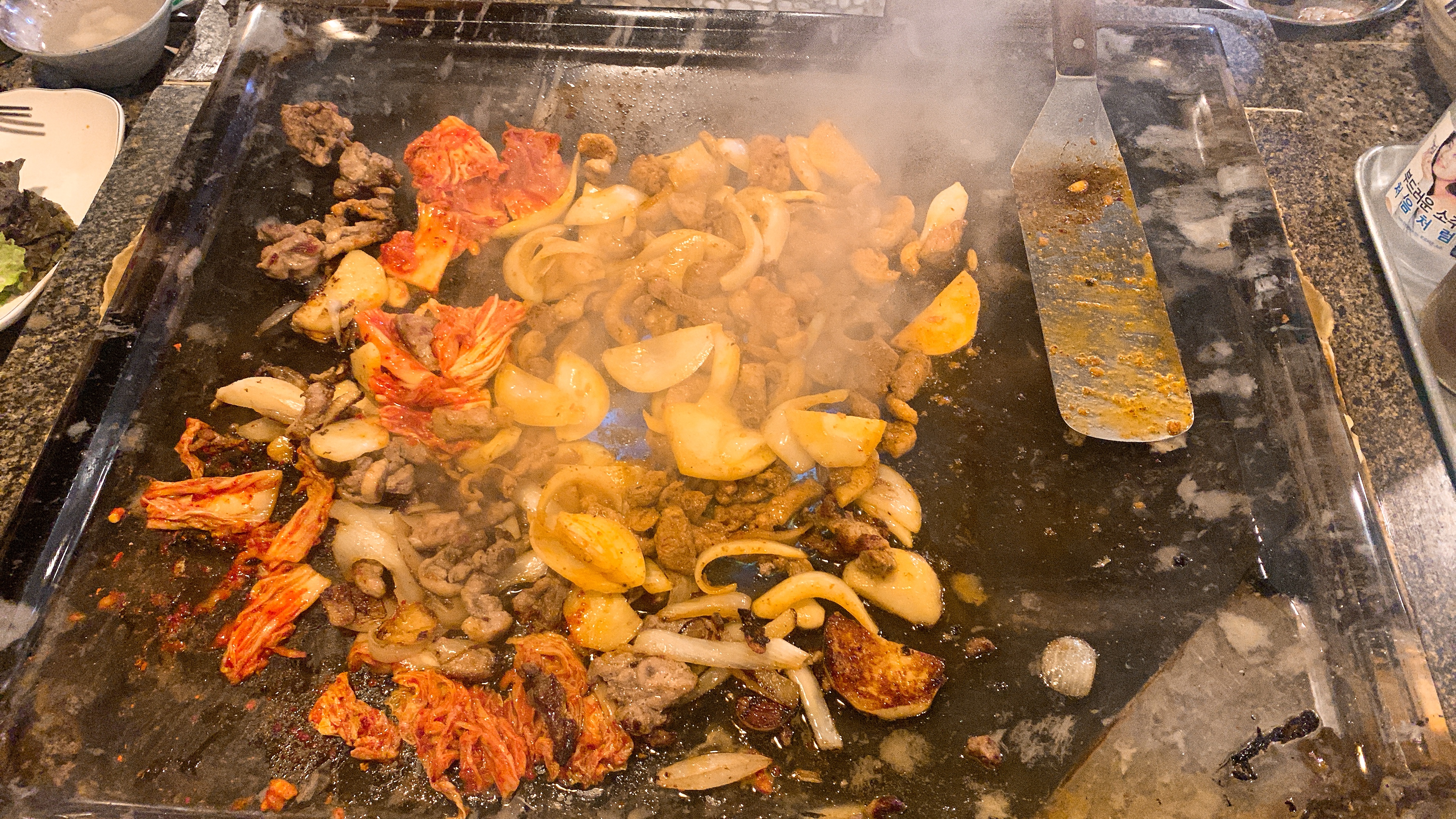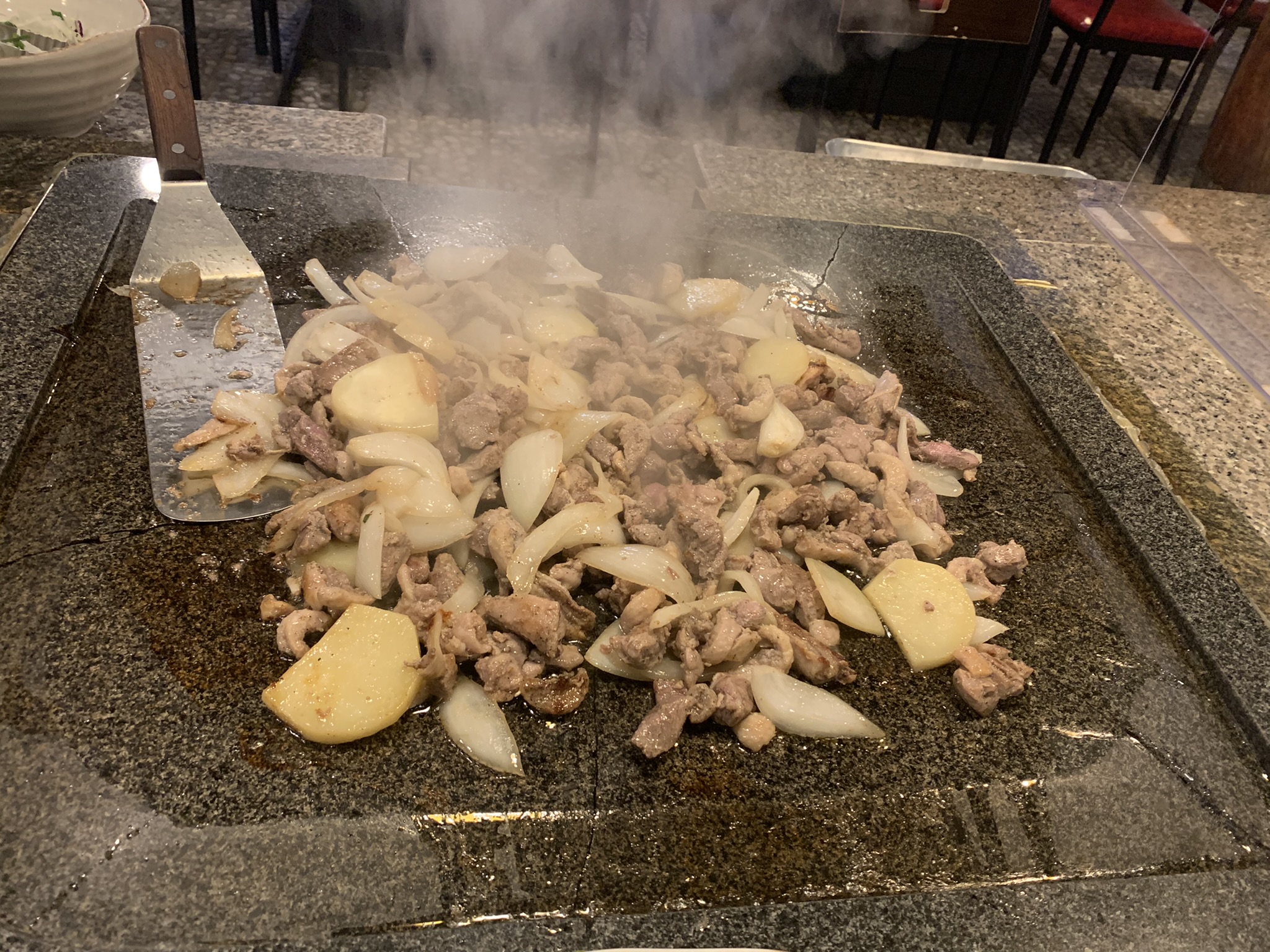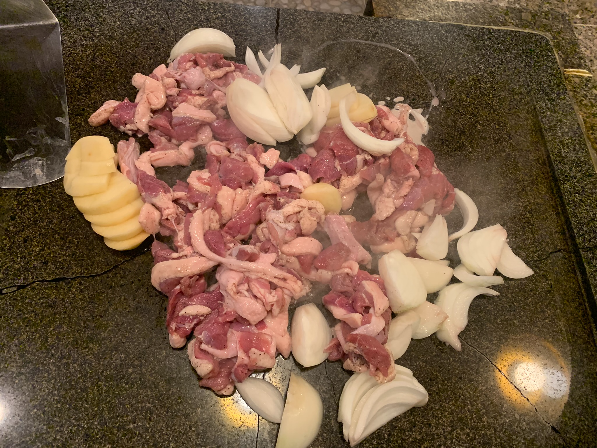 돌판에서 오리고기와 감자 양파가 잘 익어갑니다.