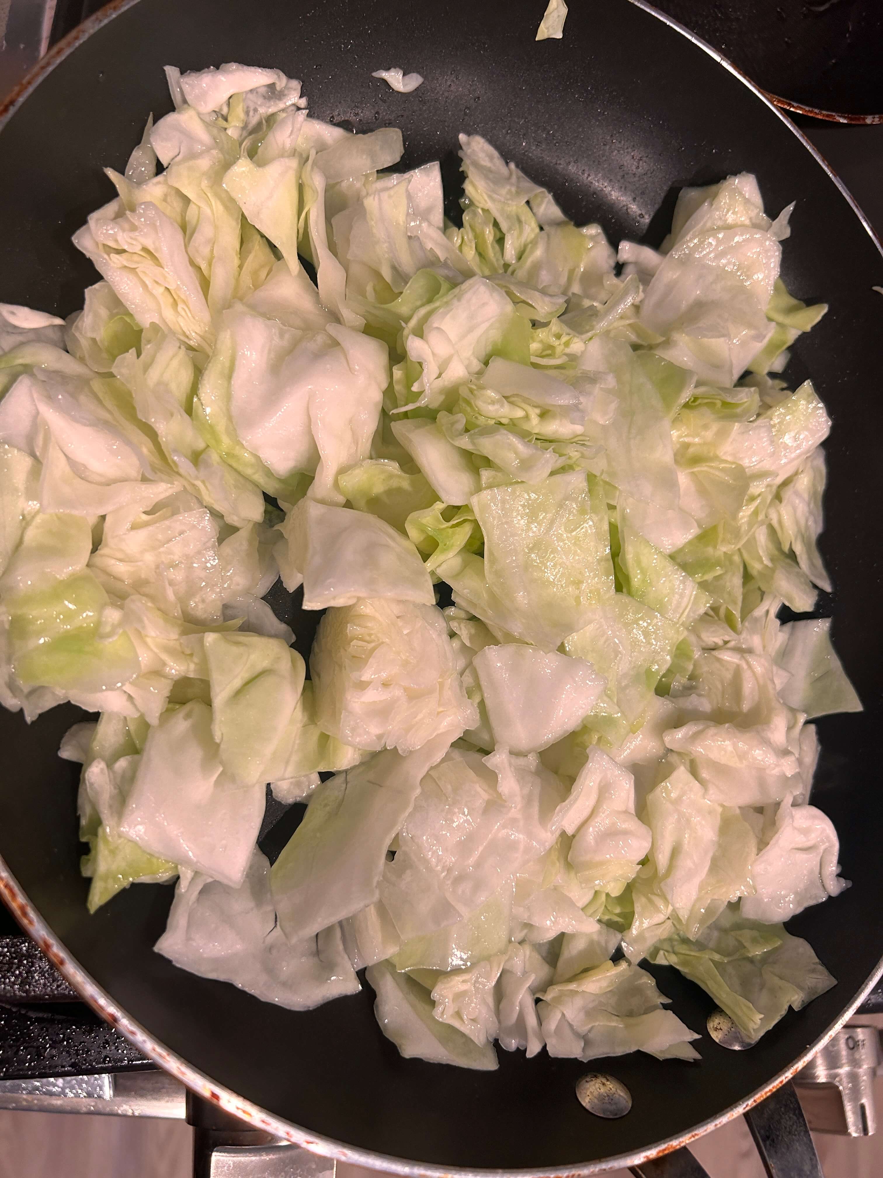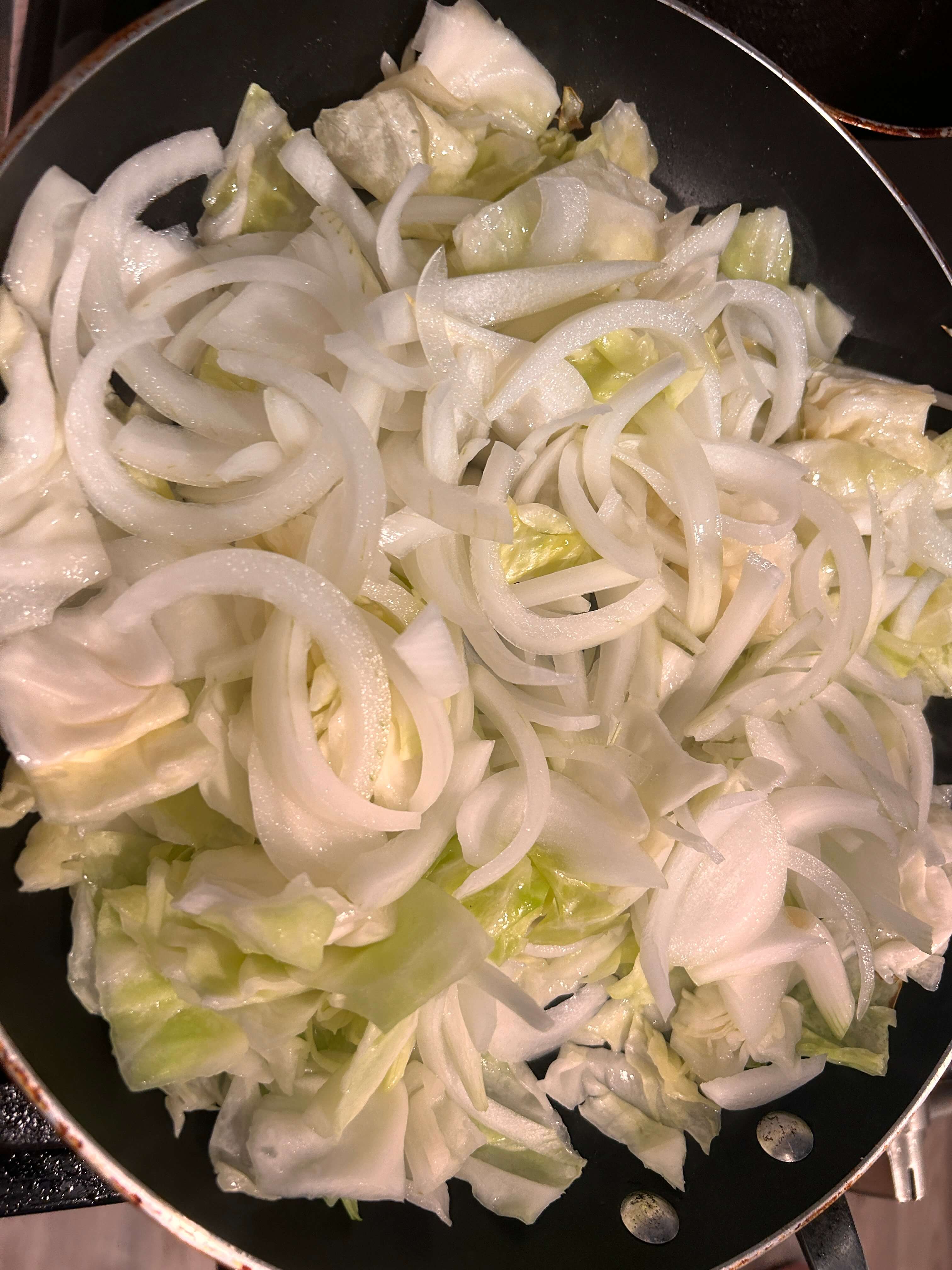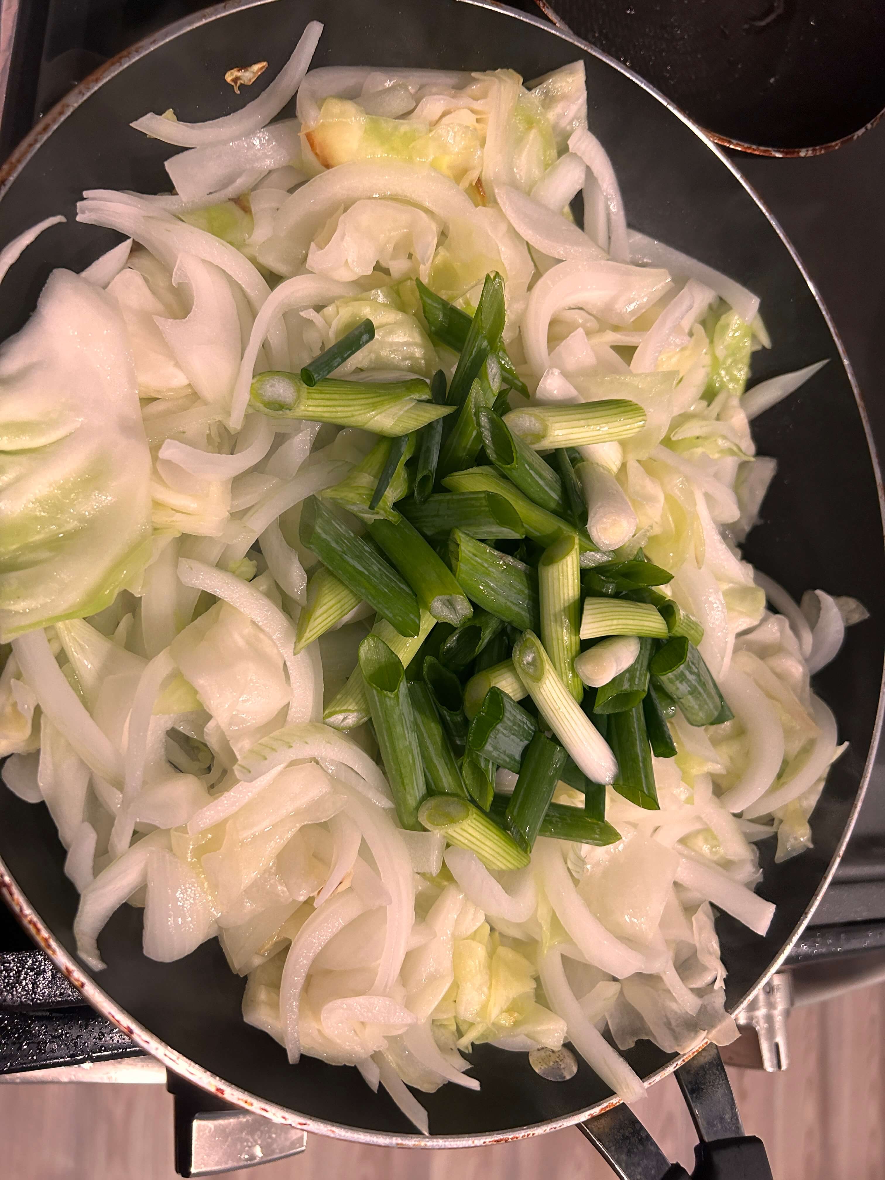 2. 팬에 기름을 두르고 양배추, 양파, 파를 넣어 숨이 죽을 때까지 볶아줍니다.