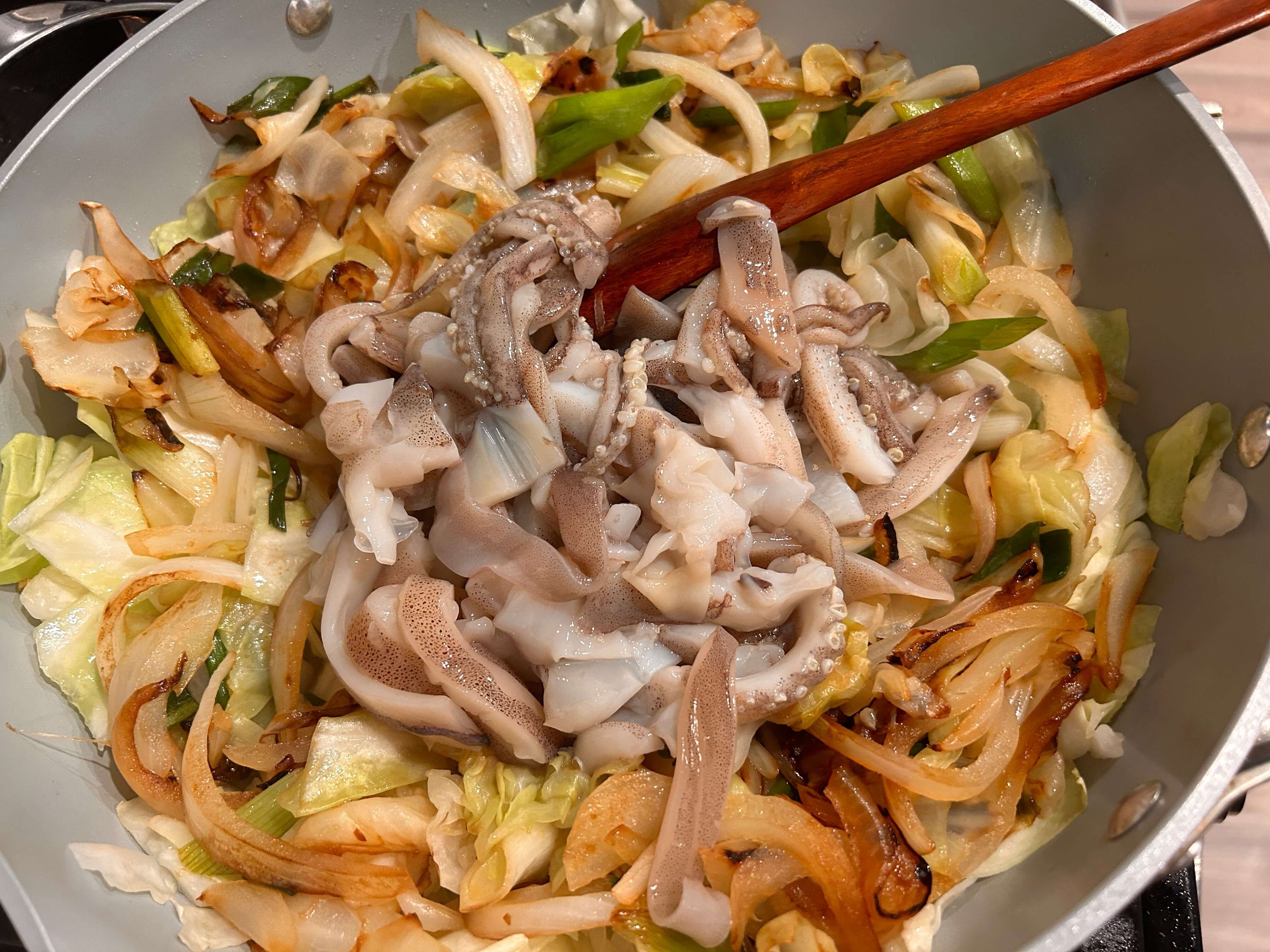 4. 잘 볶아진 야채위로 오징어를 넣어줍니다.