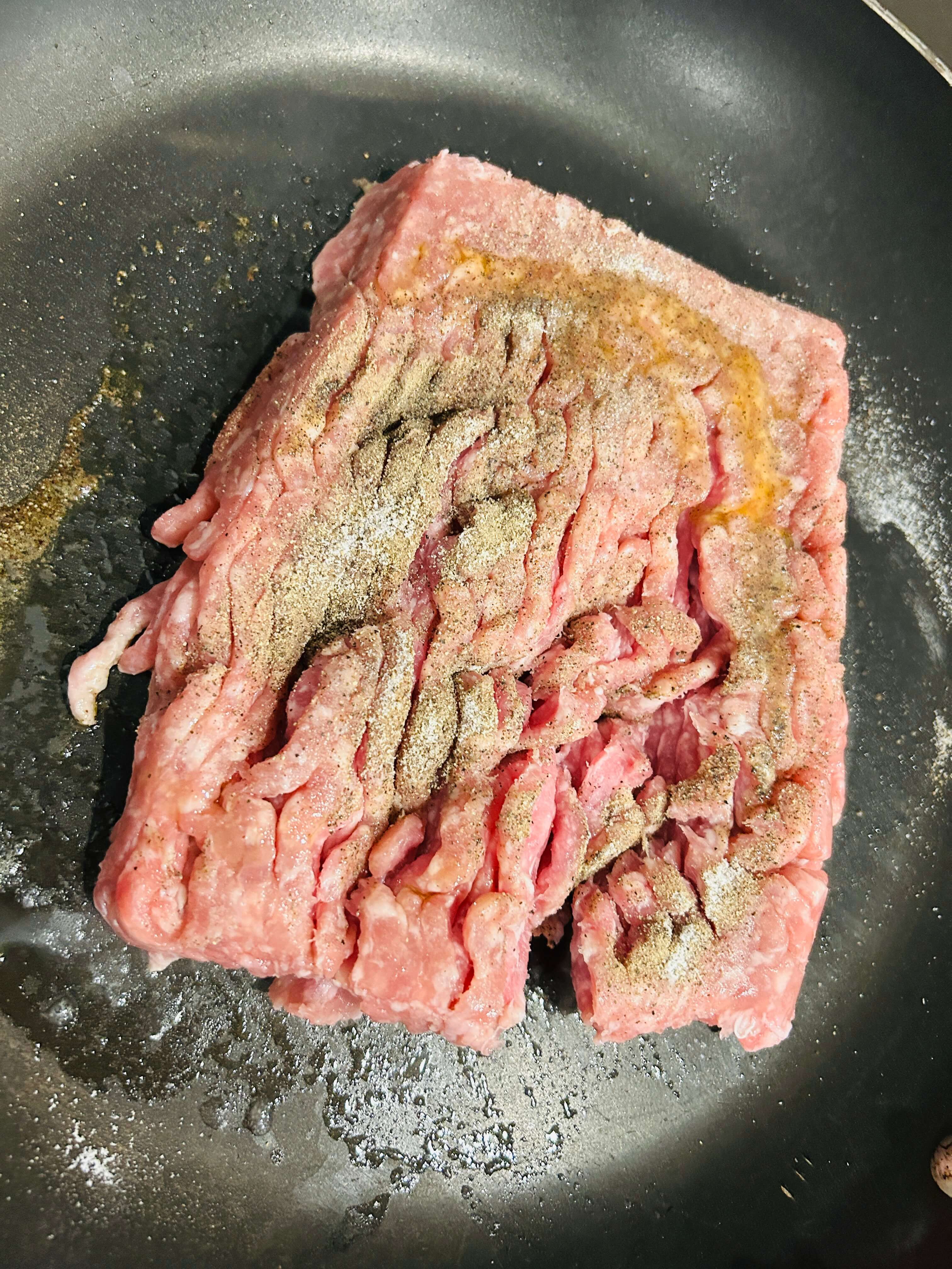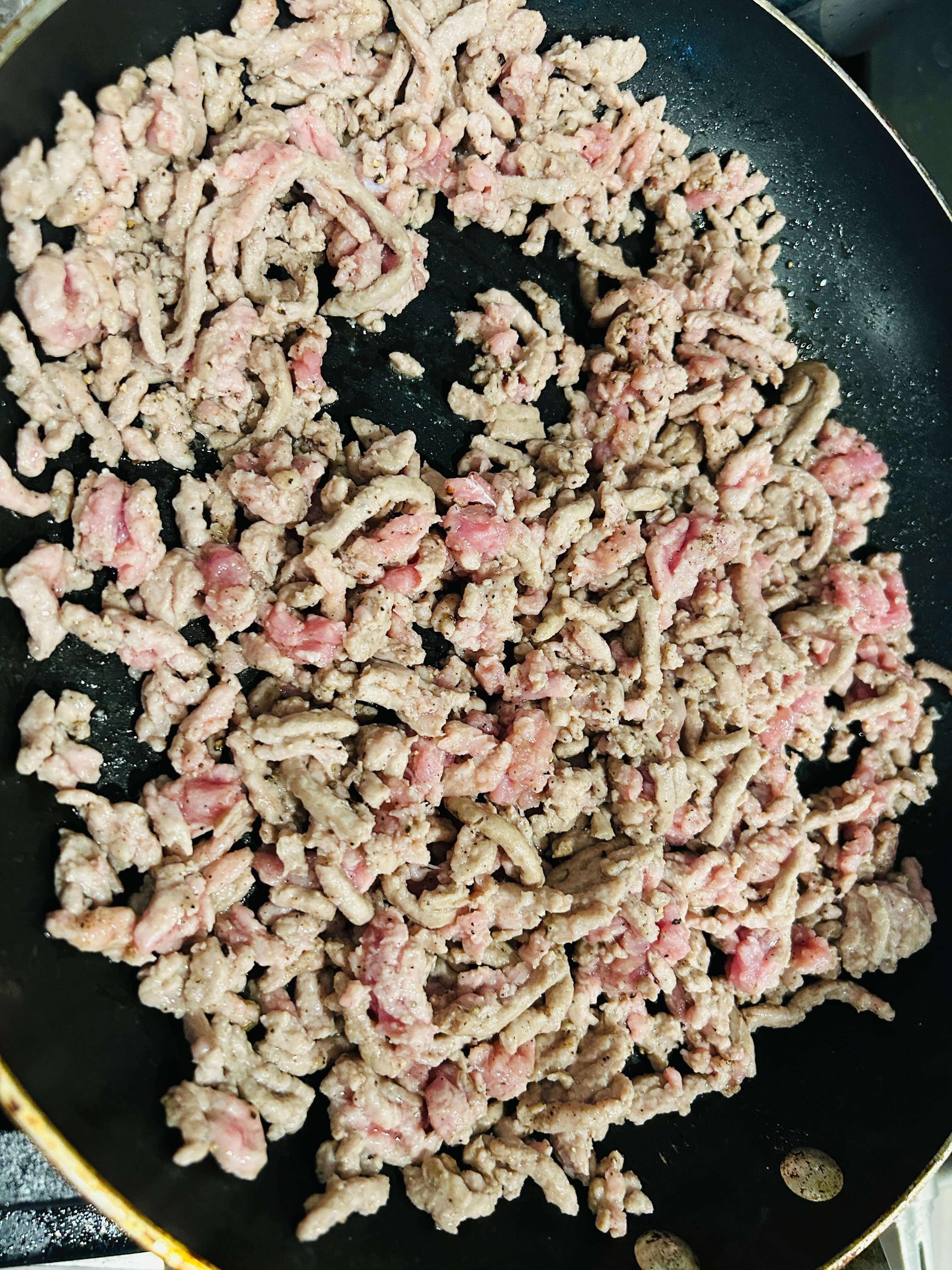 6. 간 돼지고기는 프라이팬에 올려 올리브유를 둘러줍니다.