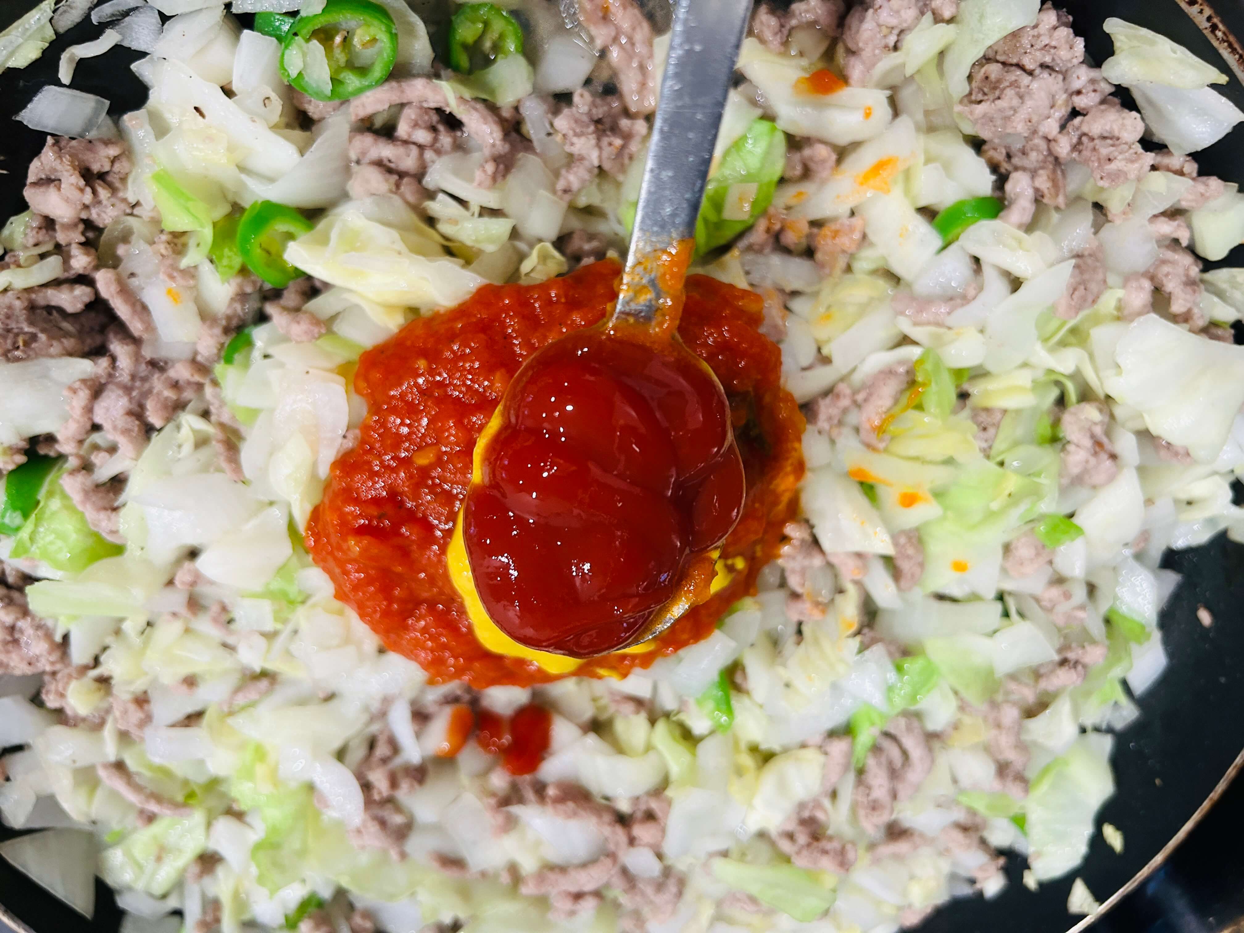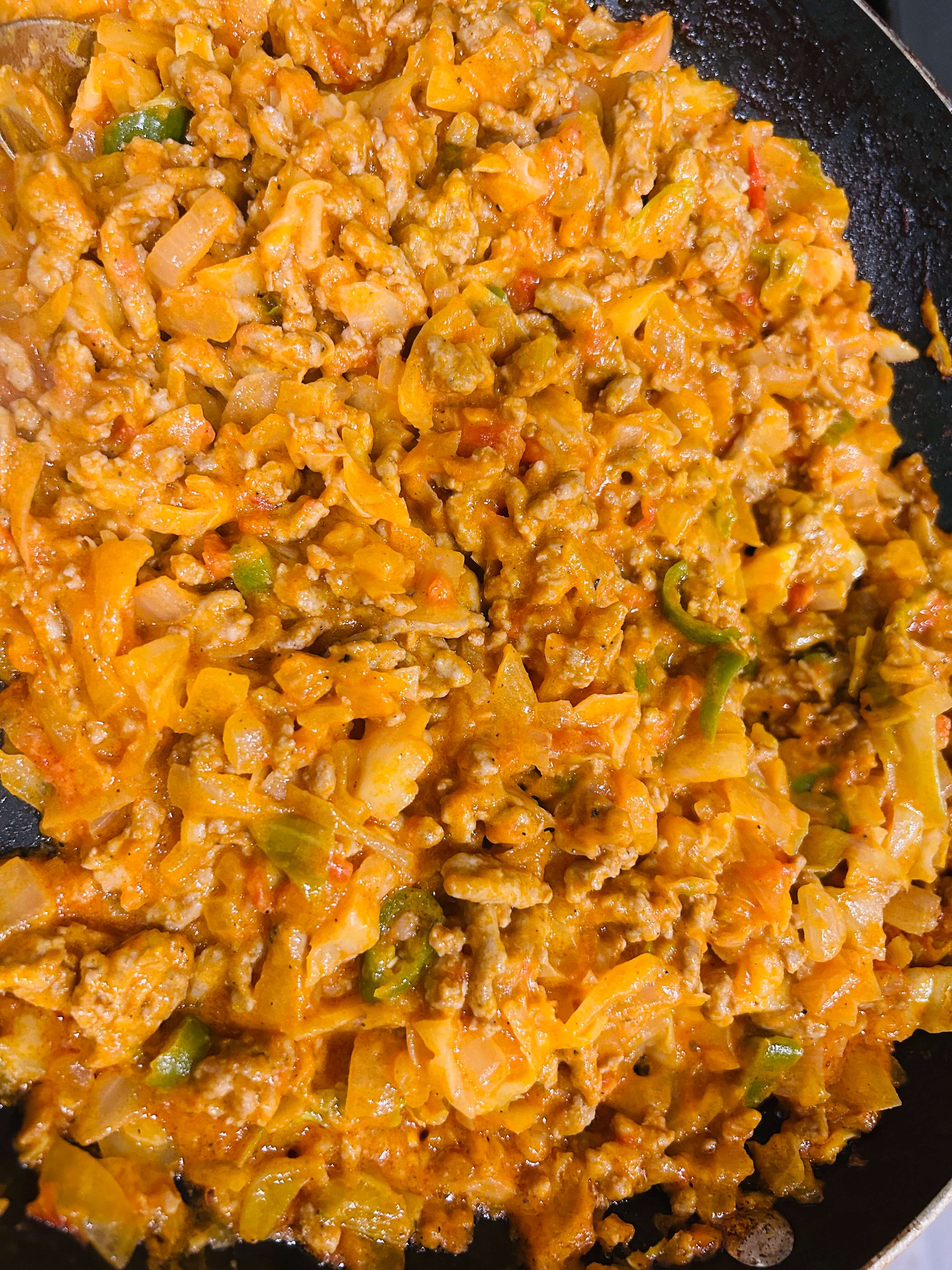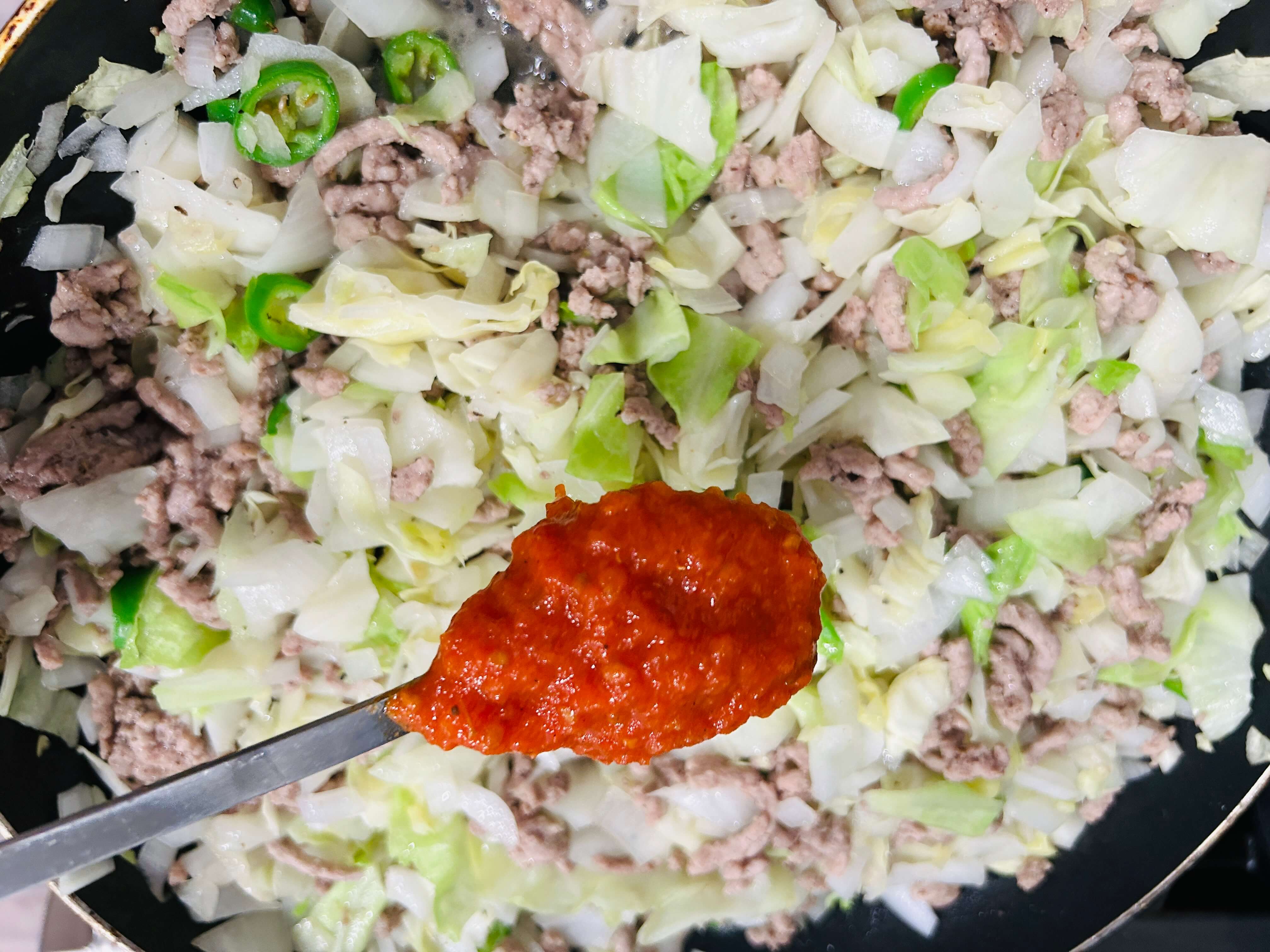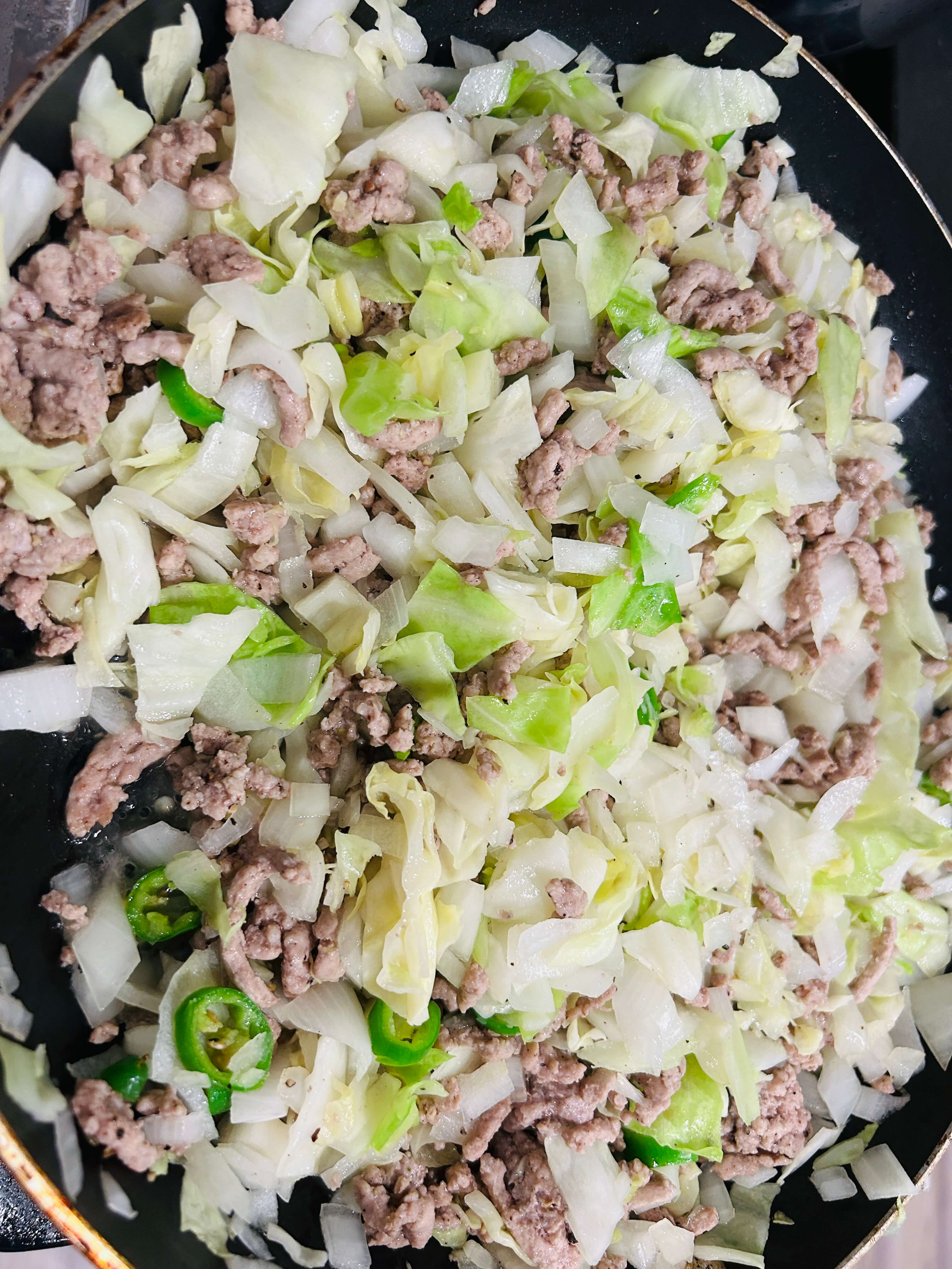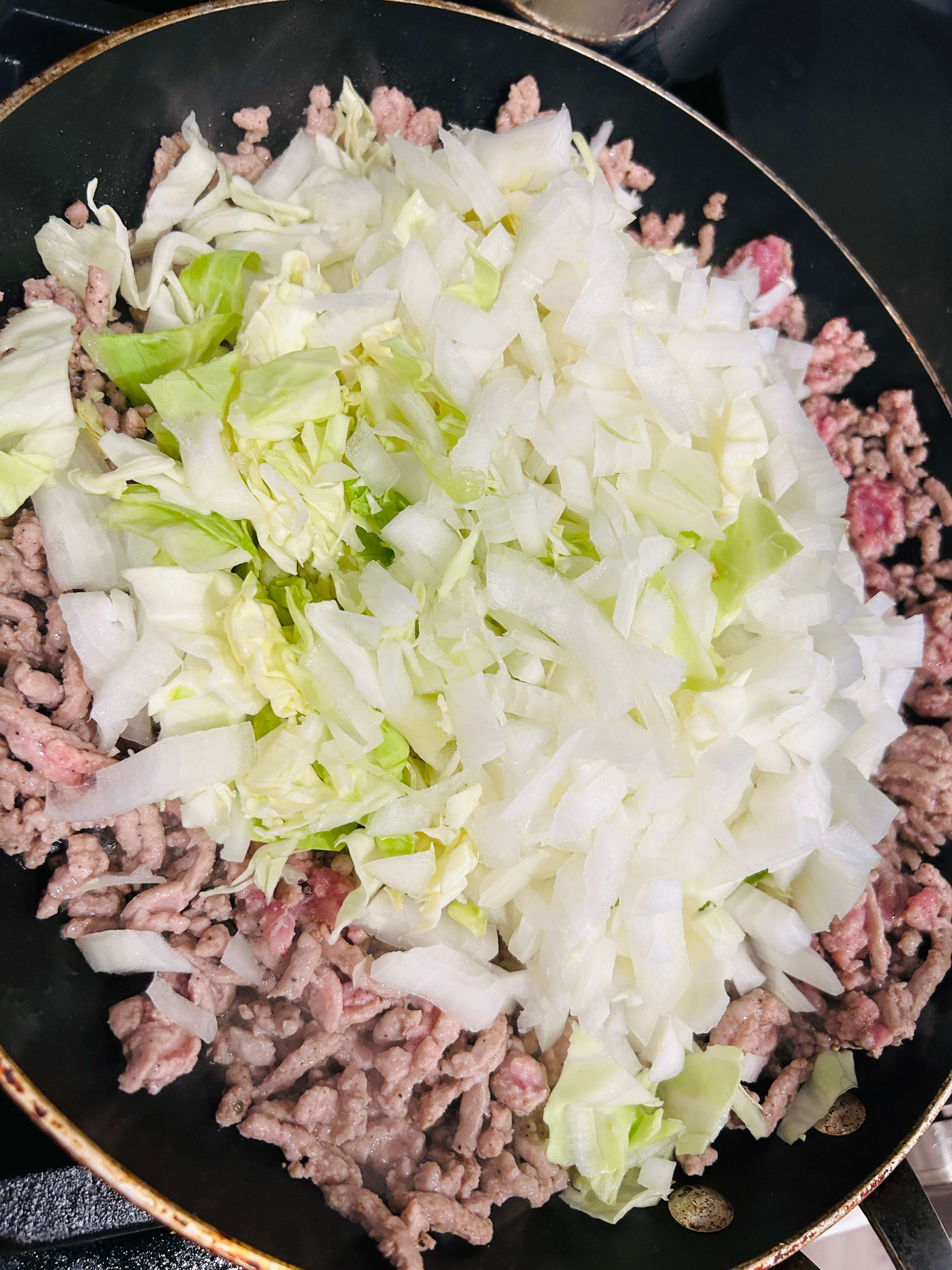 8. 간 돼지고기가 익어갈 때쯤 준비된 야채를 모두 넣어줍니다.