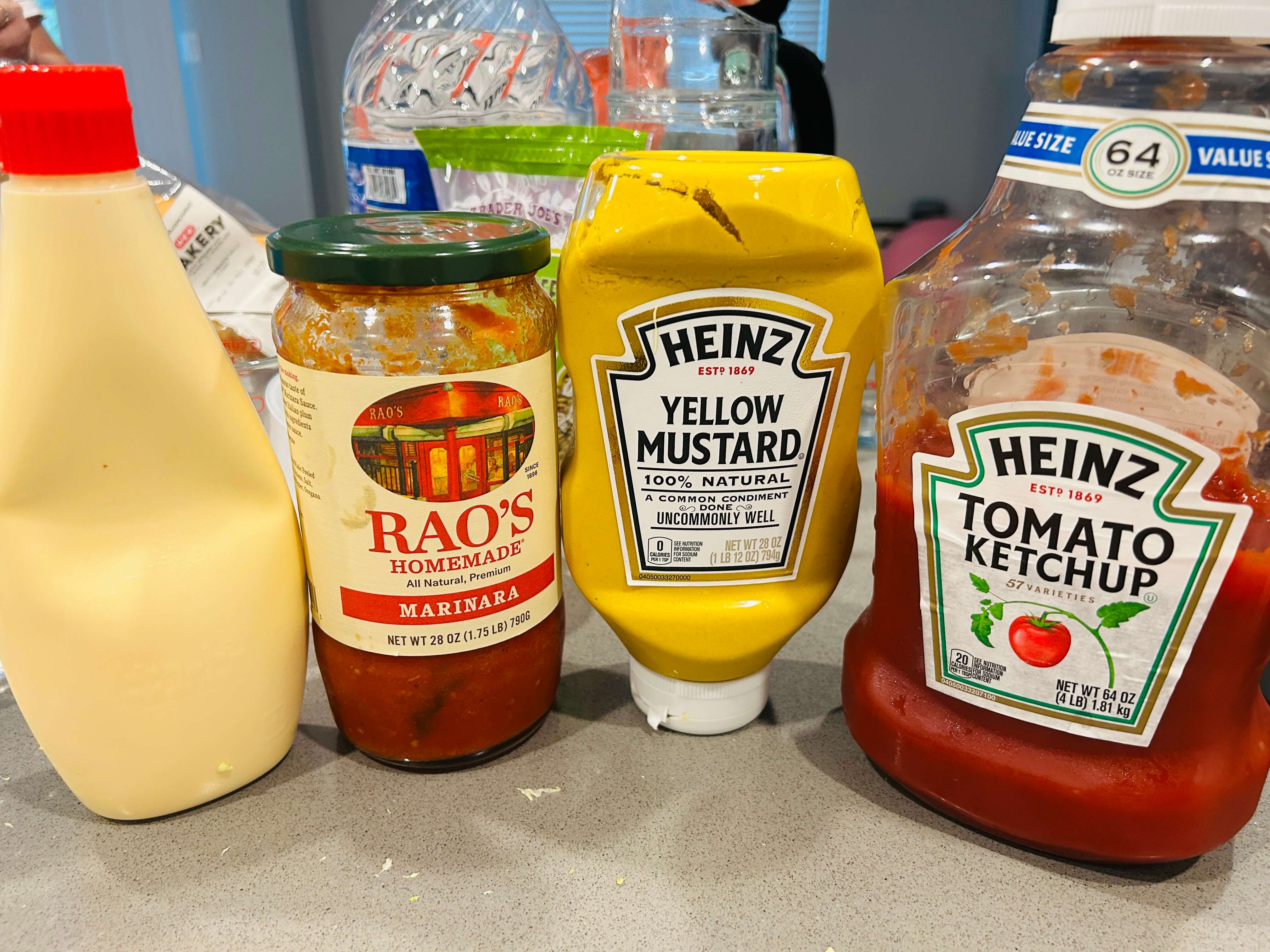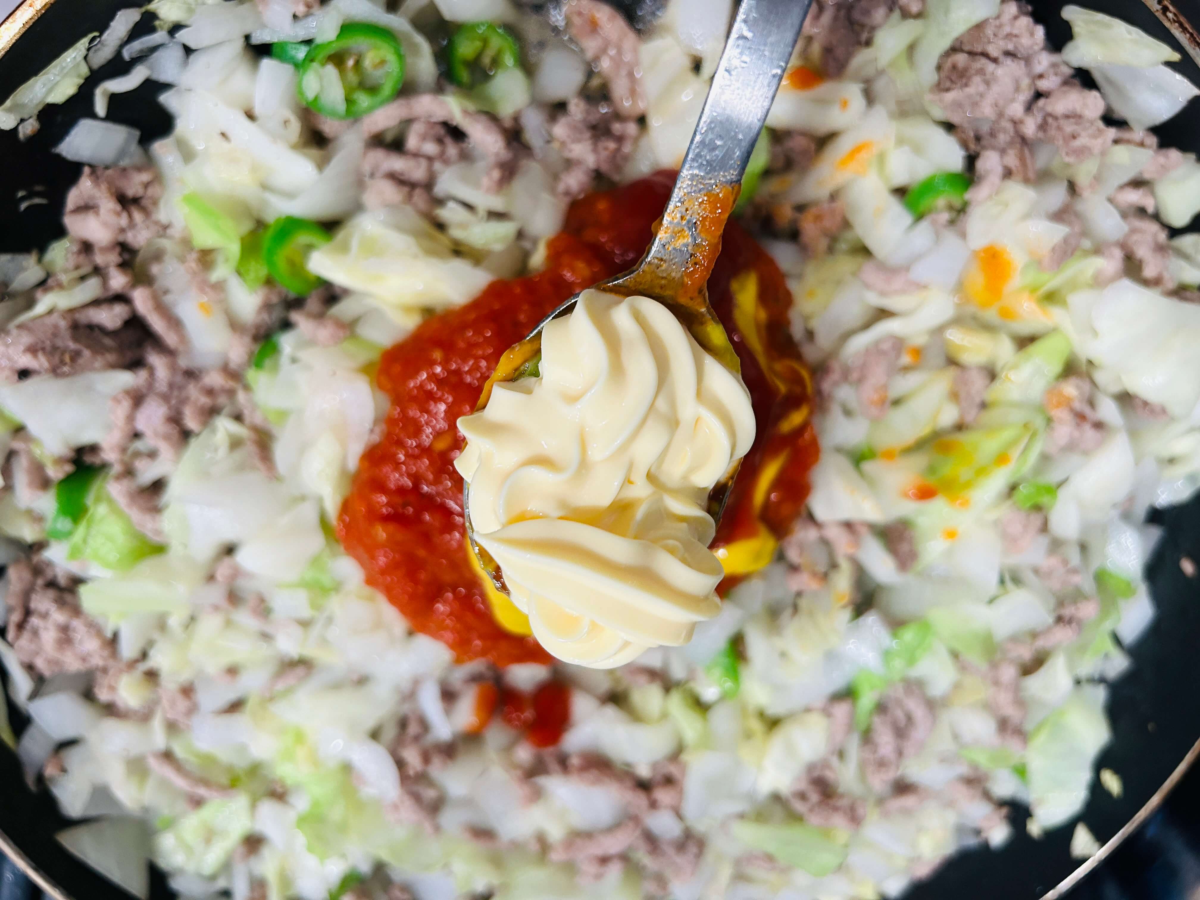 10. 토마토소스 10 숟갈, 토마토소스 3 숟갈, 머스터드소스 3 숟갈, 마요네즈 1 숟갈을 넣고 섞어줍니다.