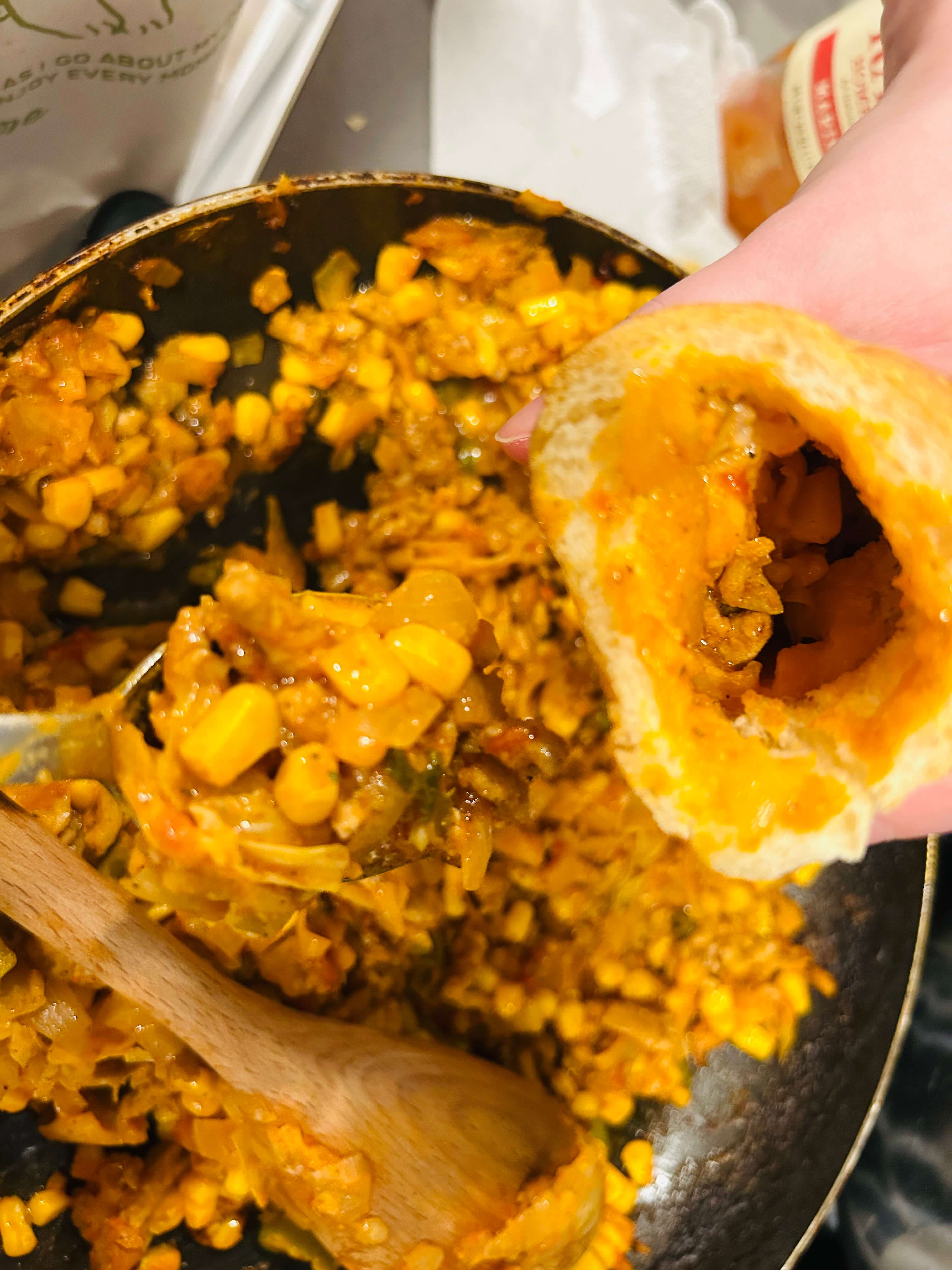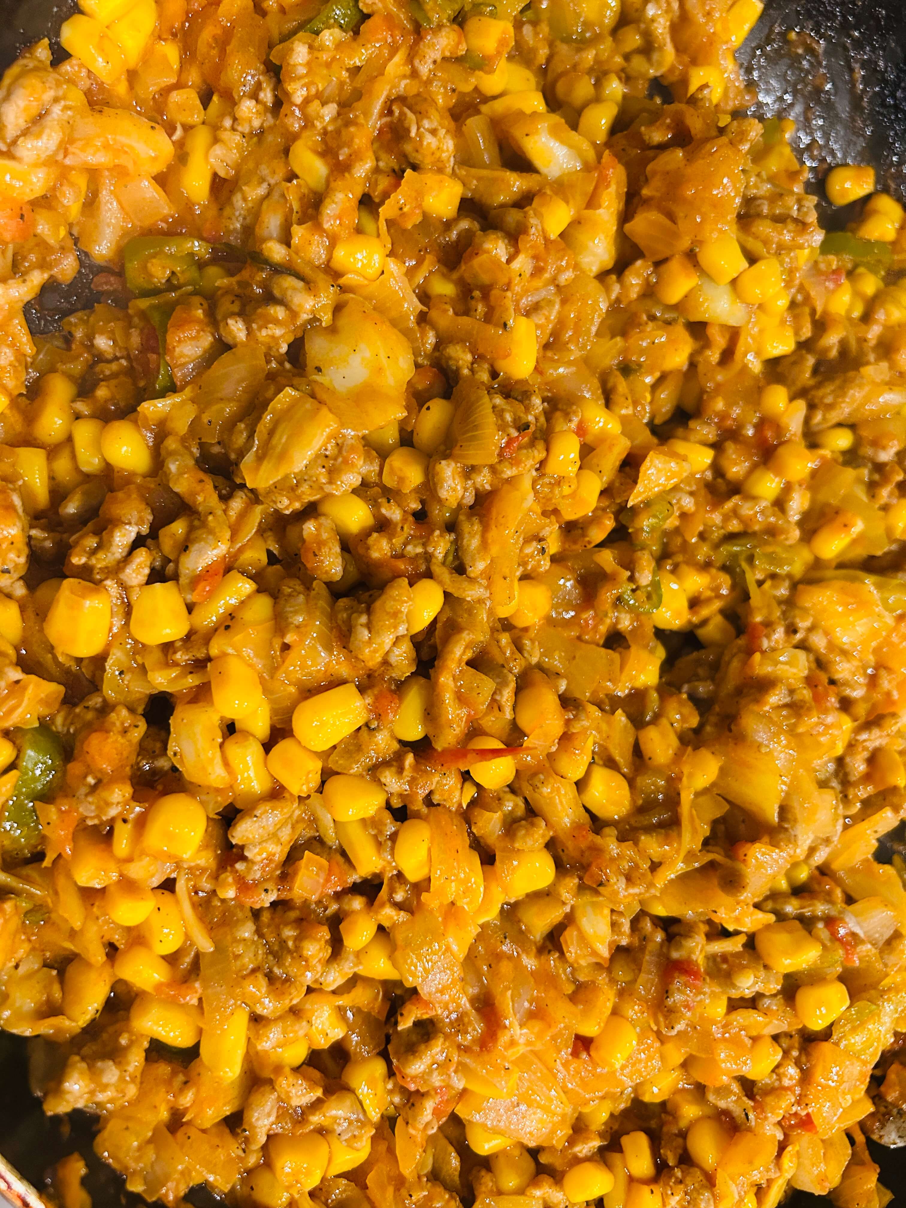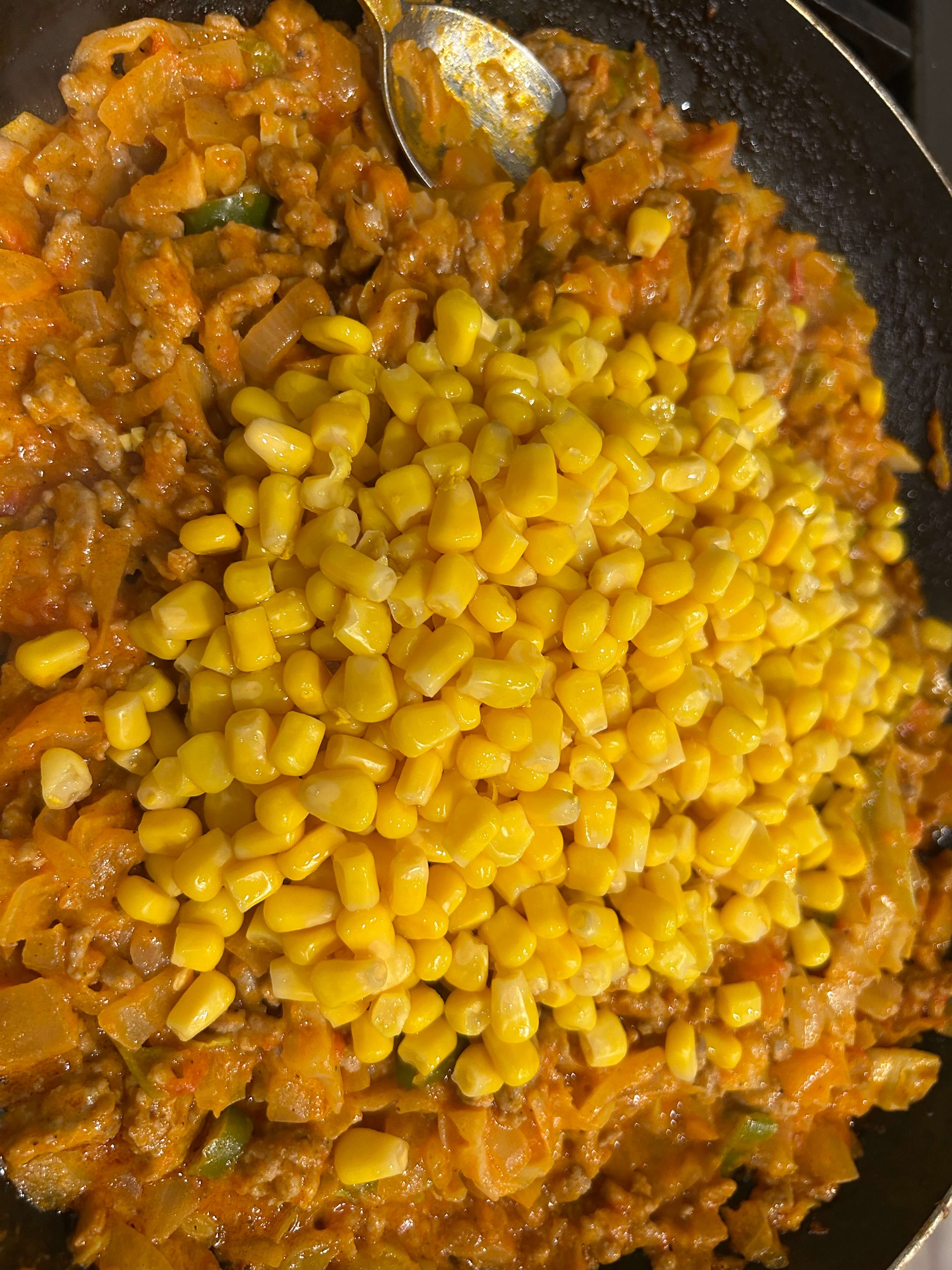 11. 양념에 잘 볶아진 속재료에 콘옥수수를 추가해 한번 더 볶아줍니다.