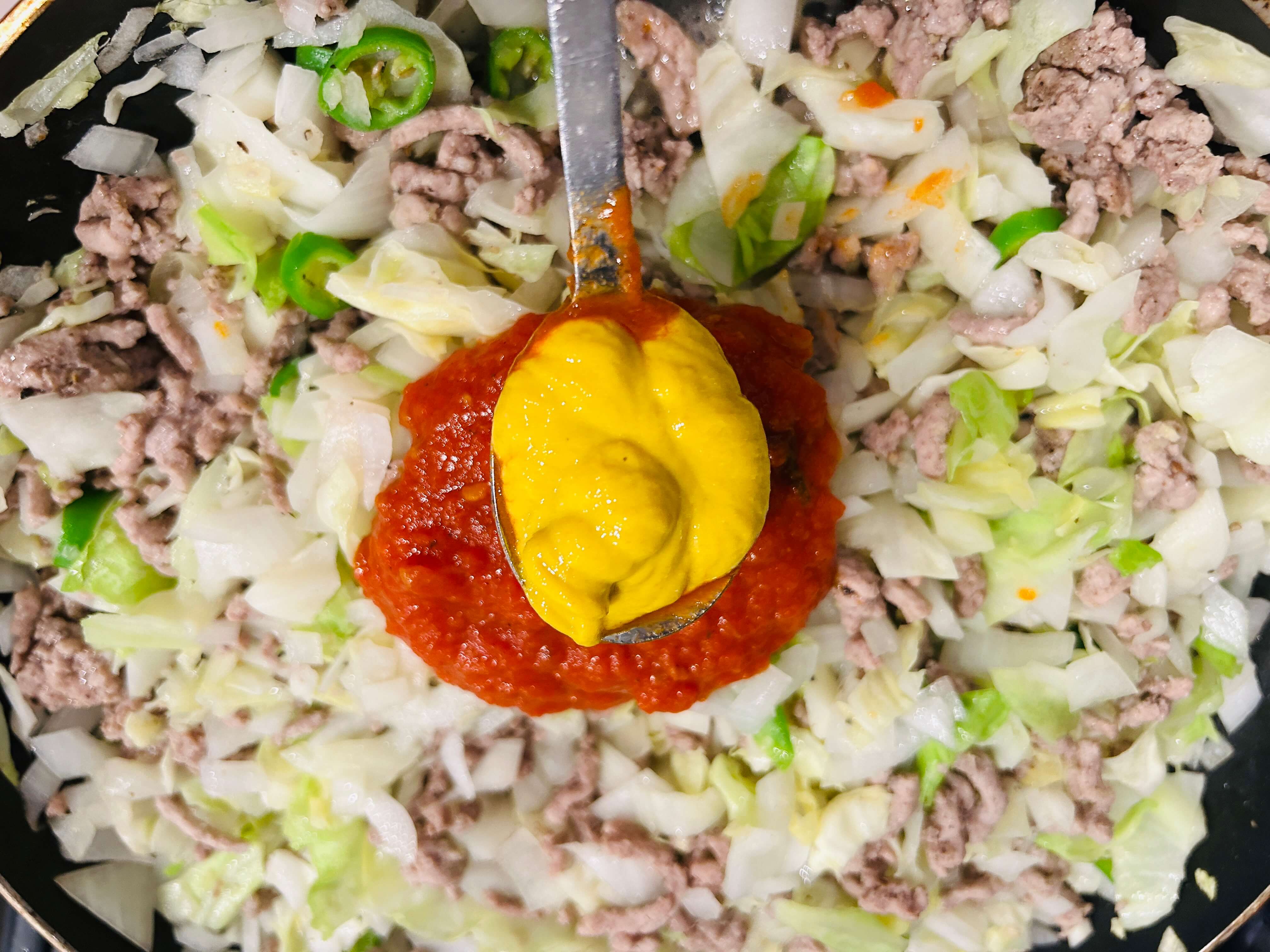 10. 토마토소스 10 숟갈, 토마토소스 3 숟갈, 머스터드소스 3 숟갈, 마요네즈 1 숟갈을 넣고 섞어줍니다.
