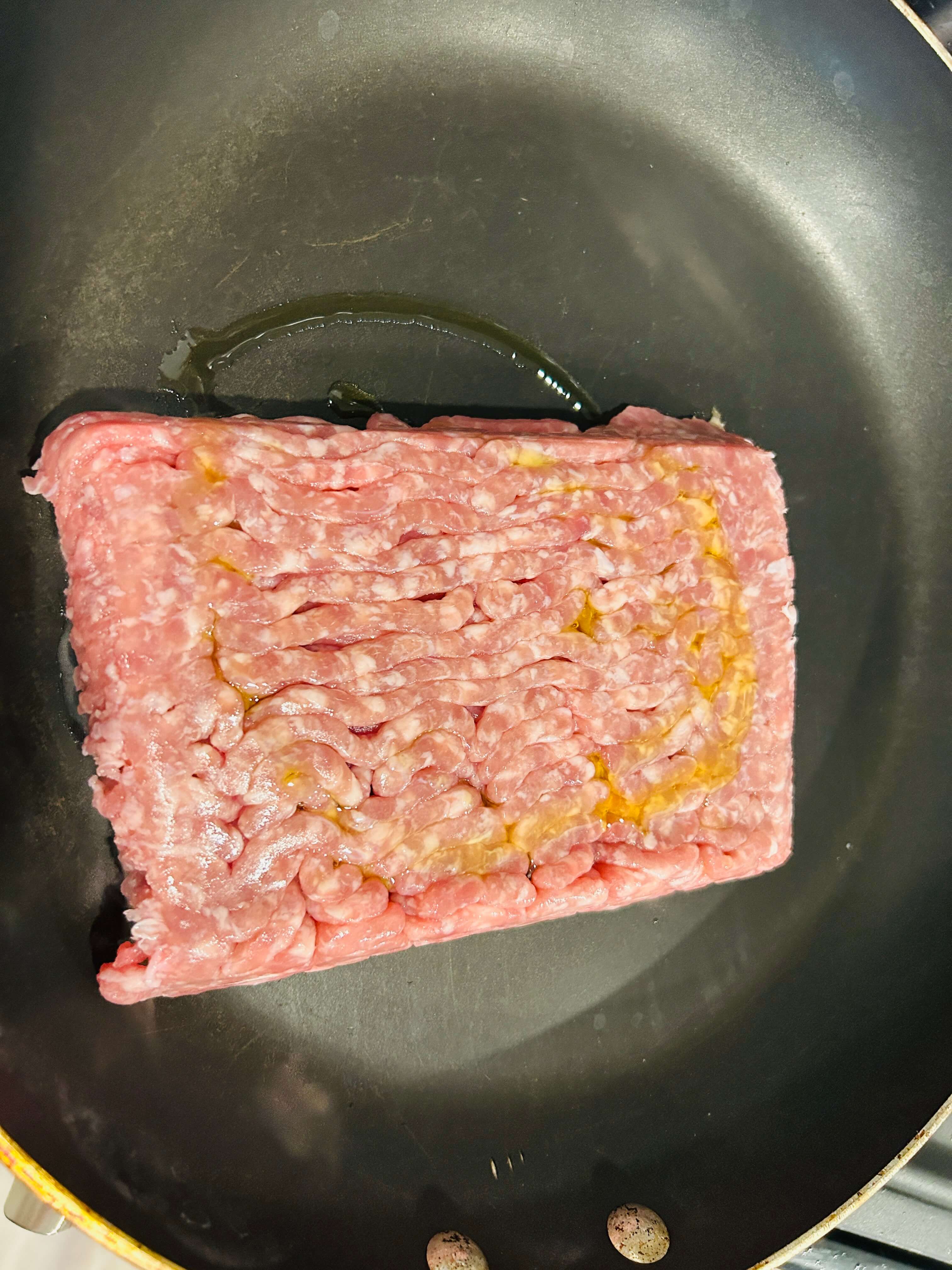 6. 간 돼지고기는 프라이팬에 올려 올리브유를 둘러줍니다.