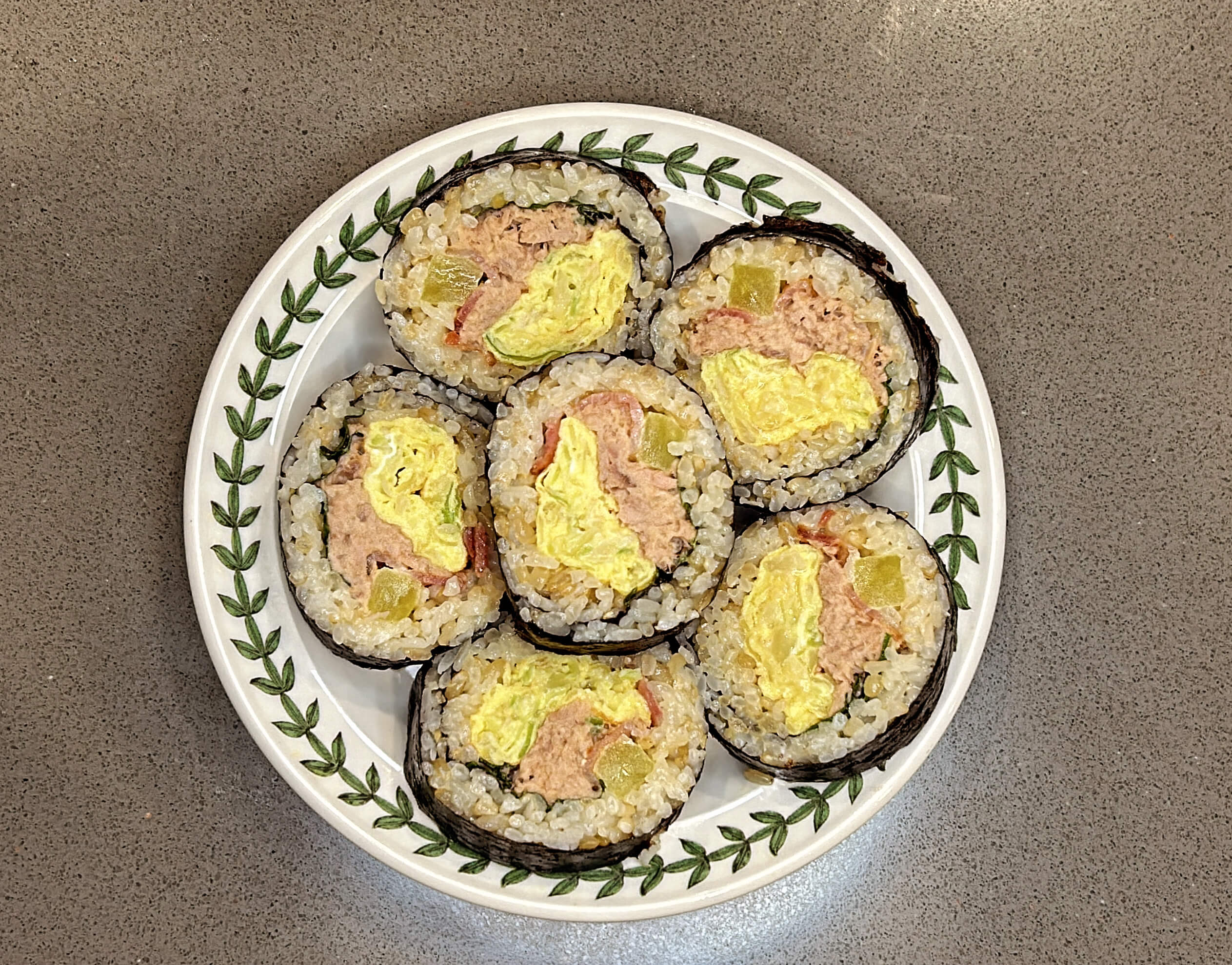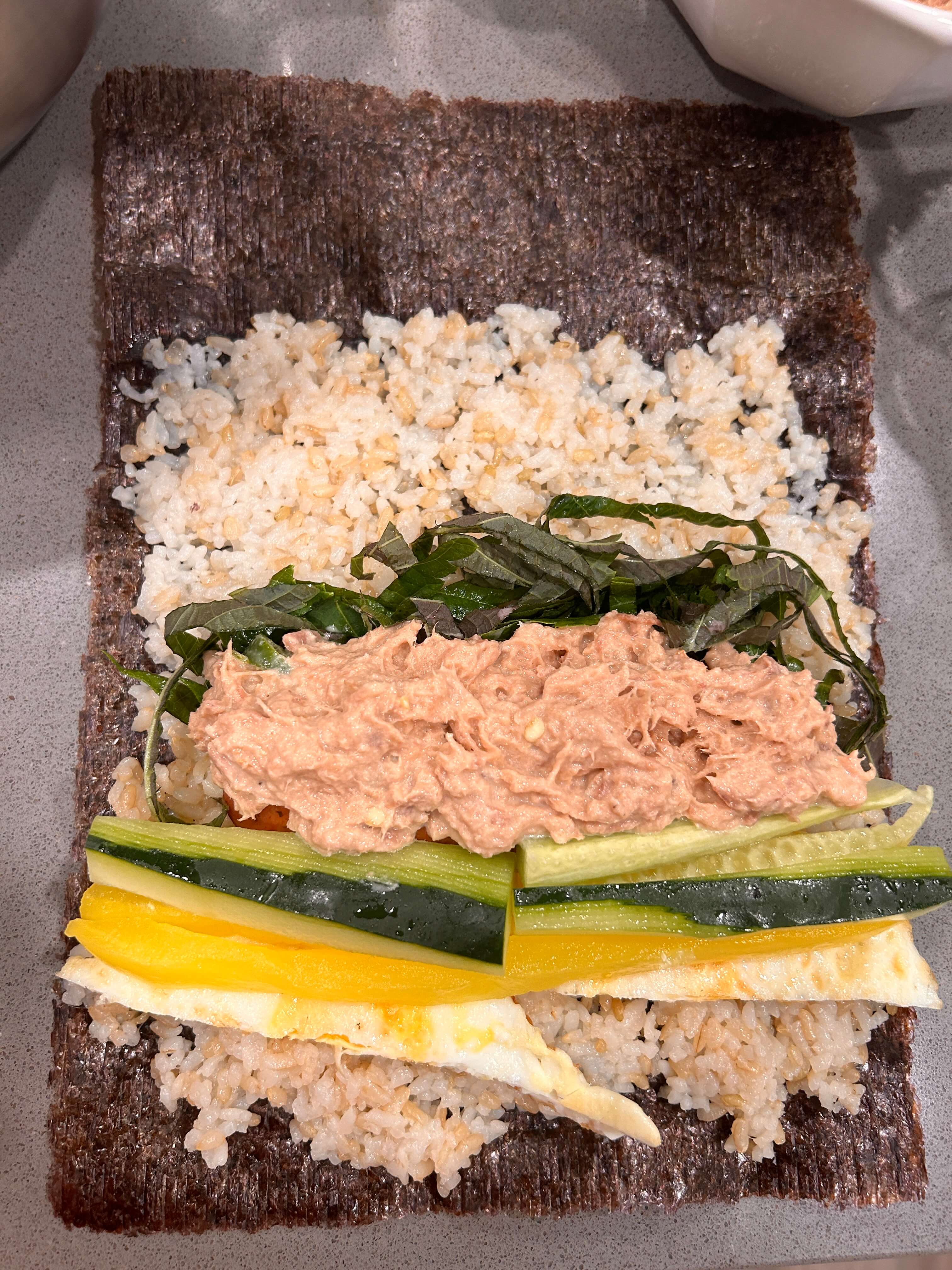 오른쪽 그릇에 담긴 김밥은 계란에 양배추를 넣고 만들었고, 참치, 단무지, 깻잎, 베이컨이 들어가 있습니다. 큰 재료들이 들어가지 않아 참치가 더 도드라져 보입니다.