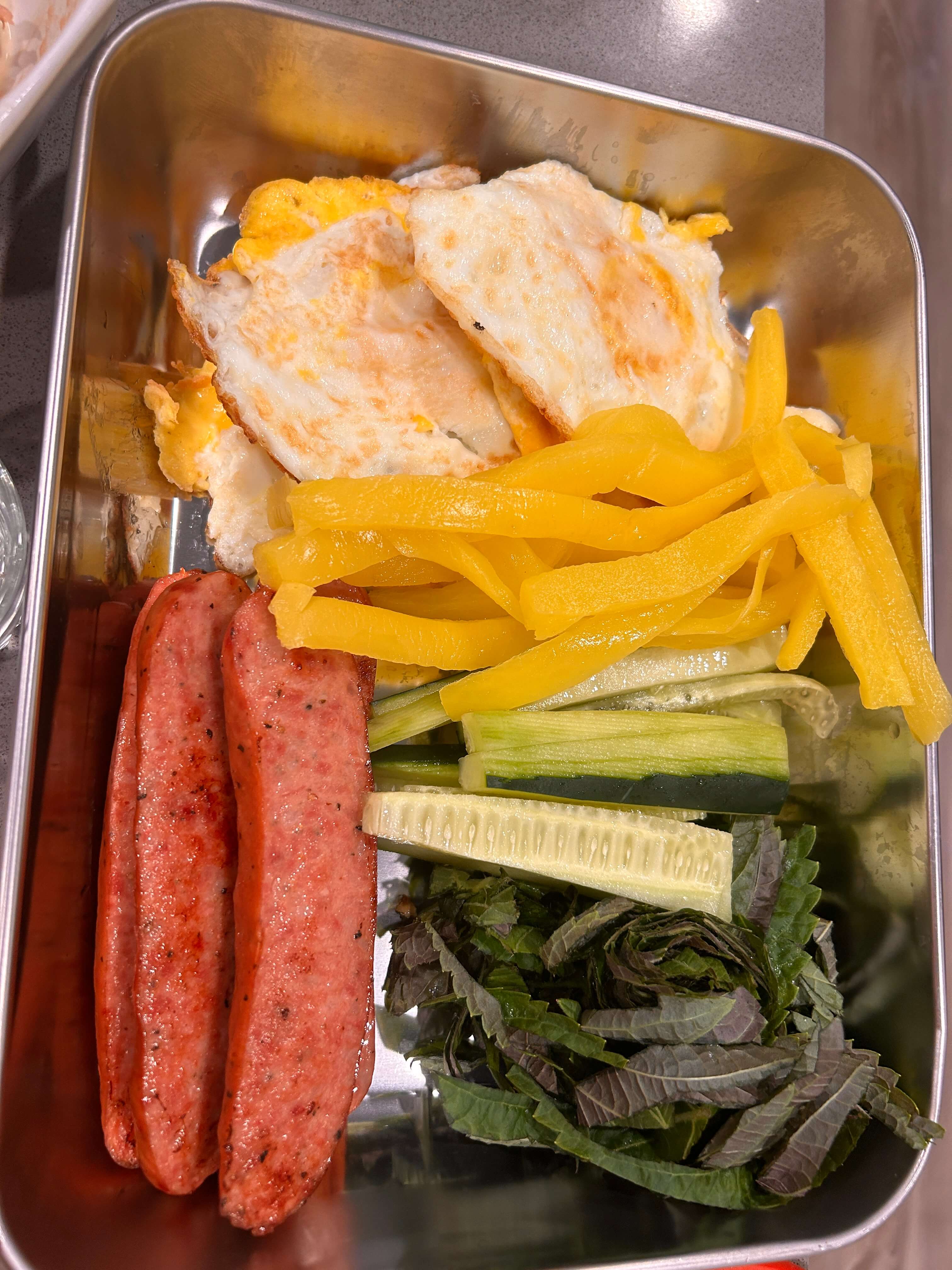 10. 소시지 하나와 오이 깻잎을 넣어줍니다.