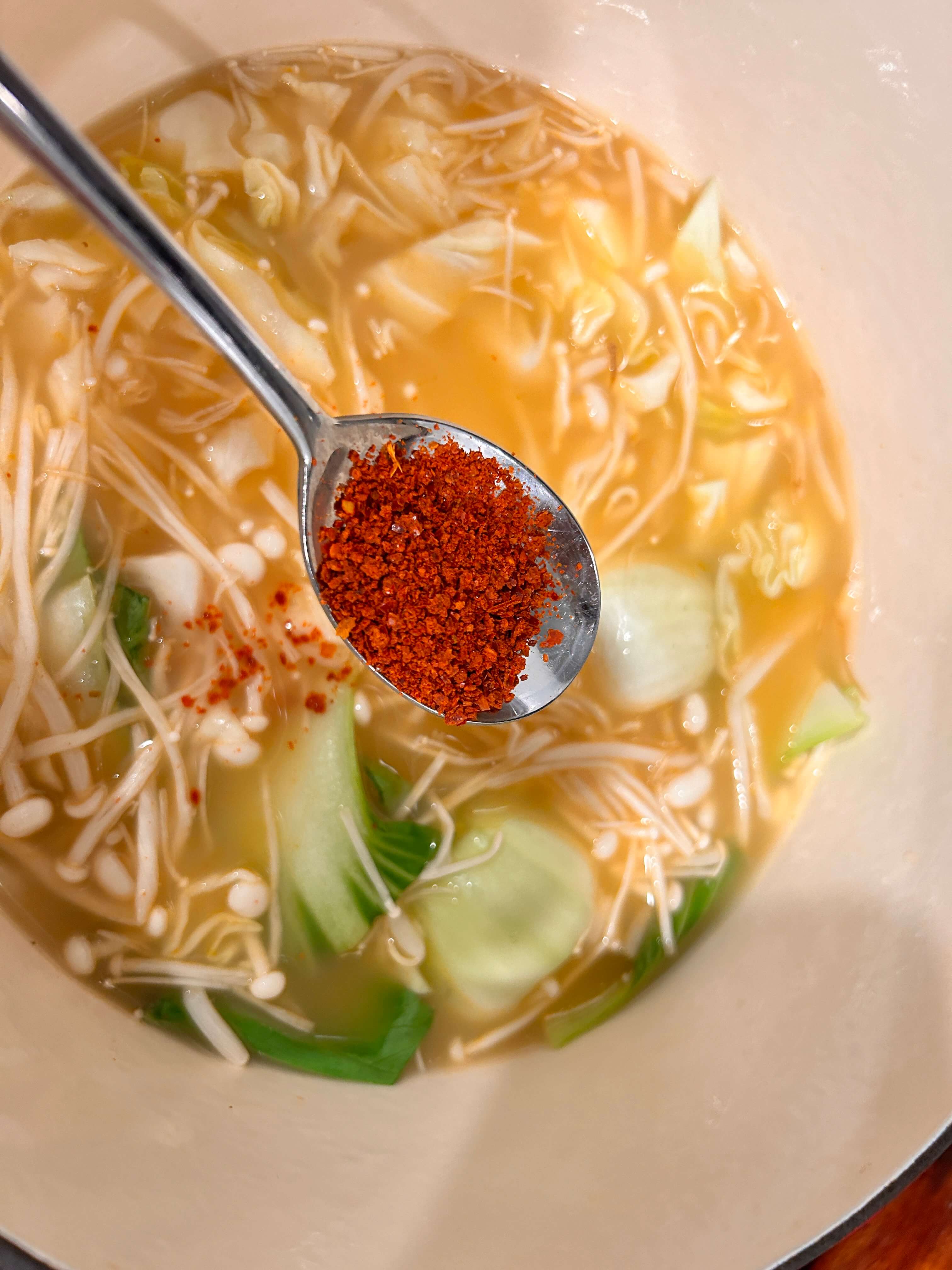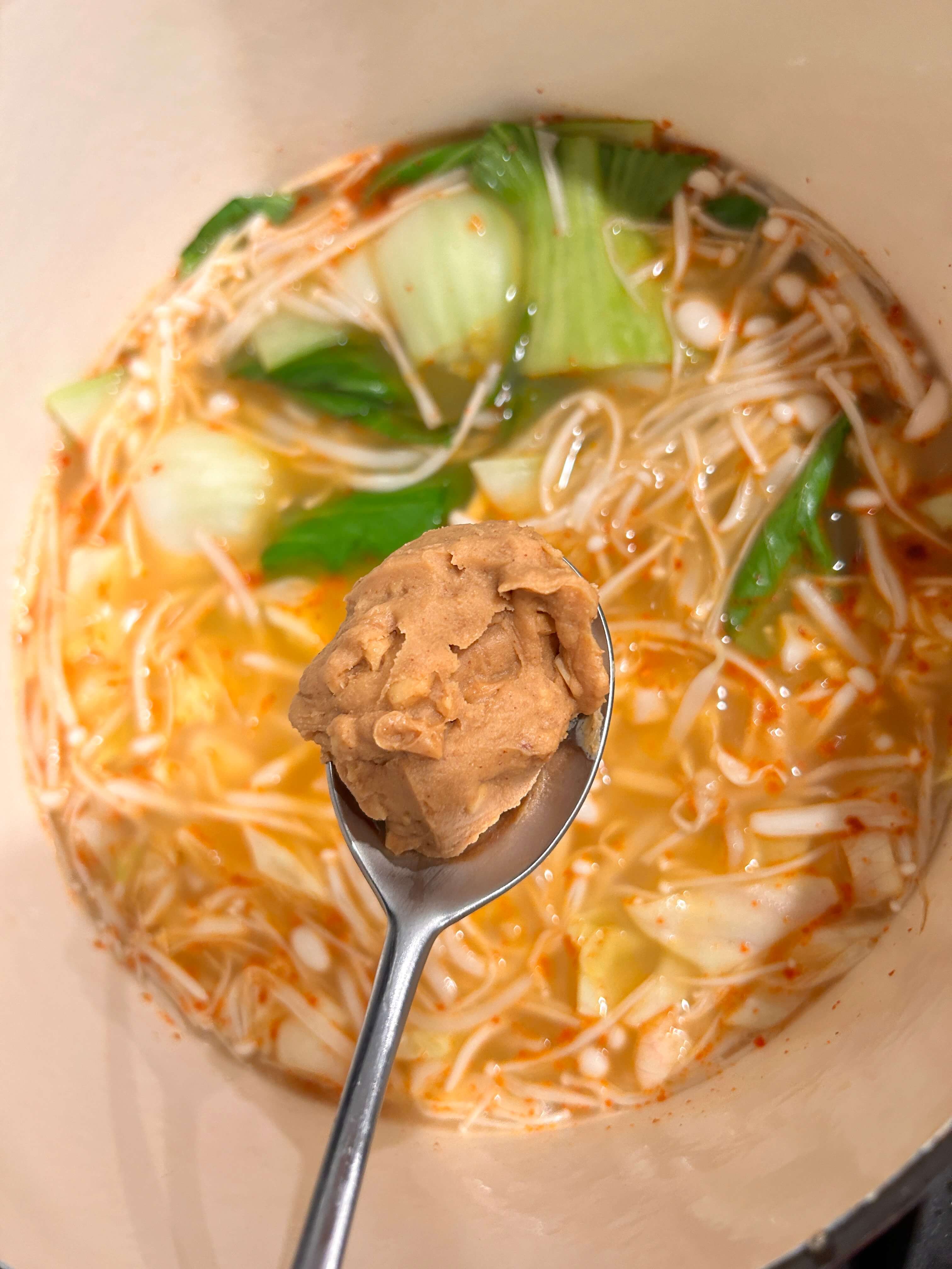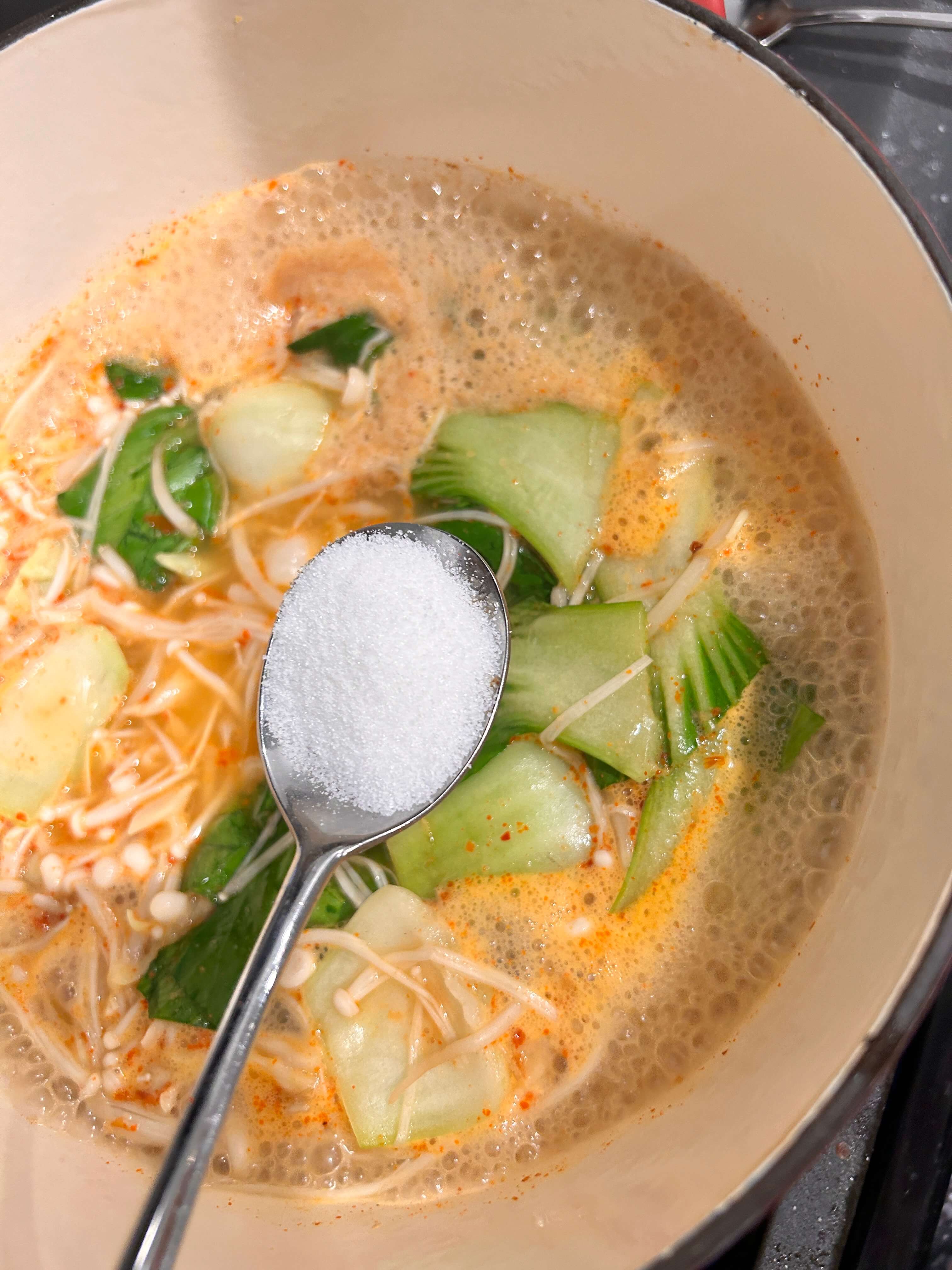 6. 빽쿡 마라소스 1 숟갈, 고춧가루 1 숟갈, 탕콩버터 1숟갈, 설탕 1 숟갈을 넣어줍니다.