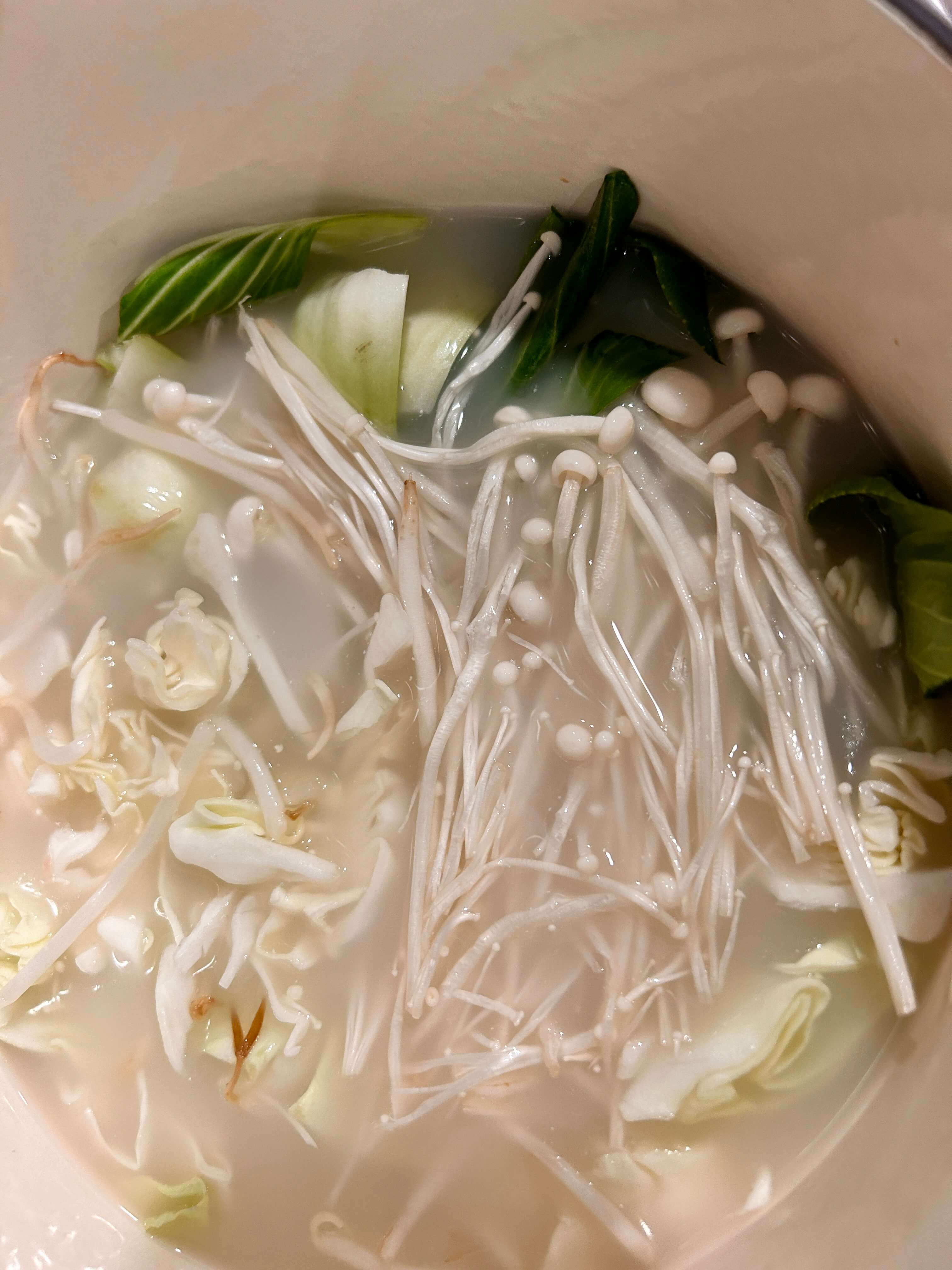 5. 양배추, 버섯, 청경채 야채들을 먼저 넣어줍니다.