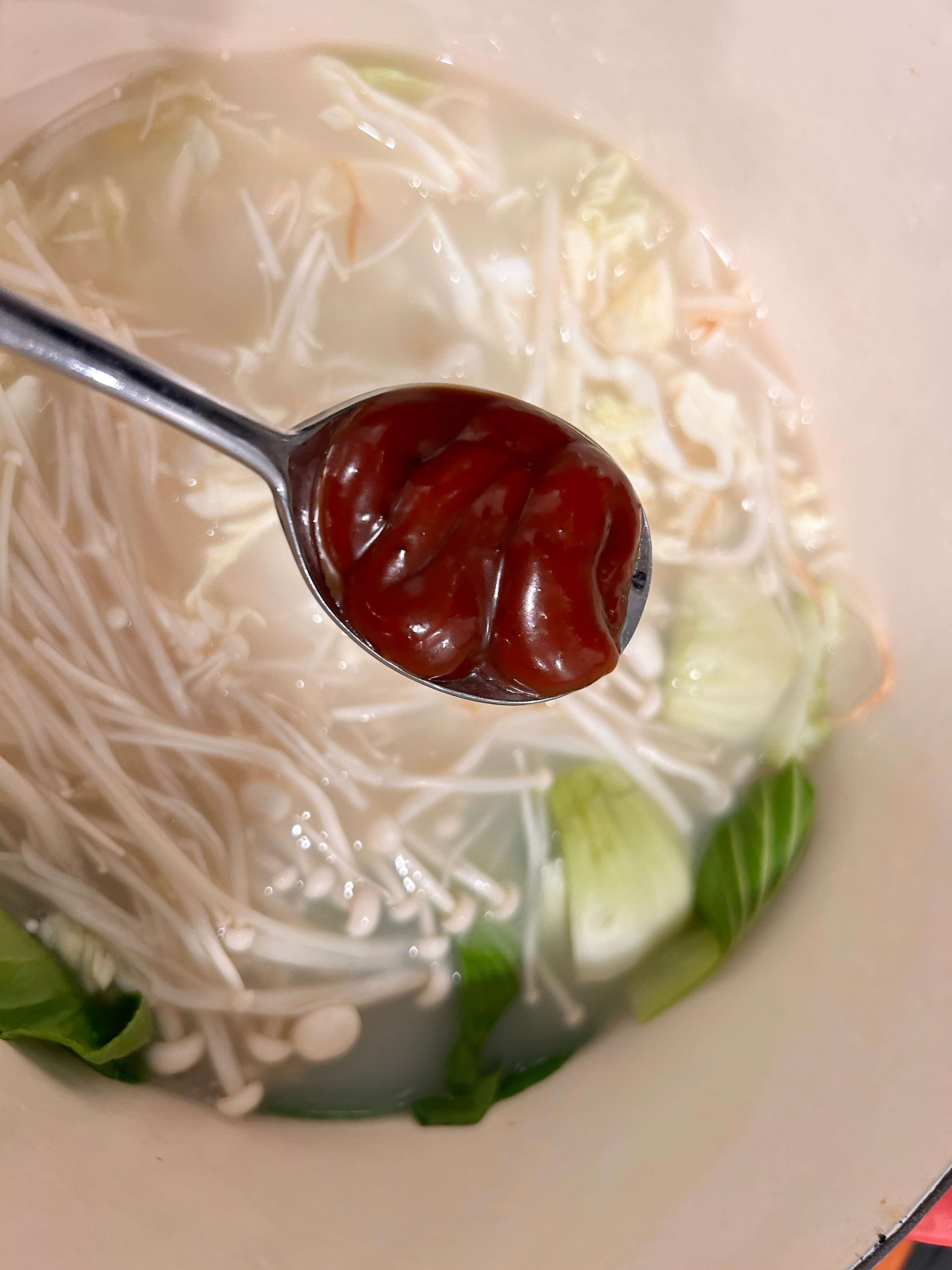 6. 빽쿡 마라소스 1 숟갈, 고춧가루 1 숟갈, 탕콩버터 1숟갈, 설탕 1 숟갈을 넣어줍니다.