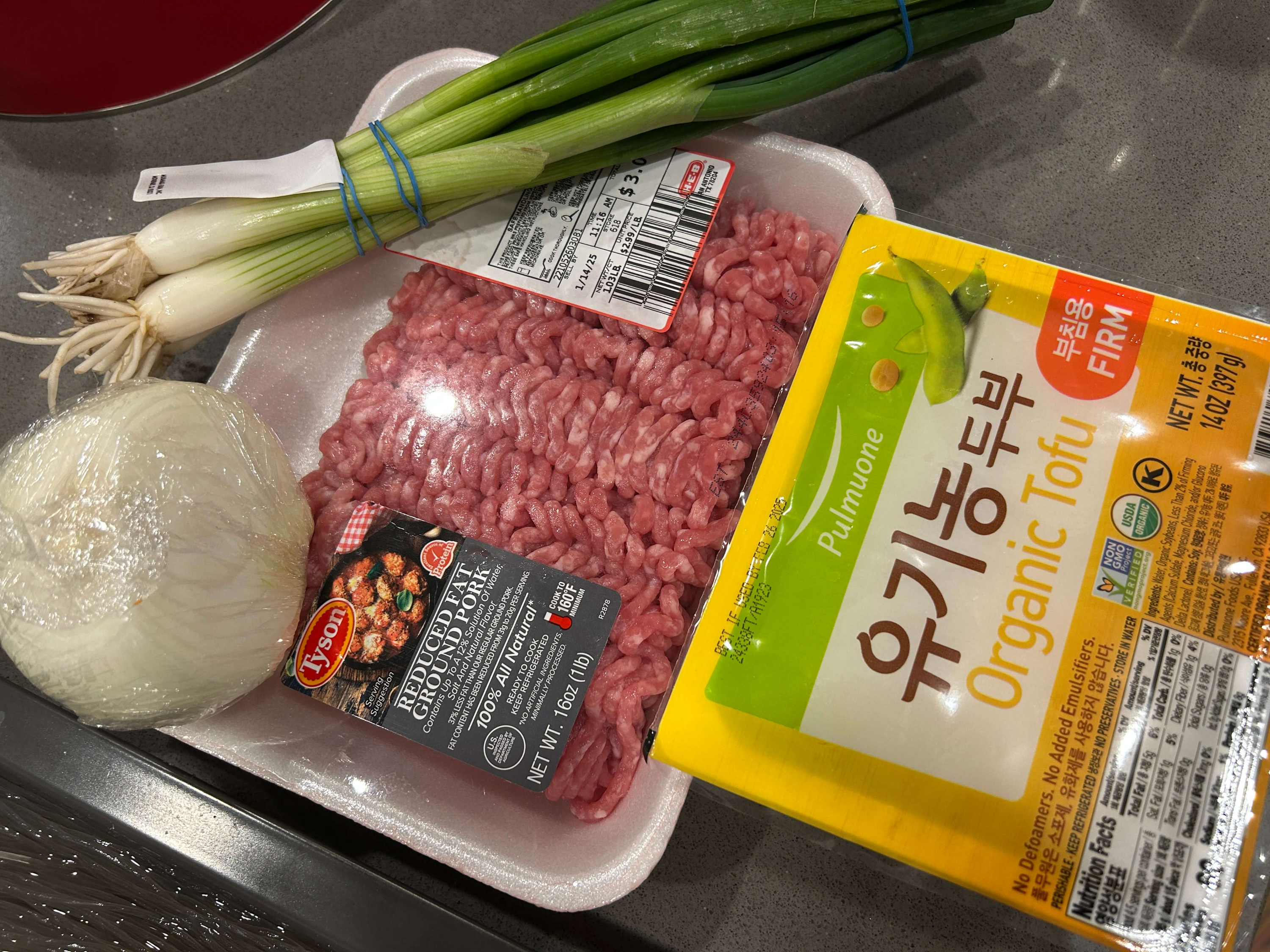 1. 만두 속재료로 간돼지고기, 양파, 파, 두부, 양배추를 준비해 줍니다.