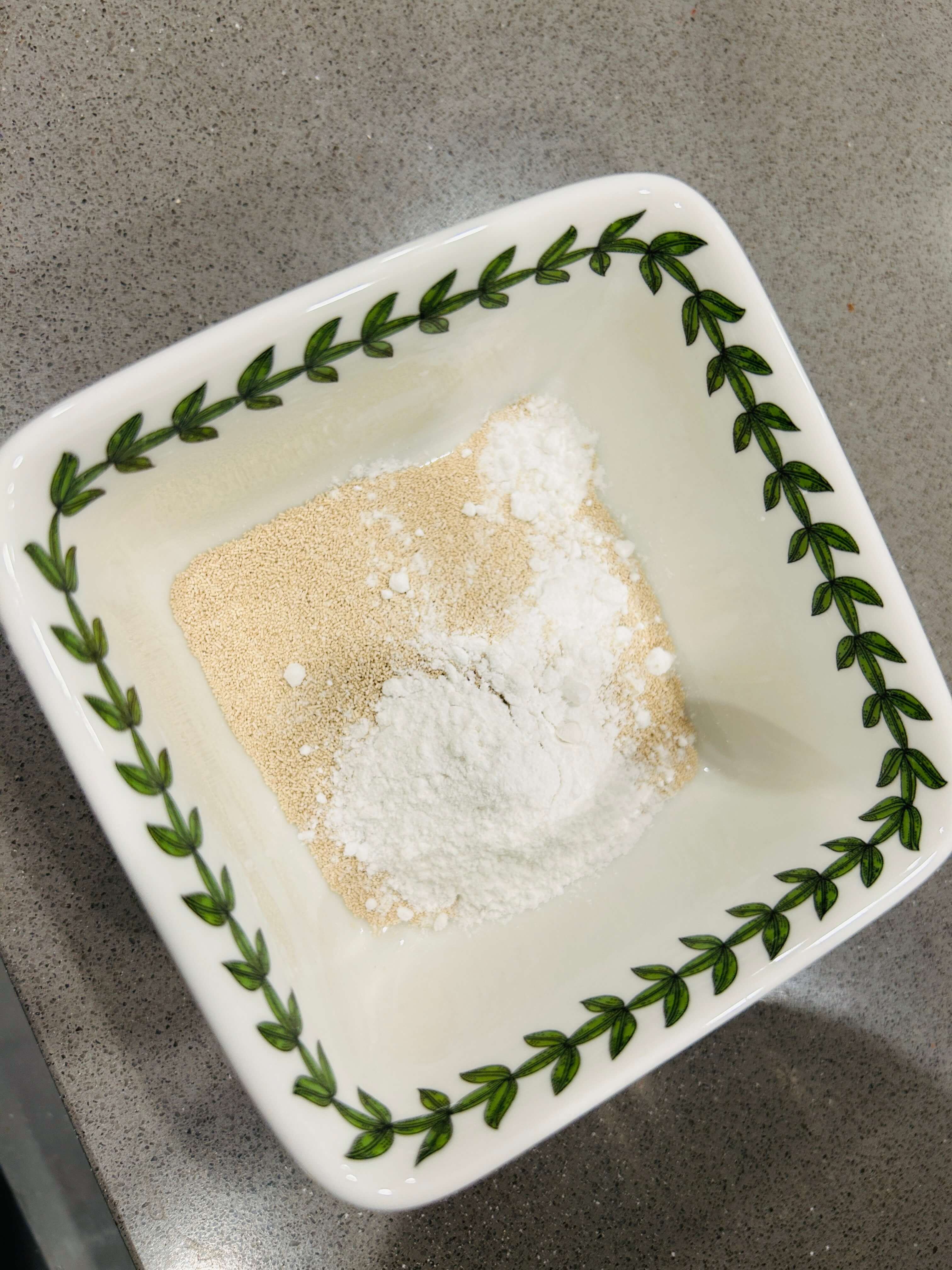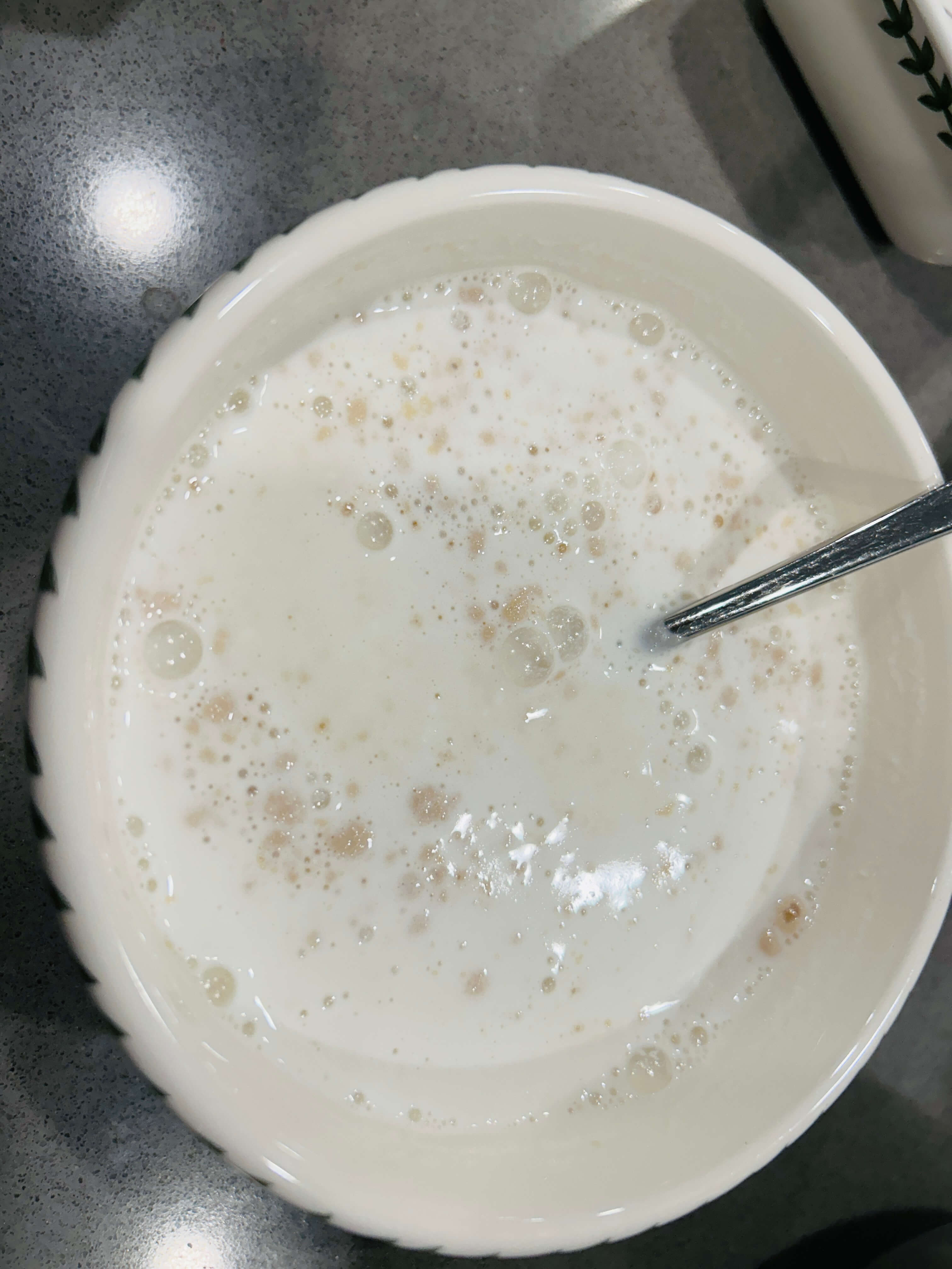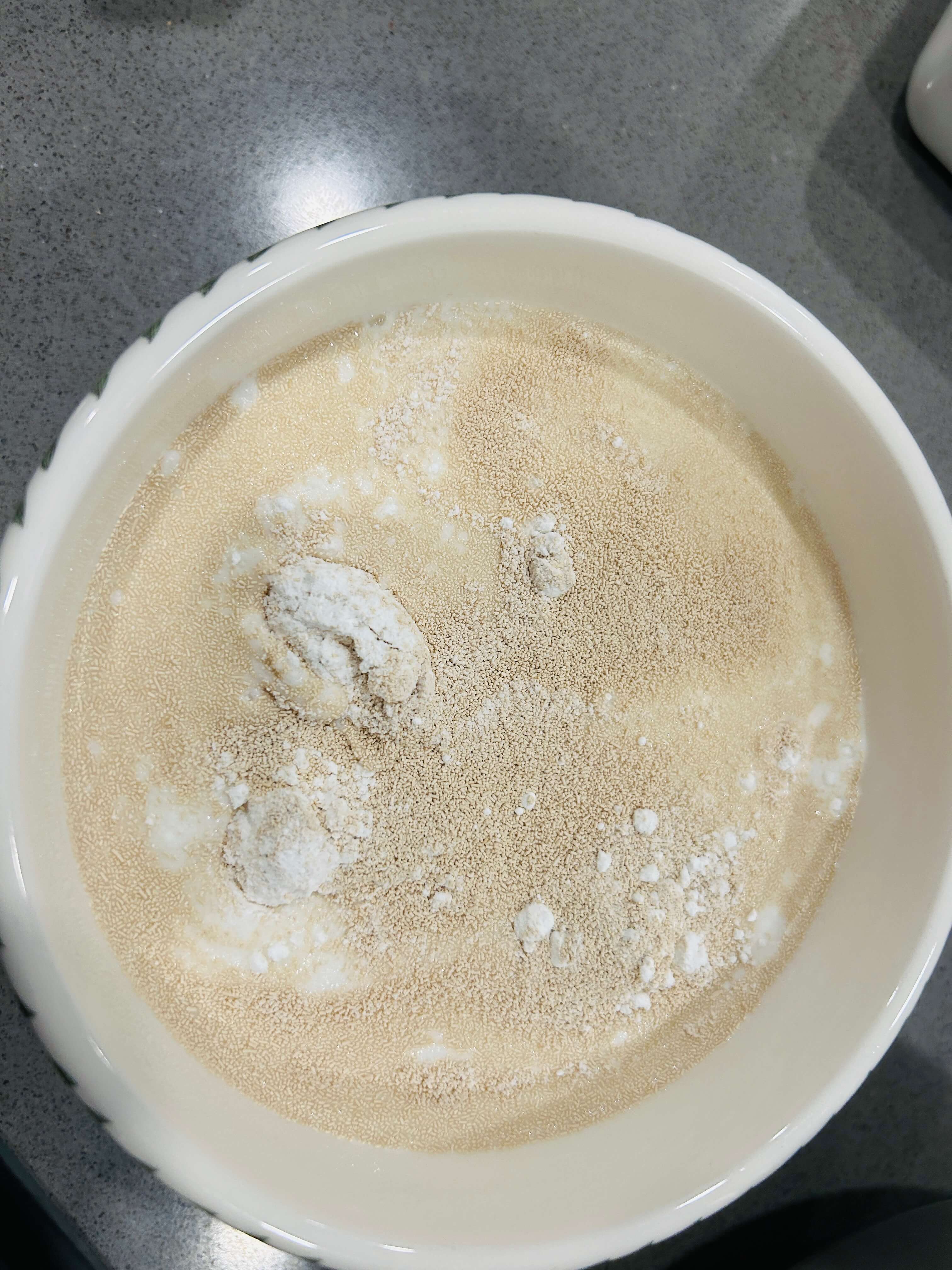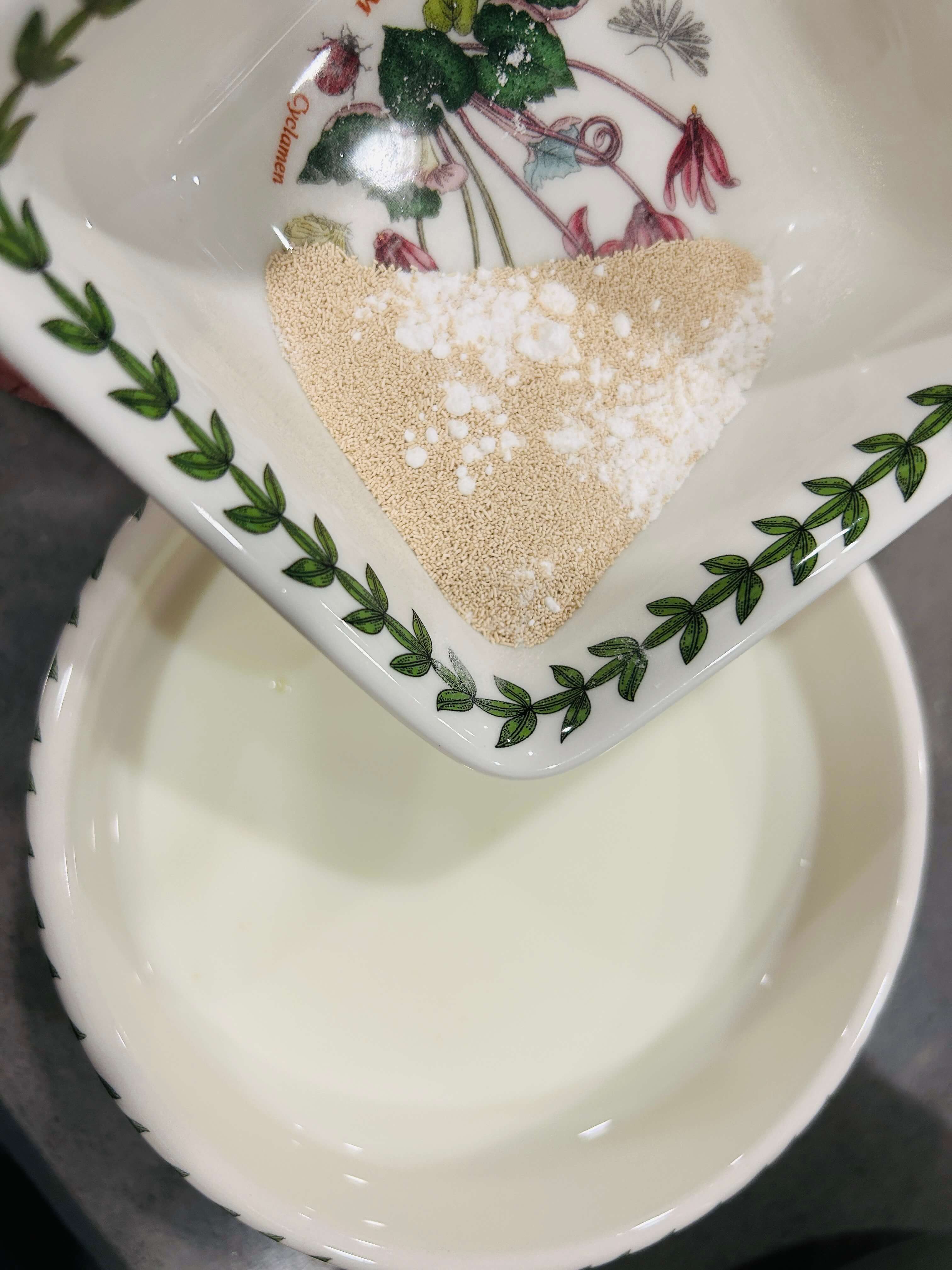 7. 따뜻한 우유에 드라이이스트와 베이킹파우더를 넣어 잘 섞어줍니다.