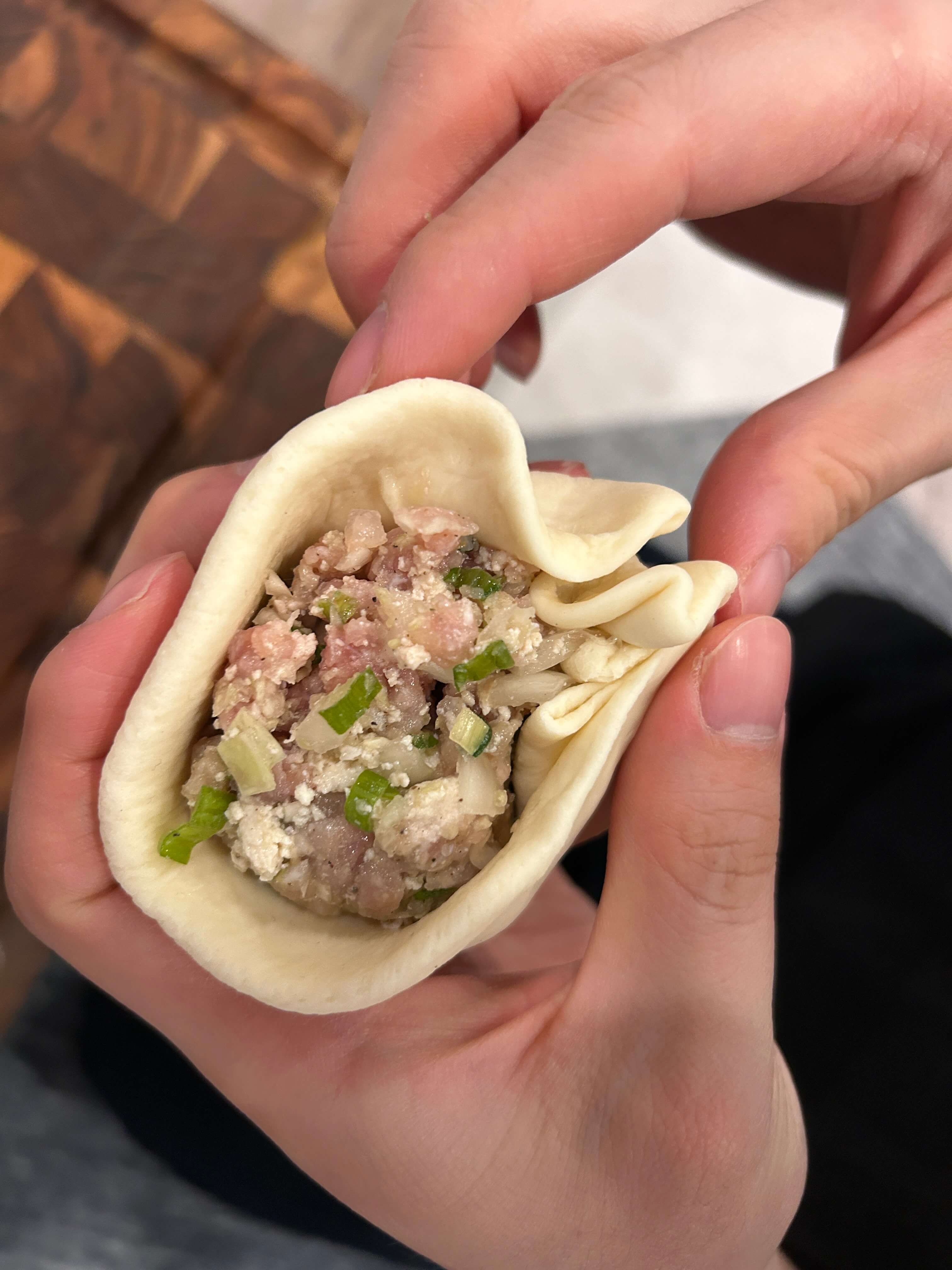 14. 만두피에 만두 속을 꽉 채워 담은 뒤 모양을 잡아줍니다.