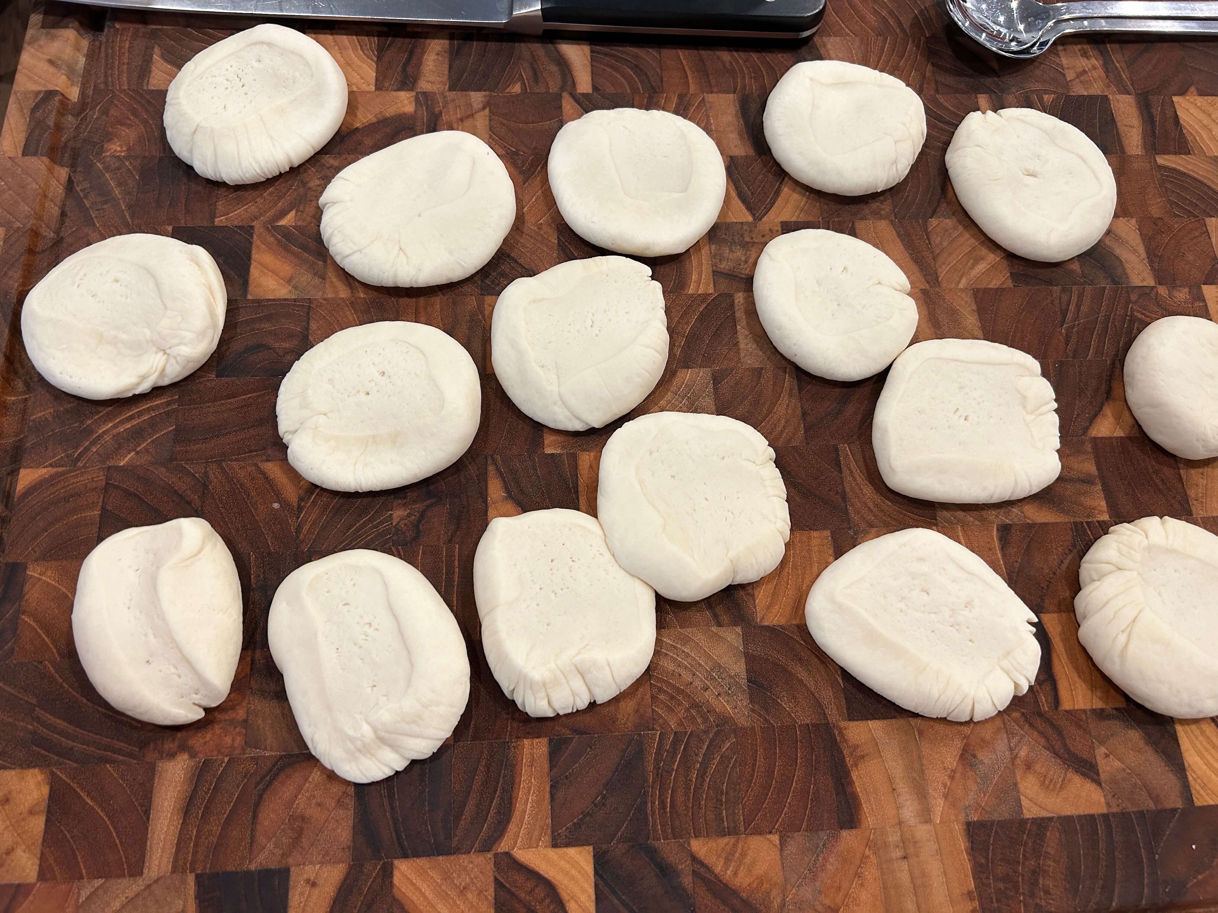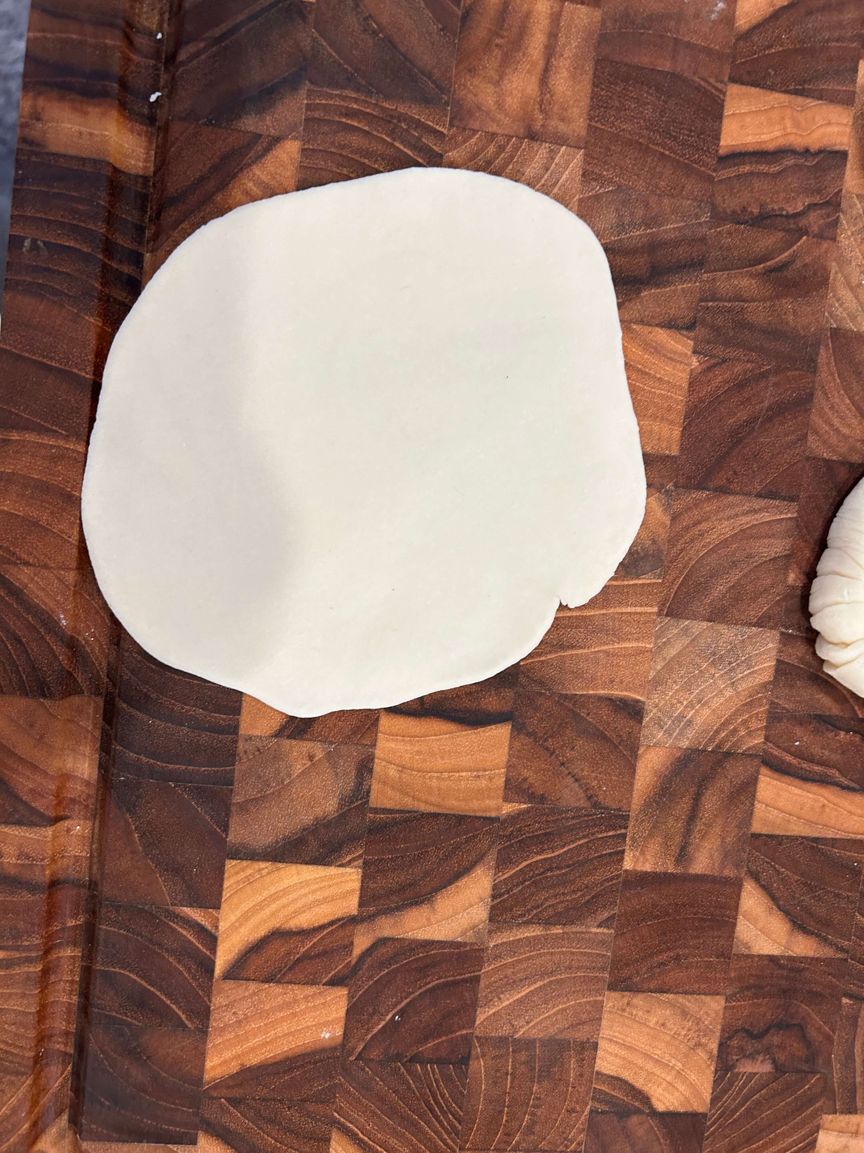 13. 만두피 반죽을 밀대로 밀어 펴줍니다.