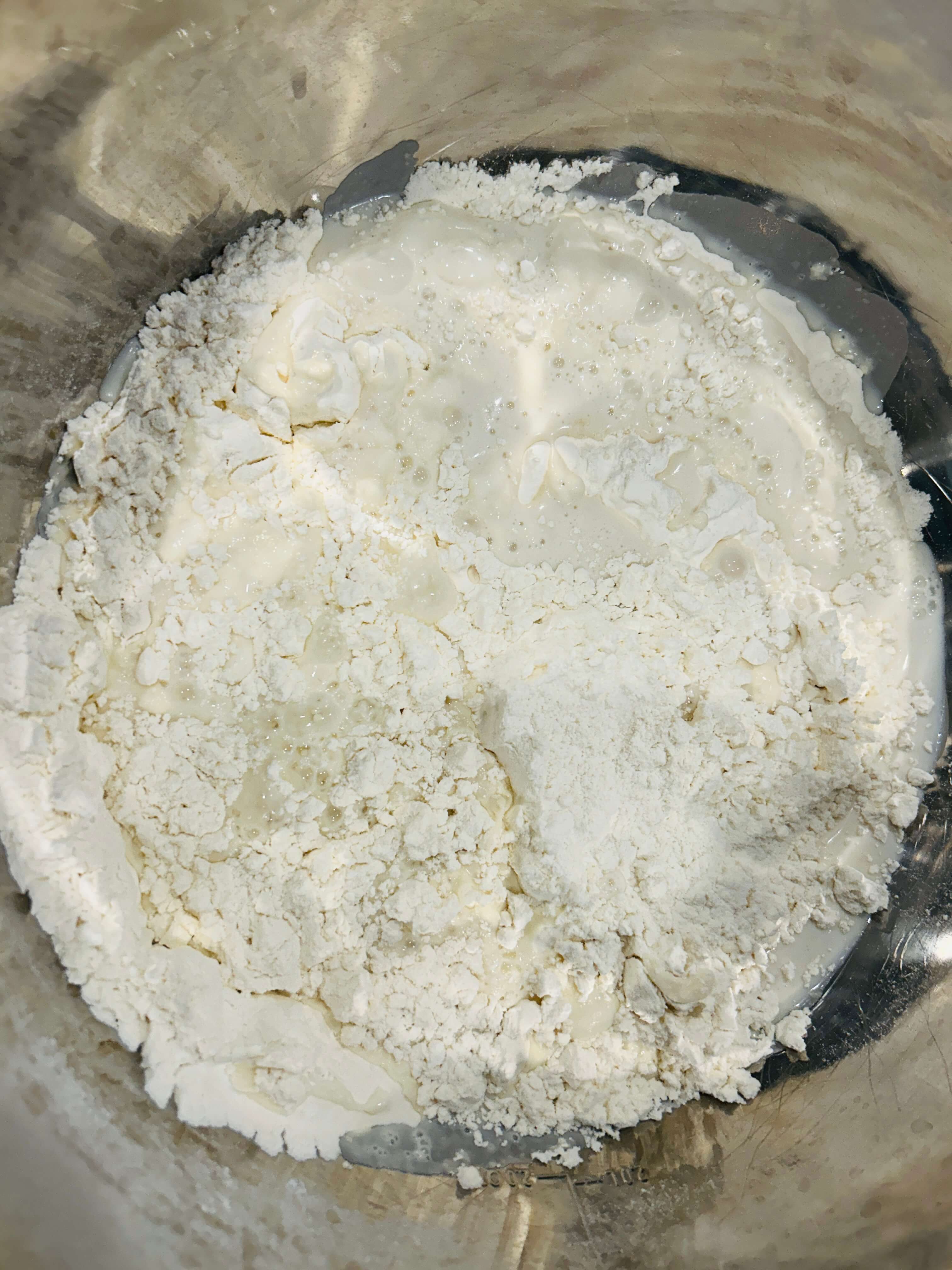 10. 드라이이스트와 베이킹파우더를 섞은 우유를 넣고 반죽을 잘 뭉쳐줍니다.