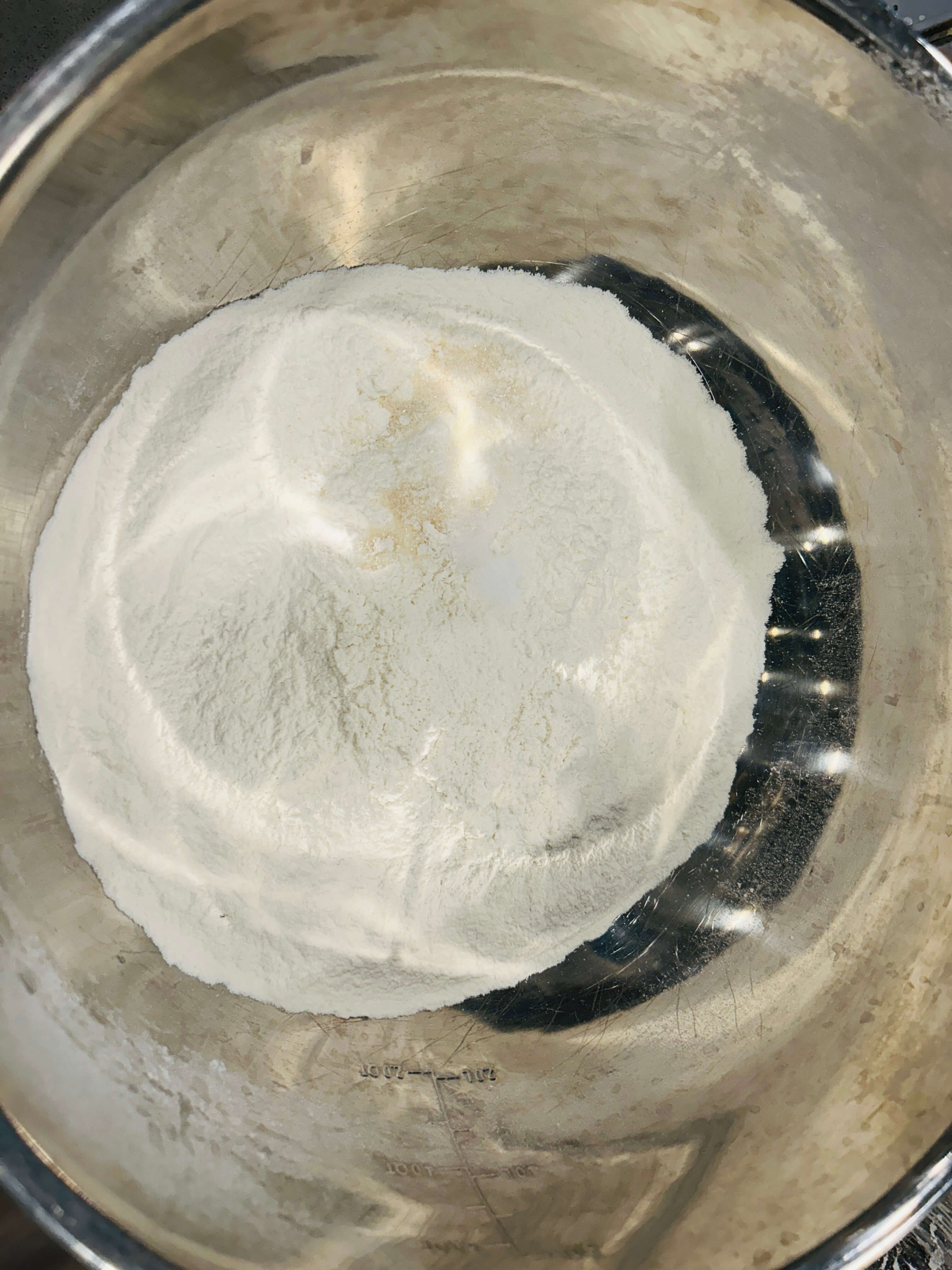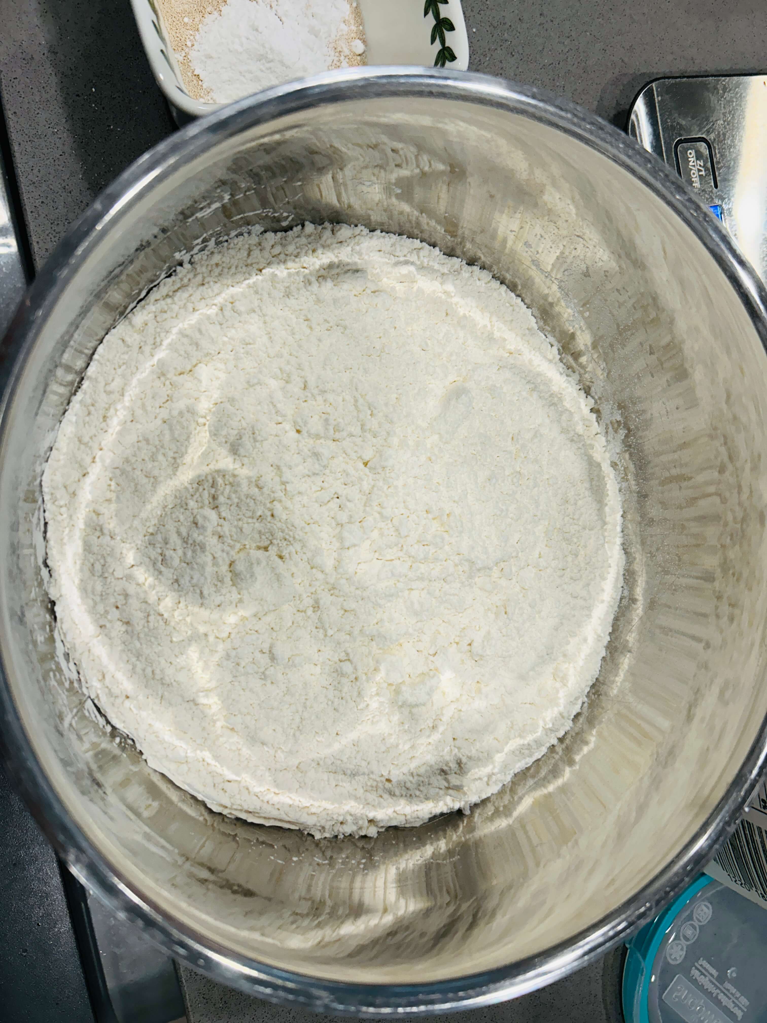 5. 만두피 재료로 밀가루 500g, 드라이이스트 7g, 베이킹파우더 4g, 우유 300ml를 준비해 줍니다.