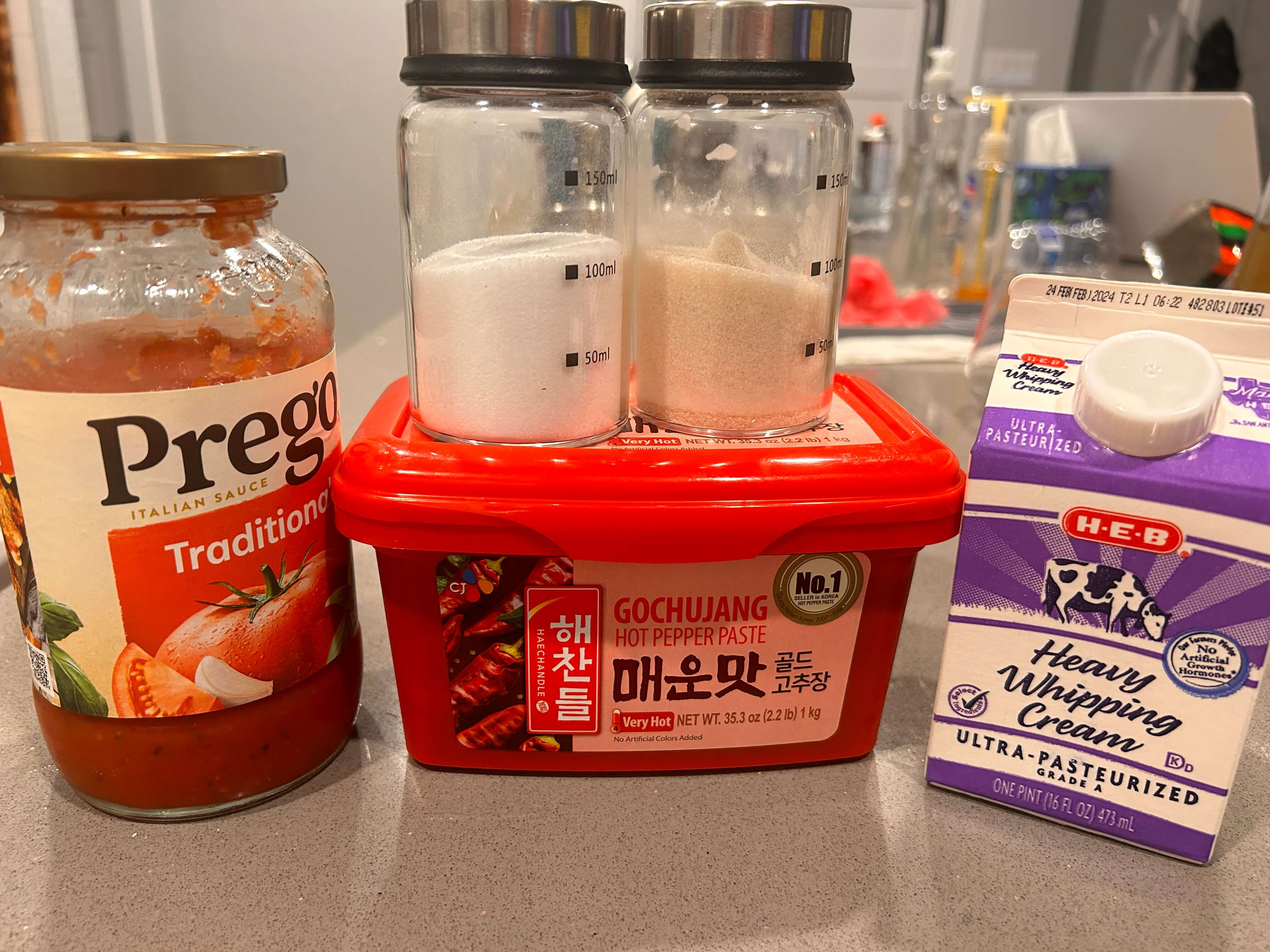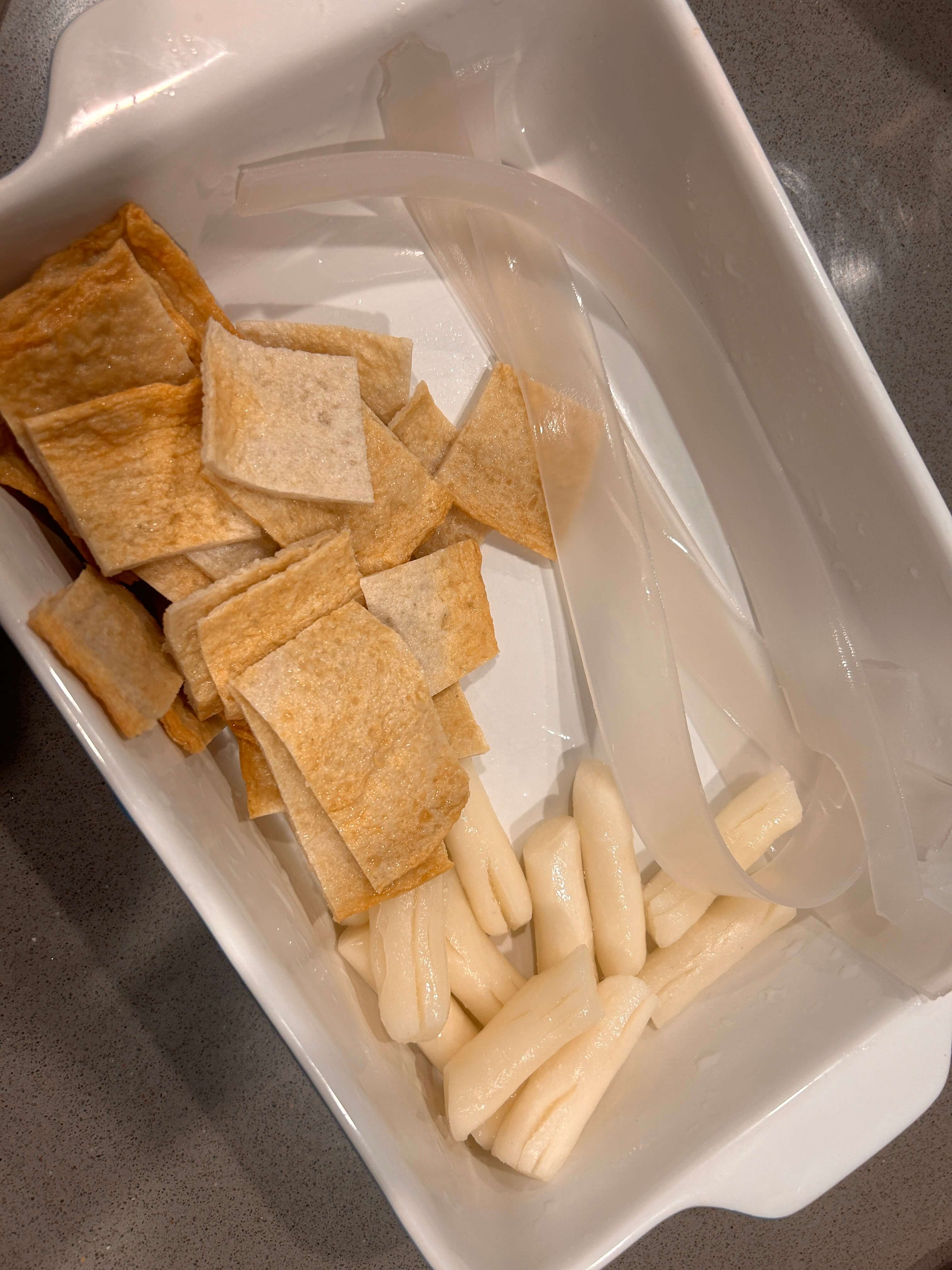 1. 떡볶이 떡, 어묵, 넙적 당면(불려서 준비) , 그리고 소스(생크림, 토마토소스, 고추장, 설탕, 소금)를 준비해 줍니다.