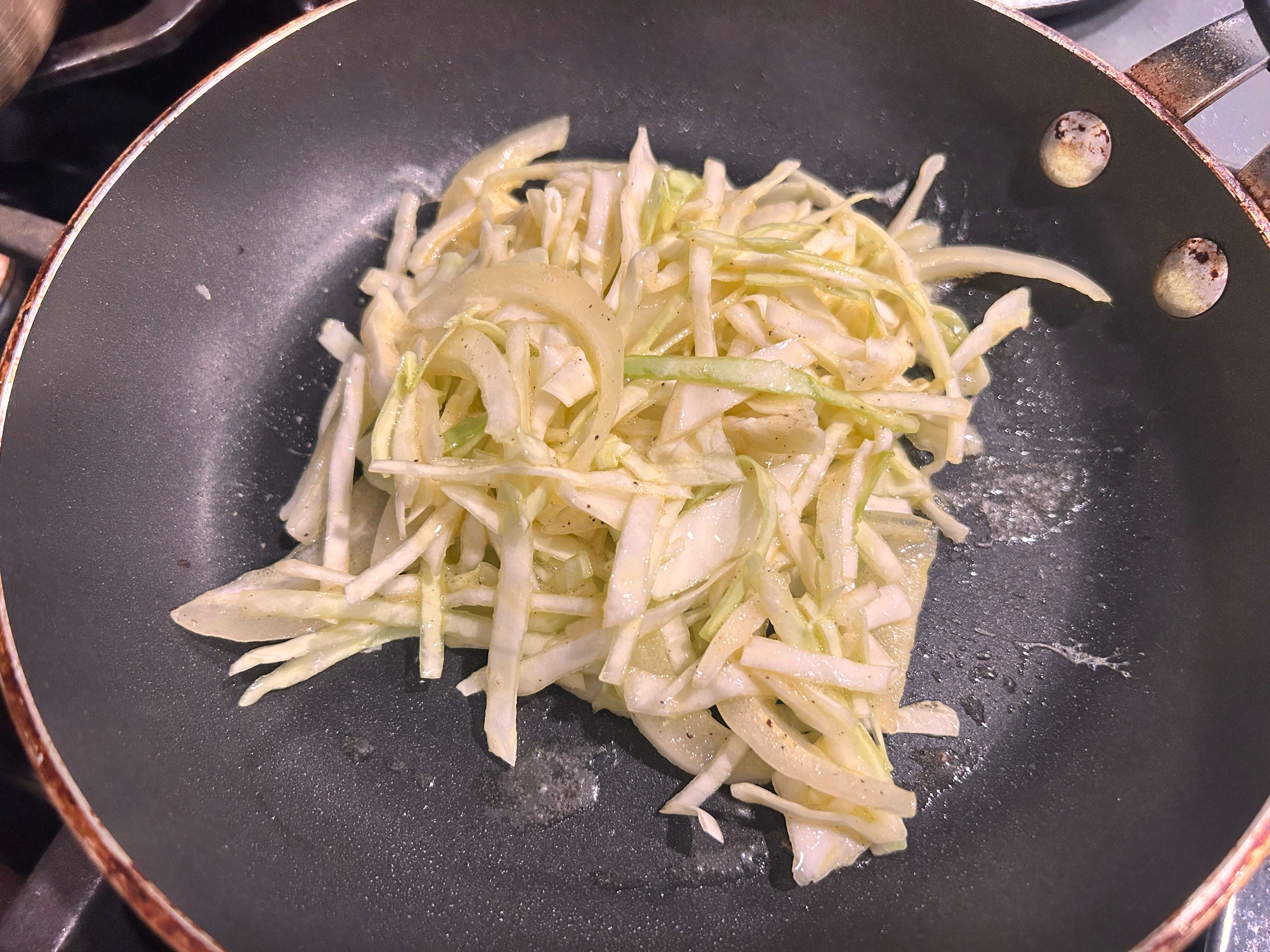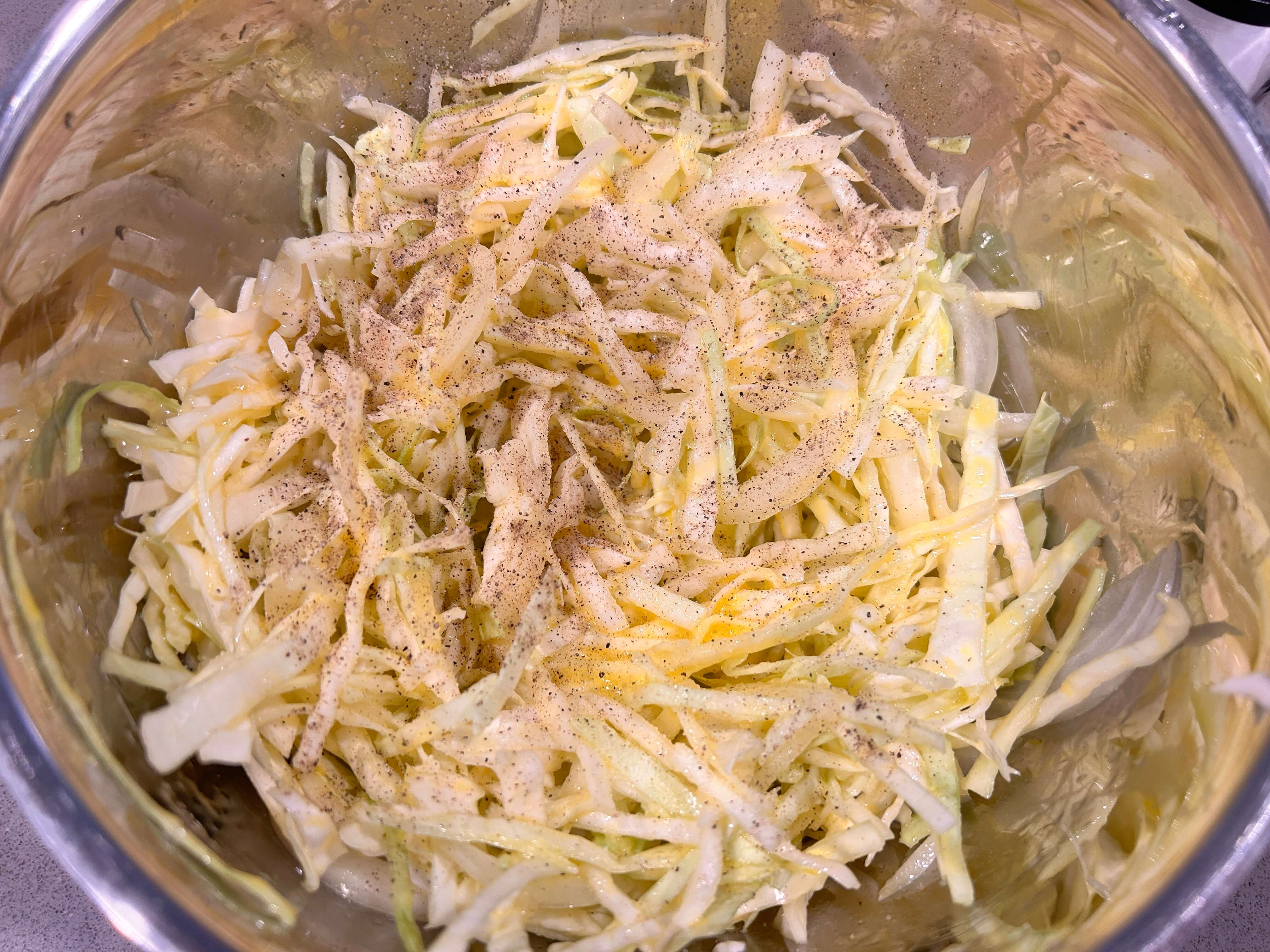 5. 소금, 후추를 넣고 양배추, 양파, 달걀을 잘 섞어줍니다.