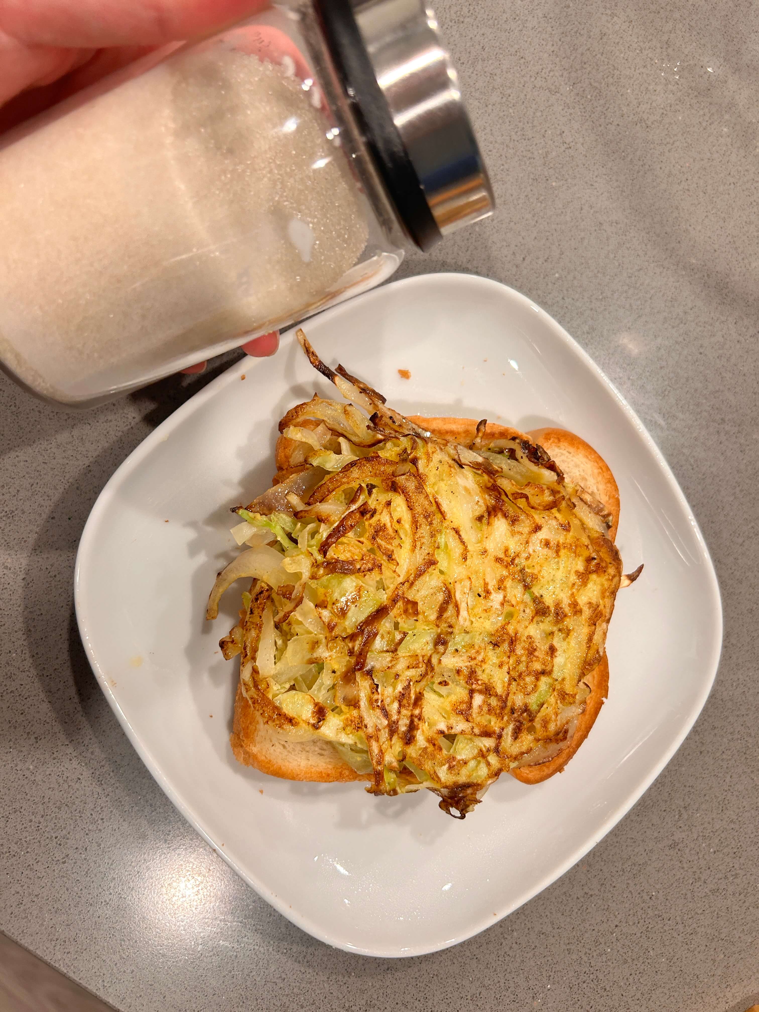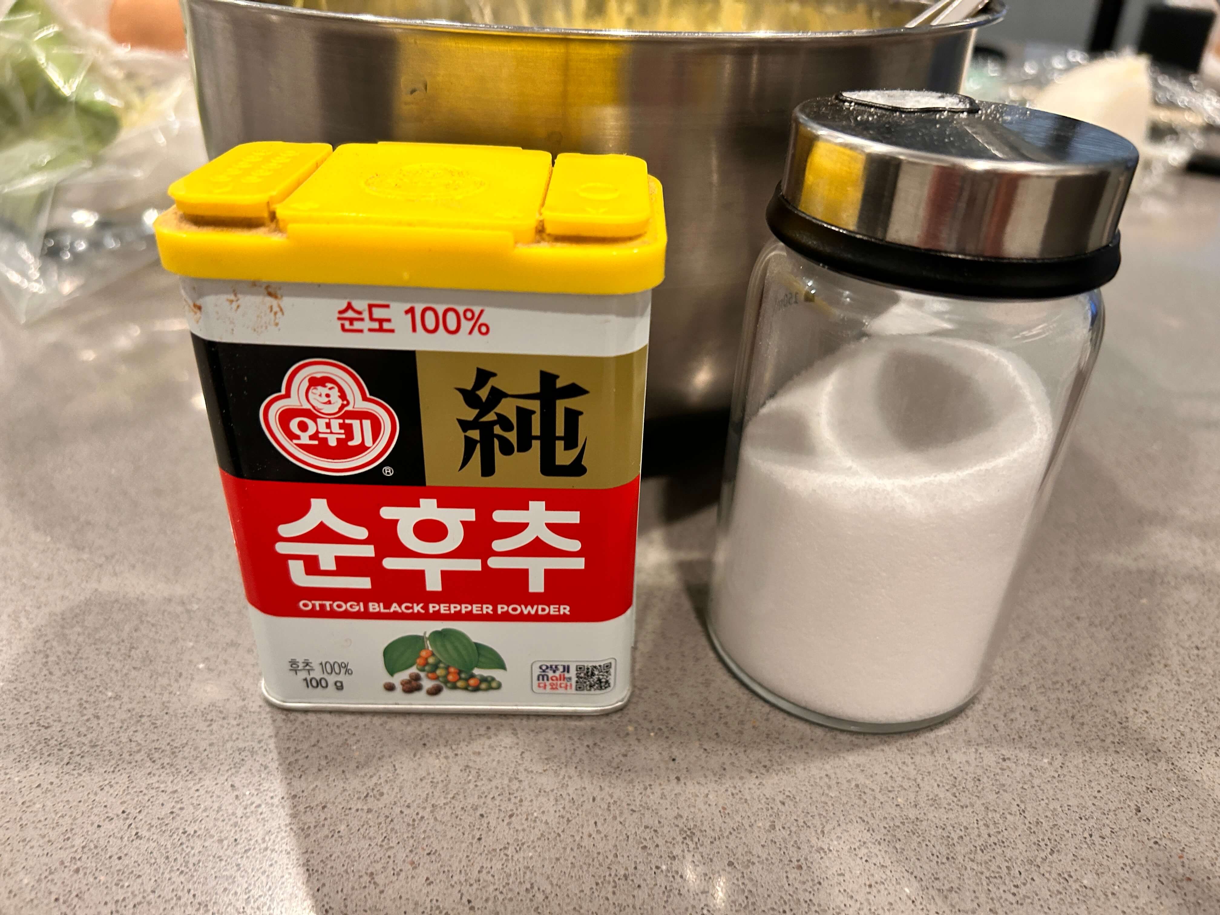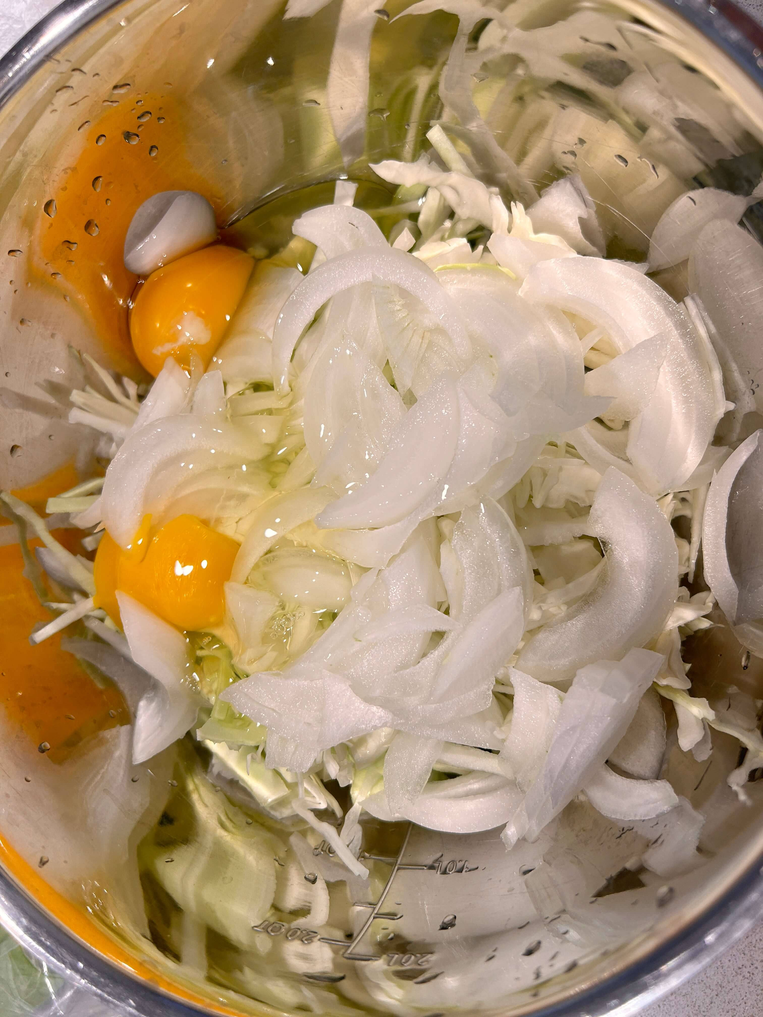 5. 소금, 후추를 넣고 양배추, 양파, 달걀을 잘 섞어줍니다.
