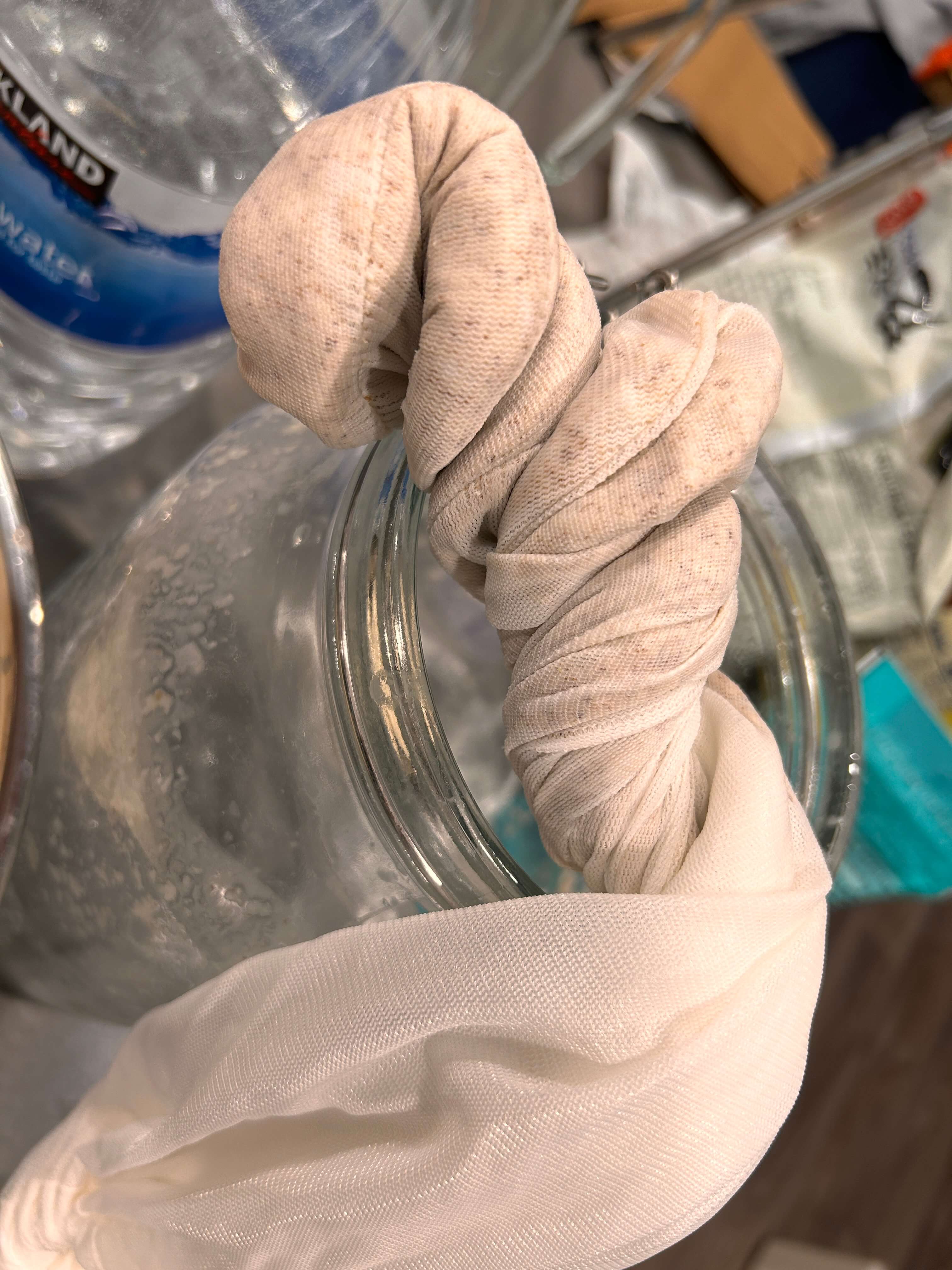 2. 발효된 막걸리는 거름망에 부어 줍니다.