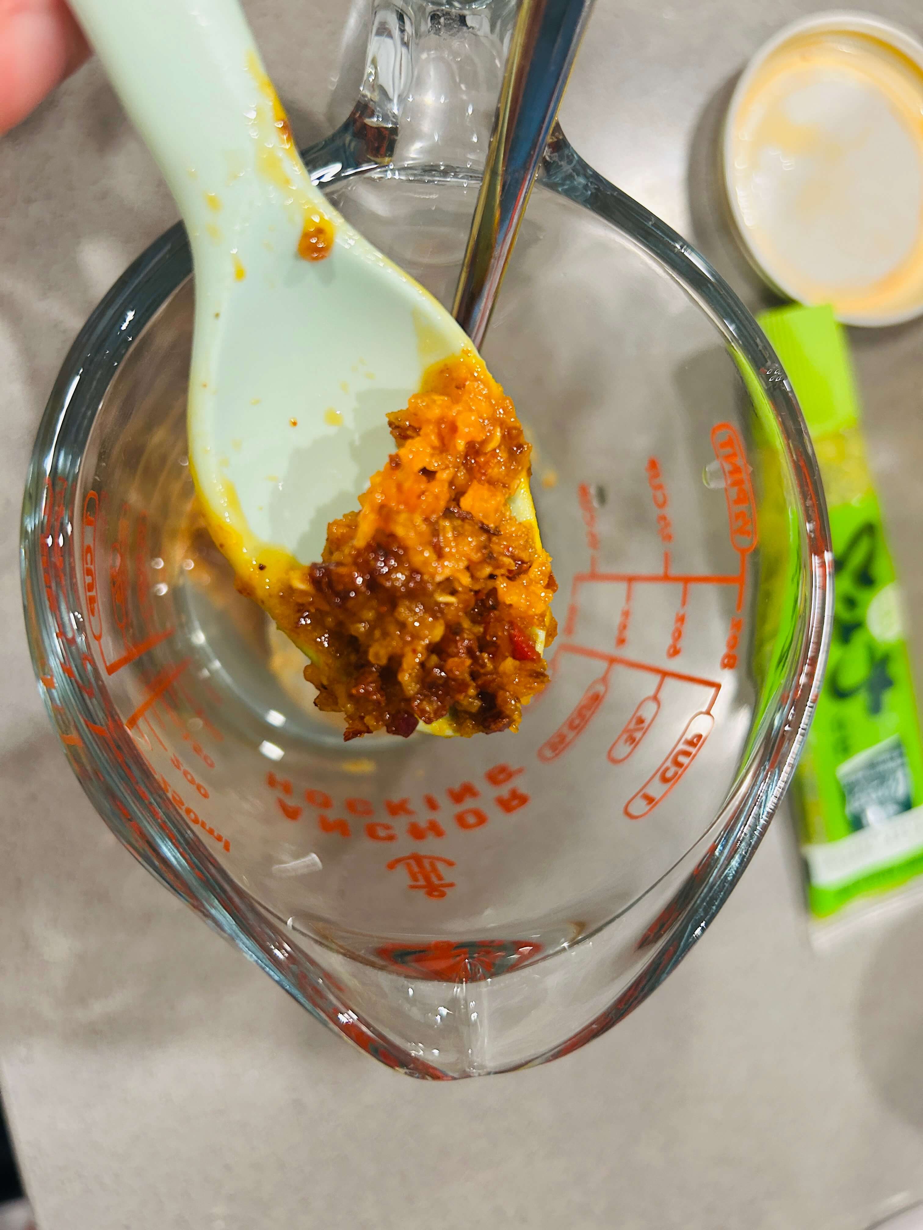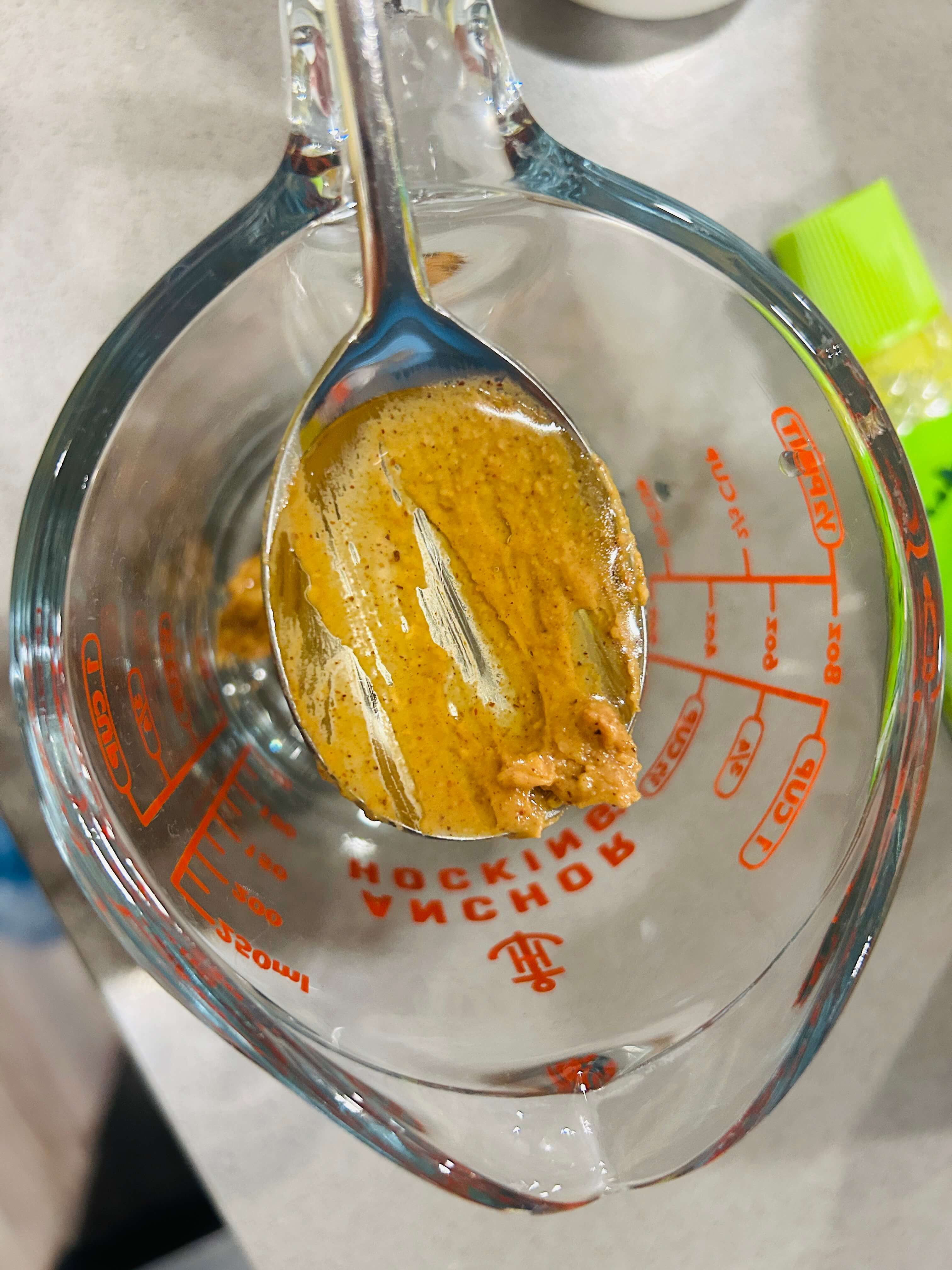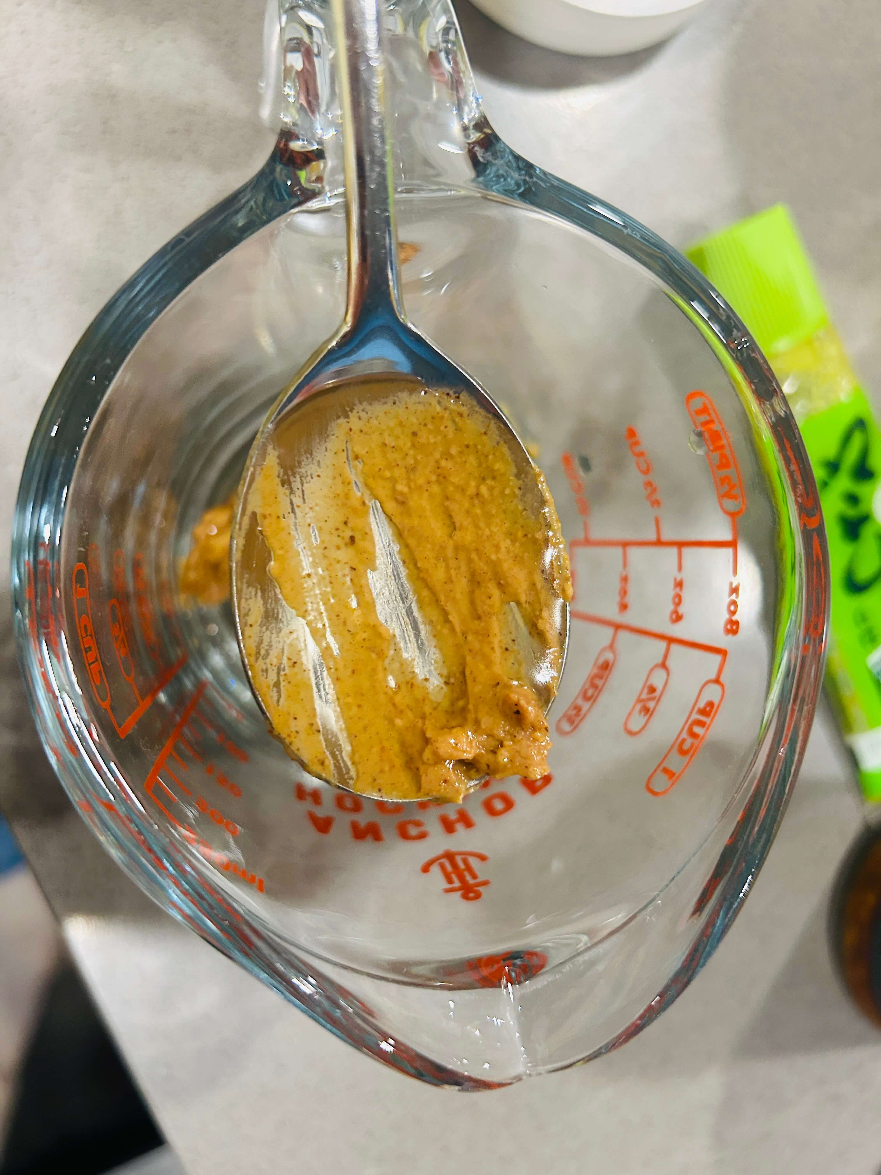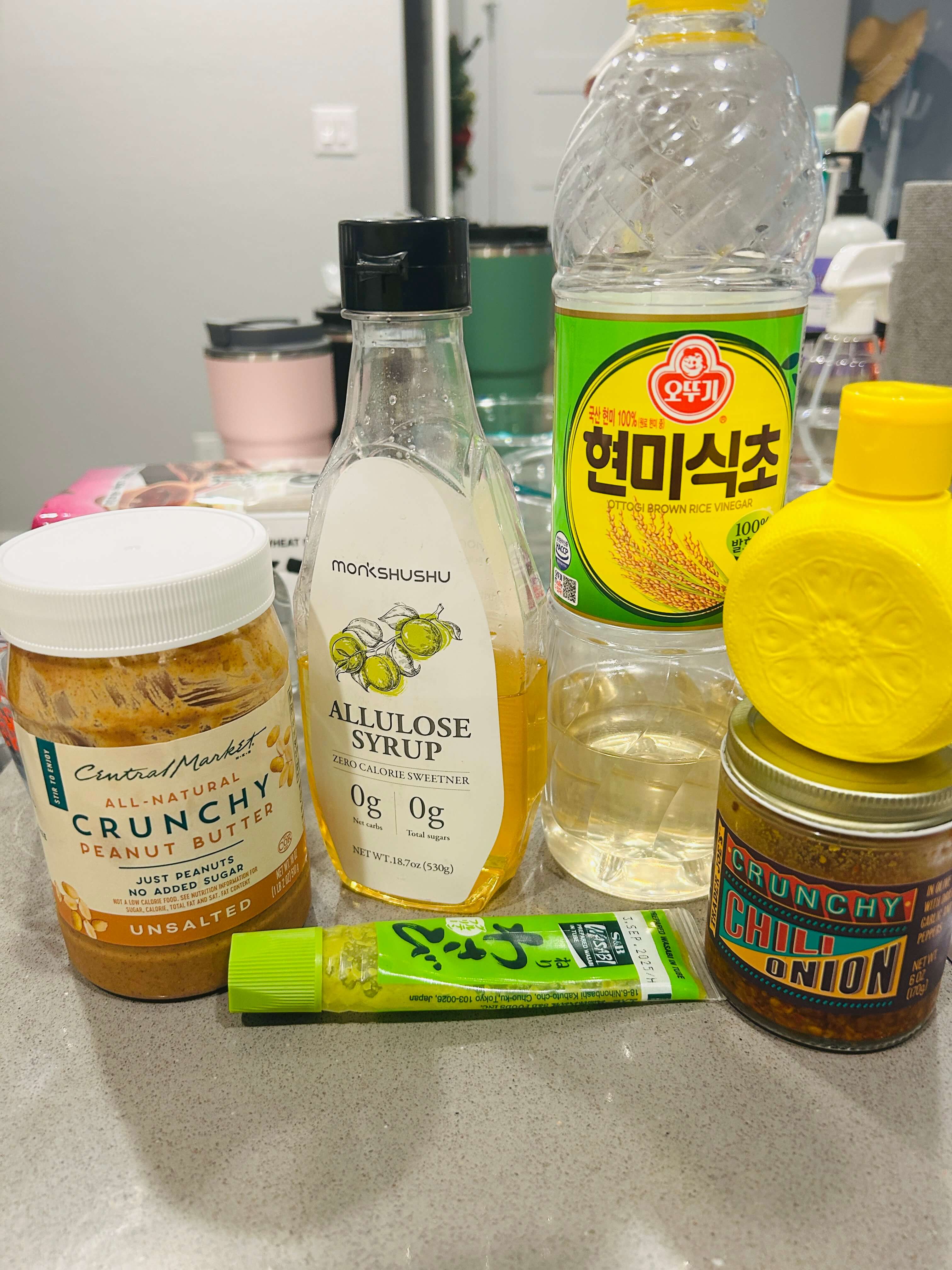 4. 소스재료로 땅콩버터, 알룰로스, 식초, 레몬즙, 크런키 칠리 어니언, 겨자를 준비해 줍니다.