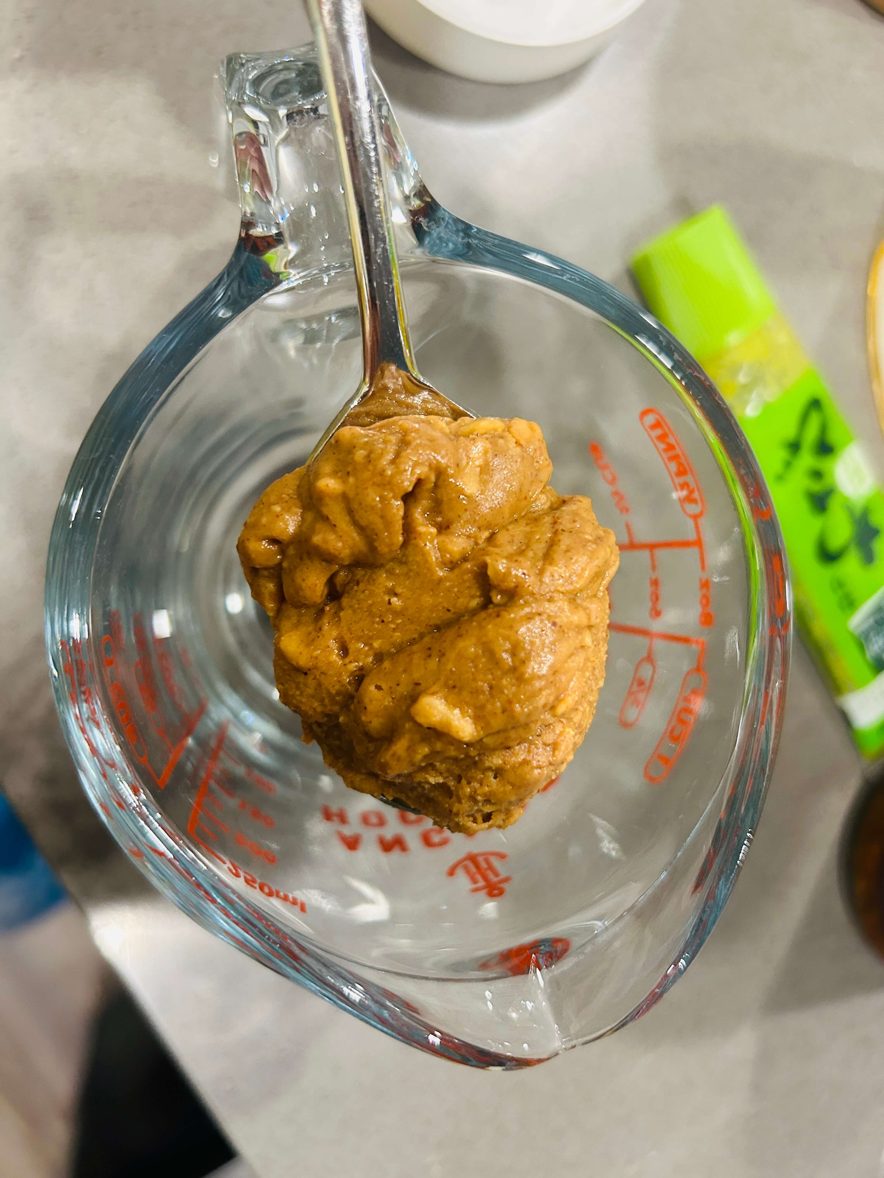 5. 땅콩버터 1, 알룰로스 1, 식초 1, 레몬즙 2,크런키 칠리 어니언 0.5, 겨자 0.5 숟갈을 넣어 잘 섞어 소스를 준비해 줍니다.