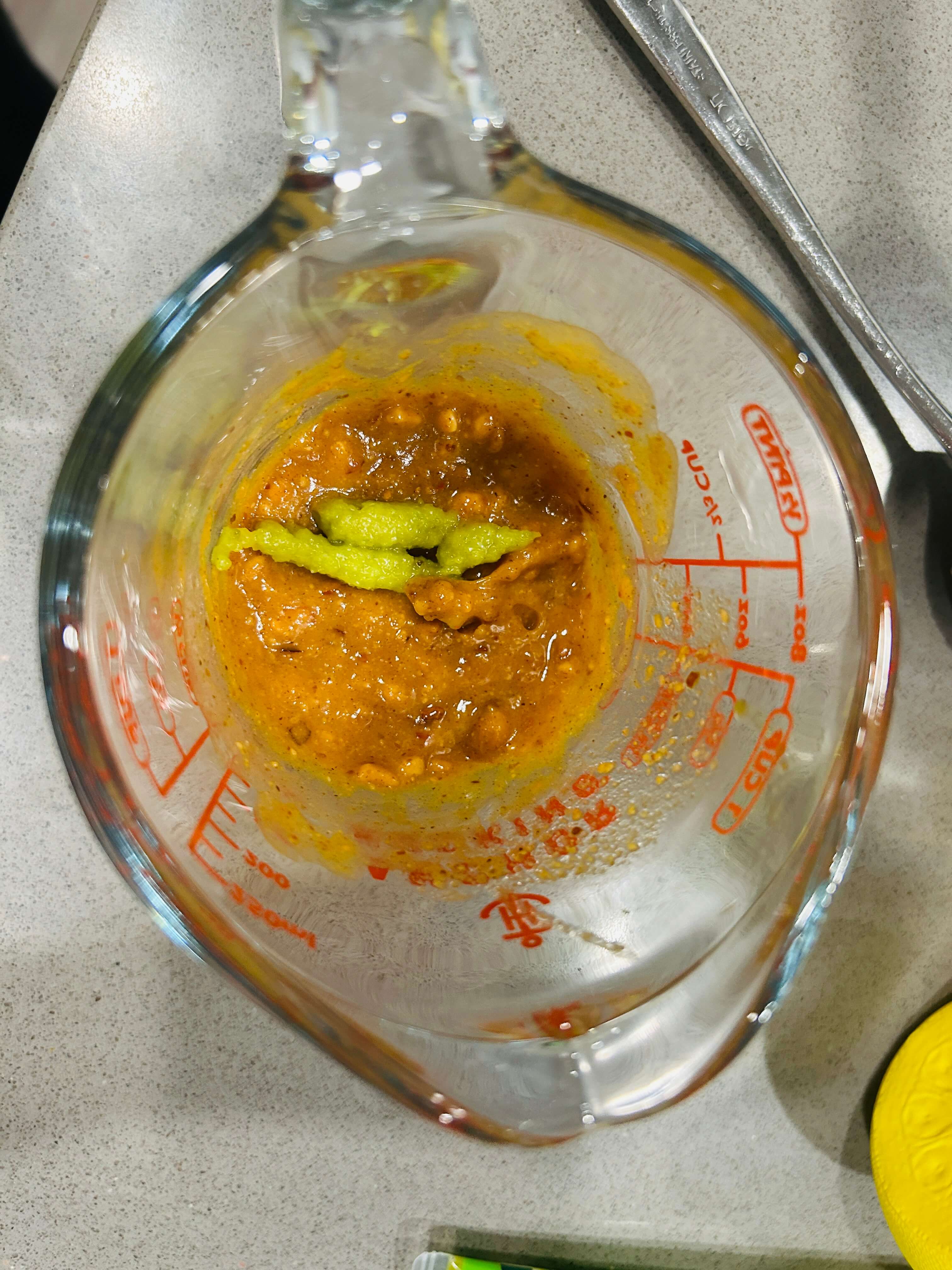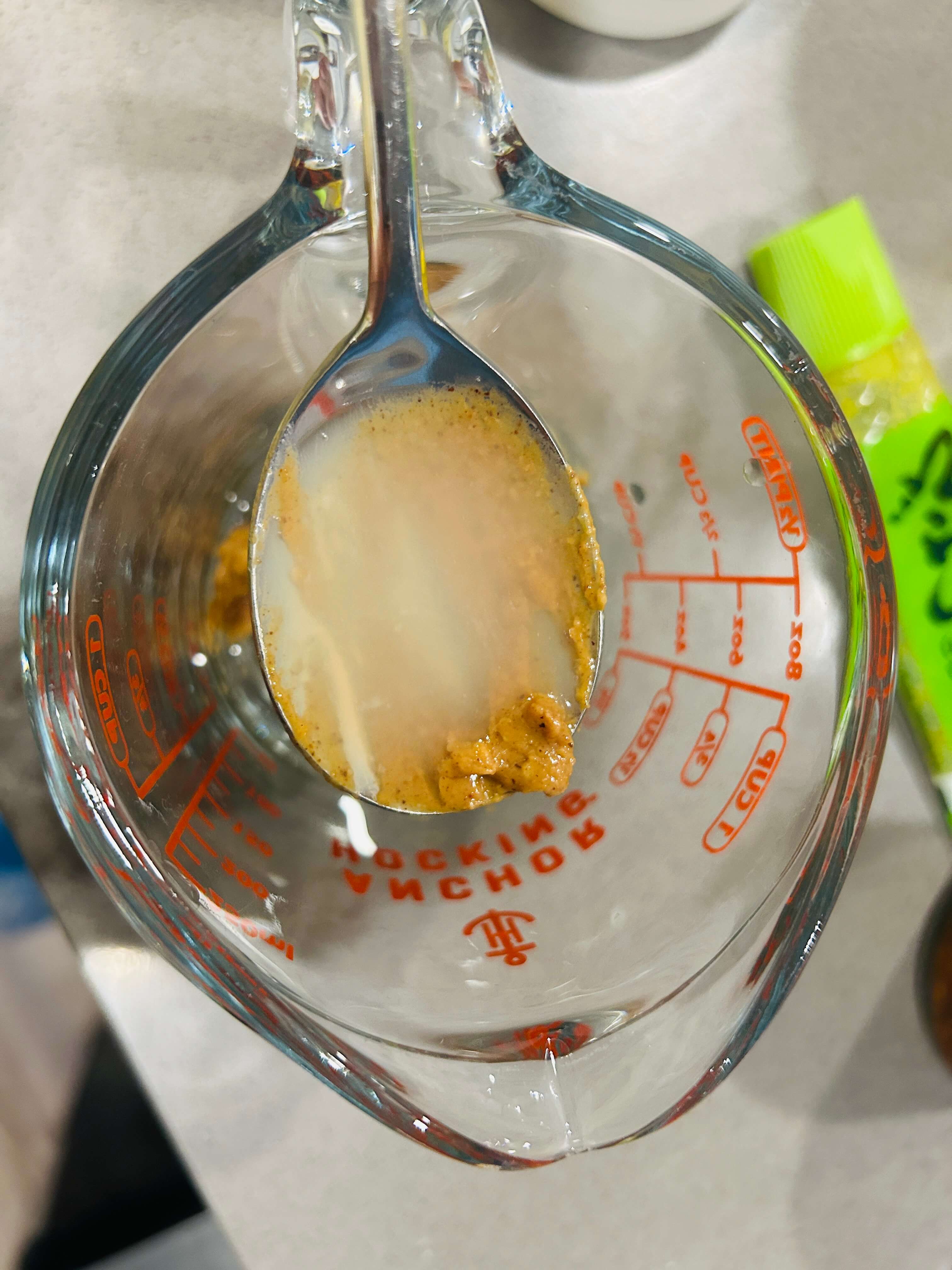 5. 땅콩버터 1, 알룰로스 1, 식초 1, 레몬즙 2,크런키 칠리 어니언 0.5, 겨자 0.5 숟갈을 넣어 잘 섞어 소스를 준비해 줍니다.