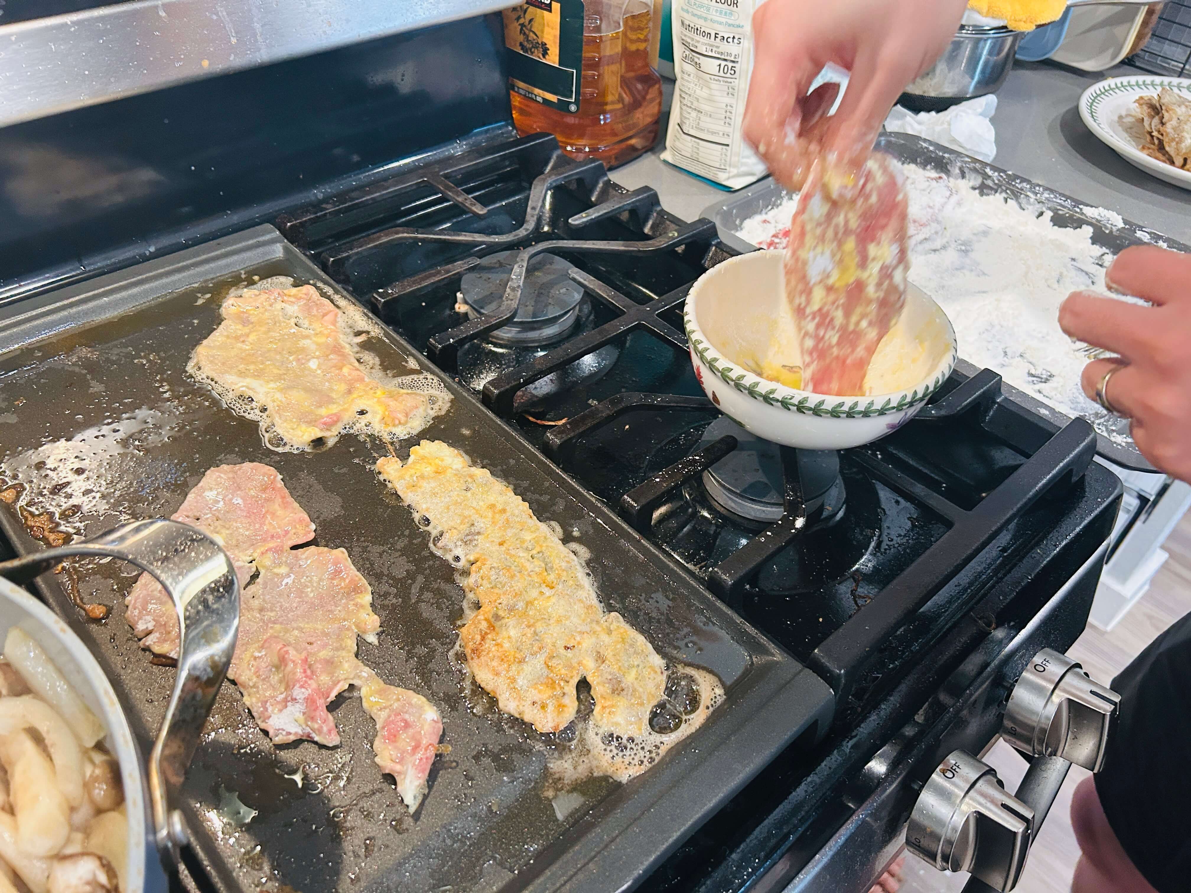 8. 계란물에 담갔다가 기름 두른 팬에 올려줍니다.