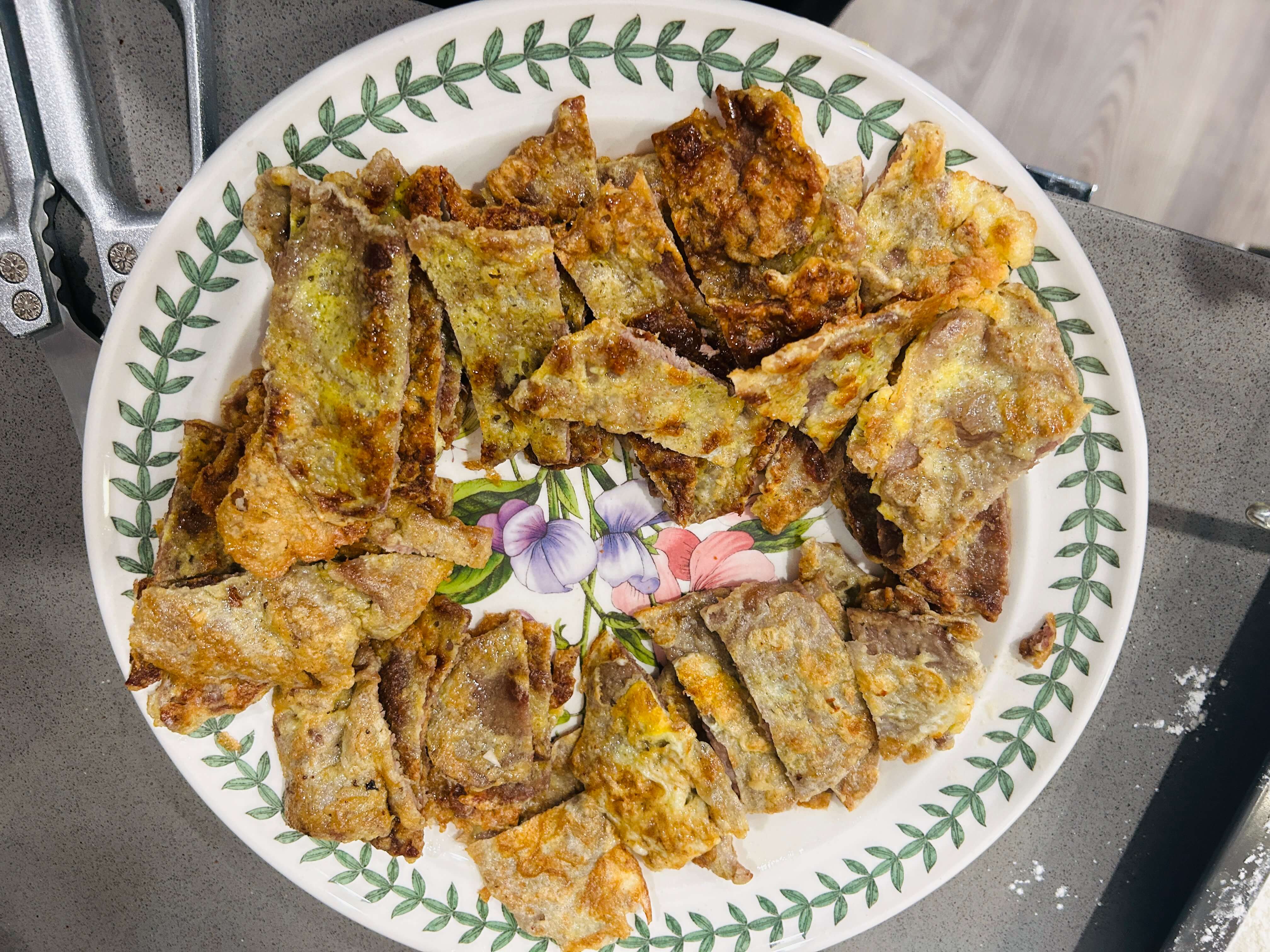 9. 노릇하게 익은 육전을 먹기좋게 잘라 접시에 담아줍니다.