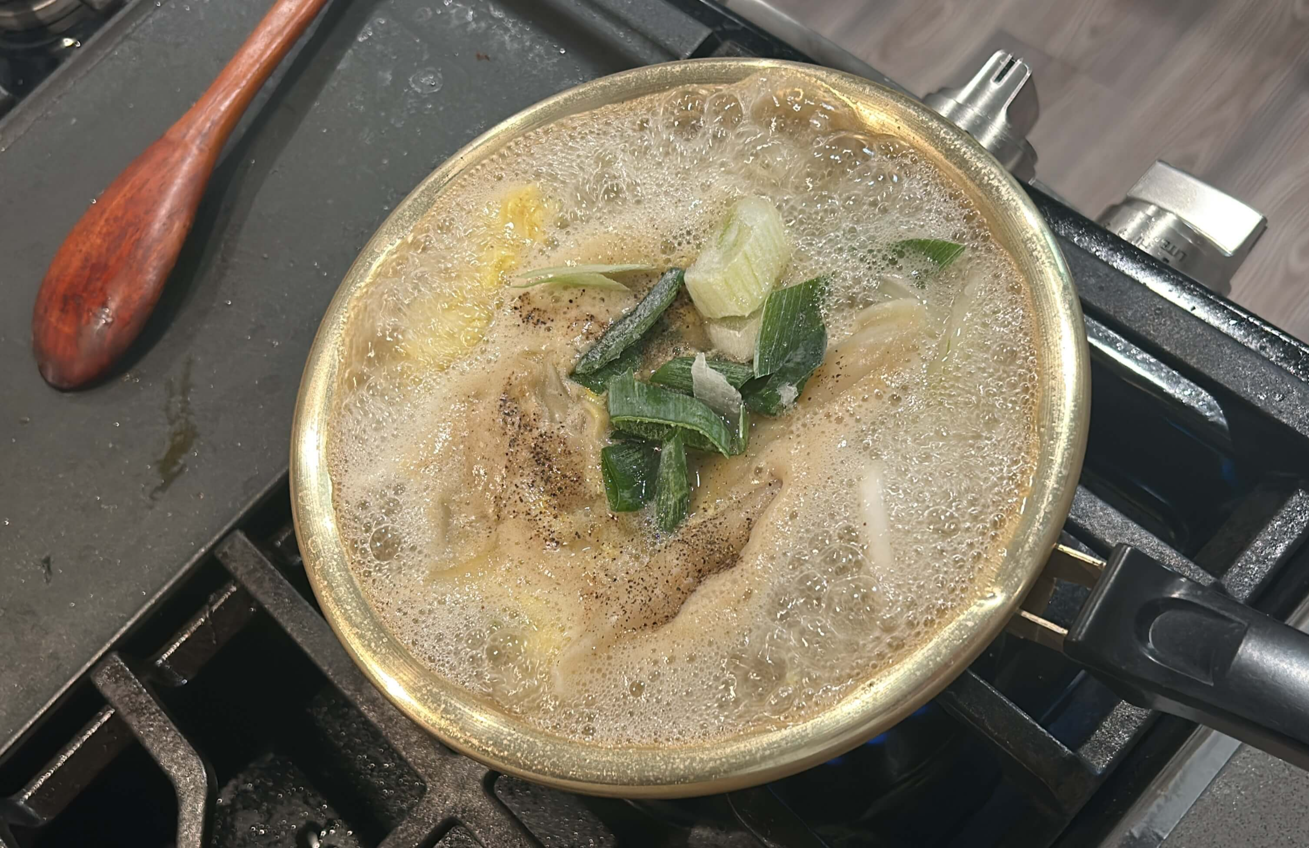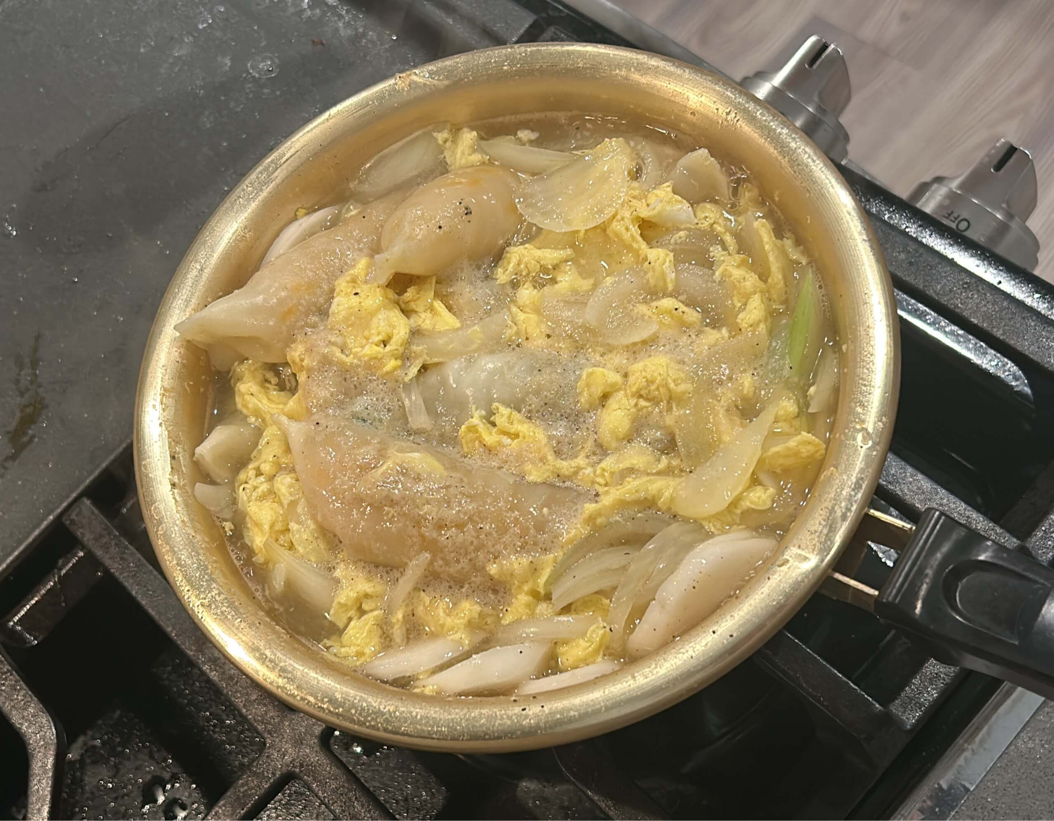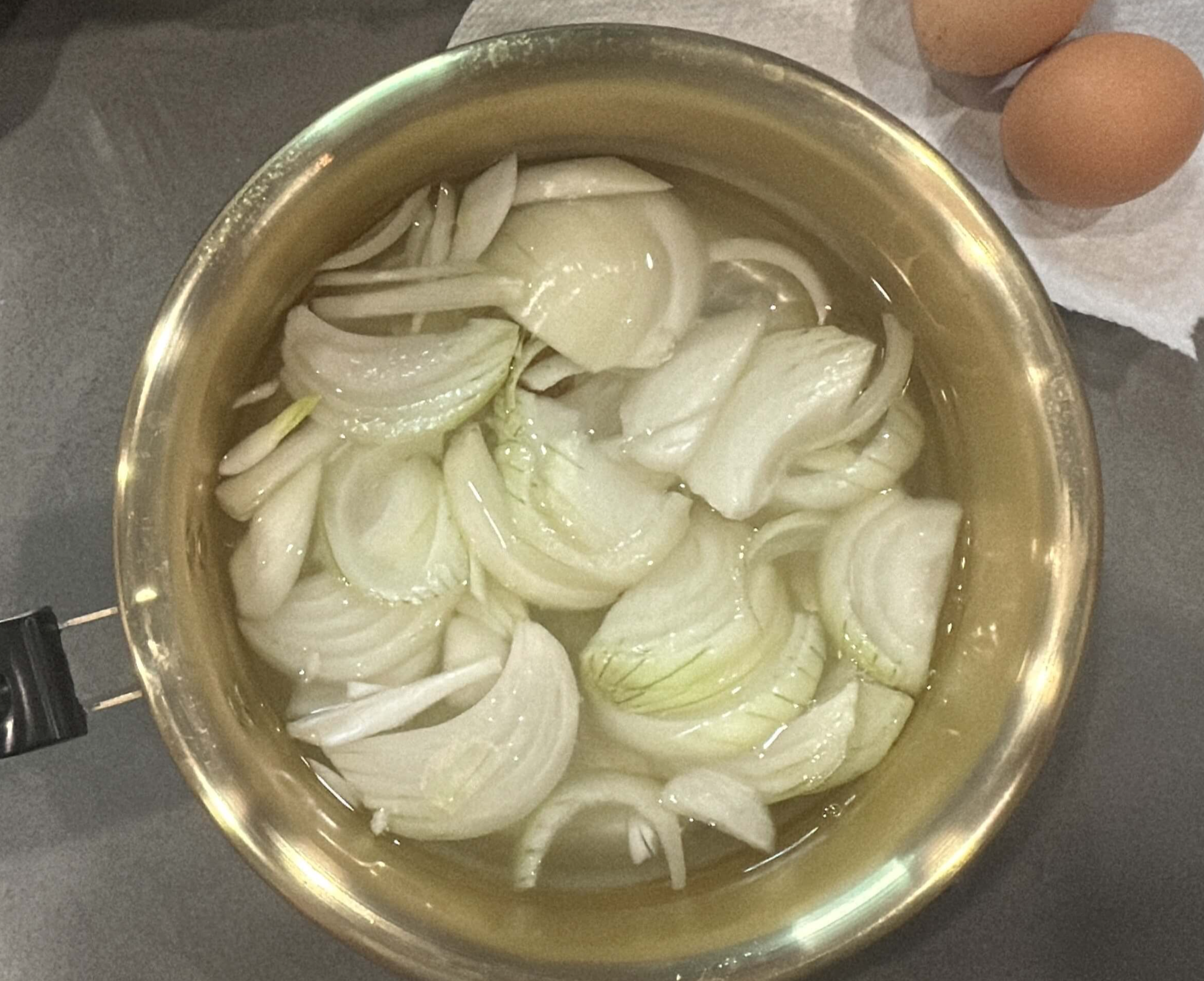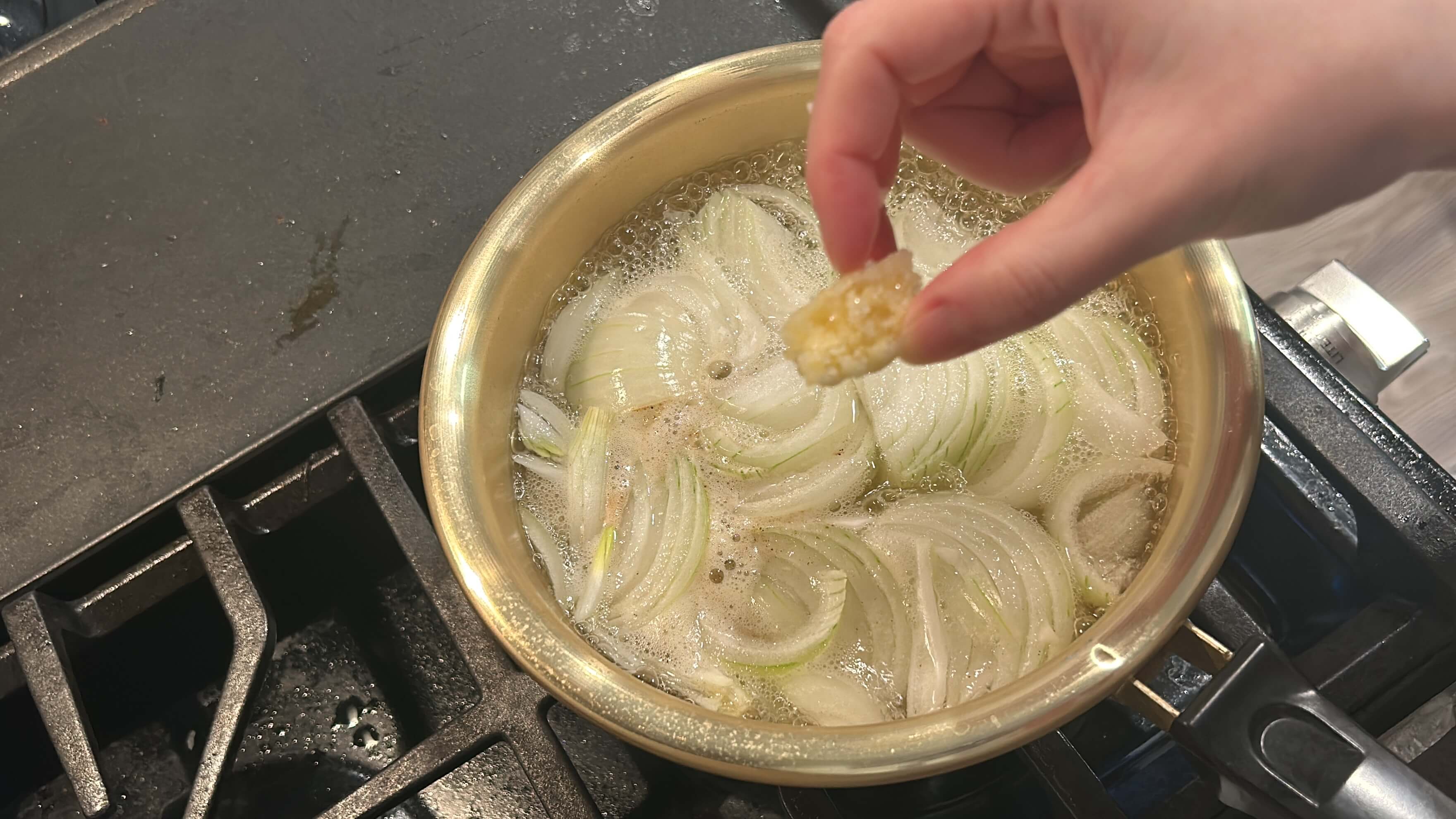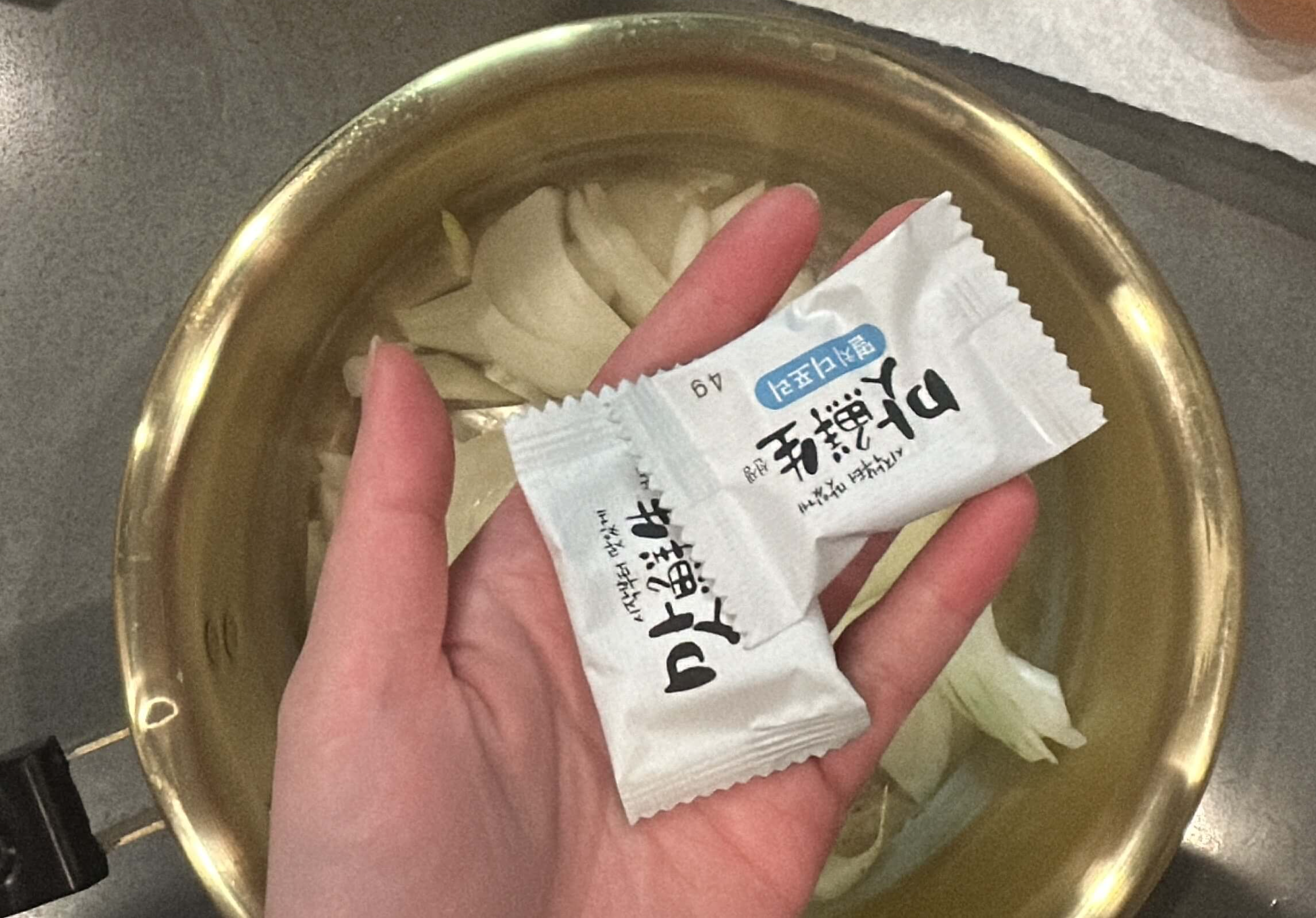 2. 냄비에 양파를 담고 육수 한 알을 넣고 물을 넣어 끓여줍니다.