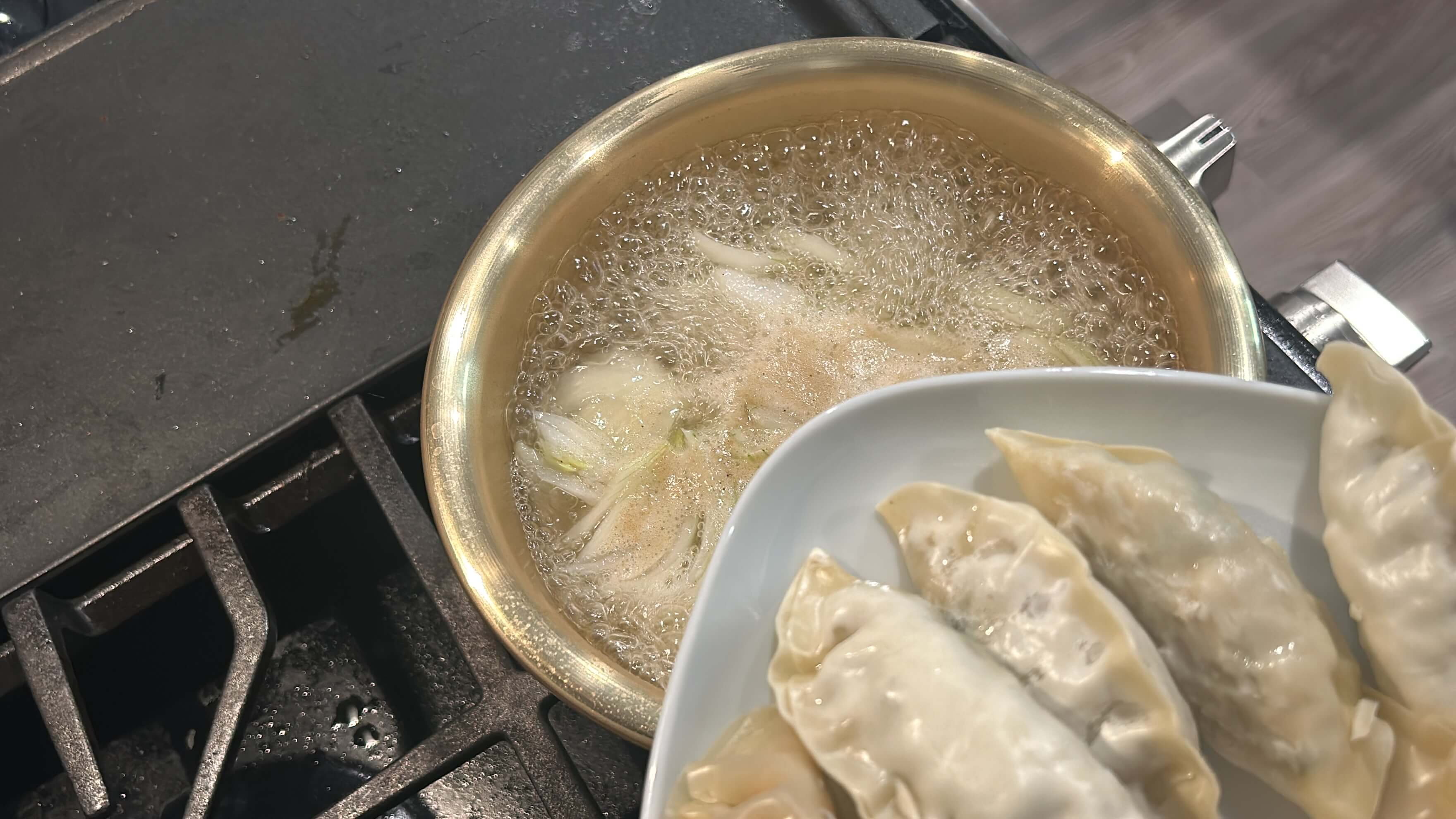 2. 냄비에 양파를 담고 육수 한 알을 넣고 물을 넣어 끓여줍니다.