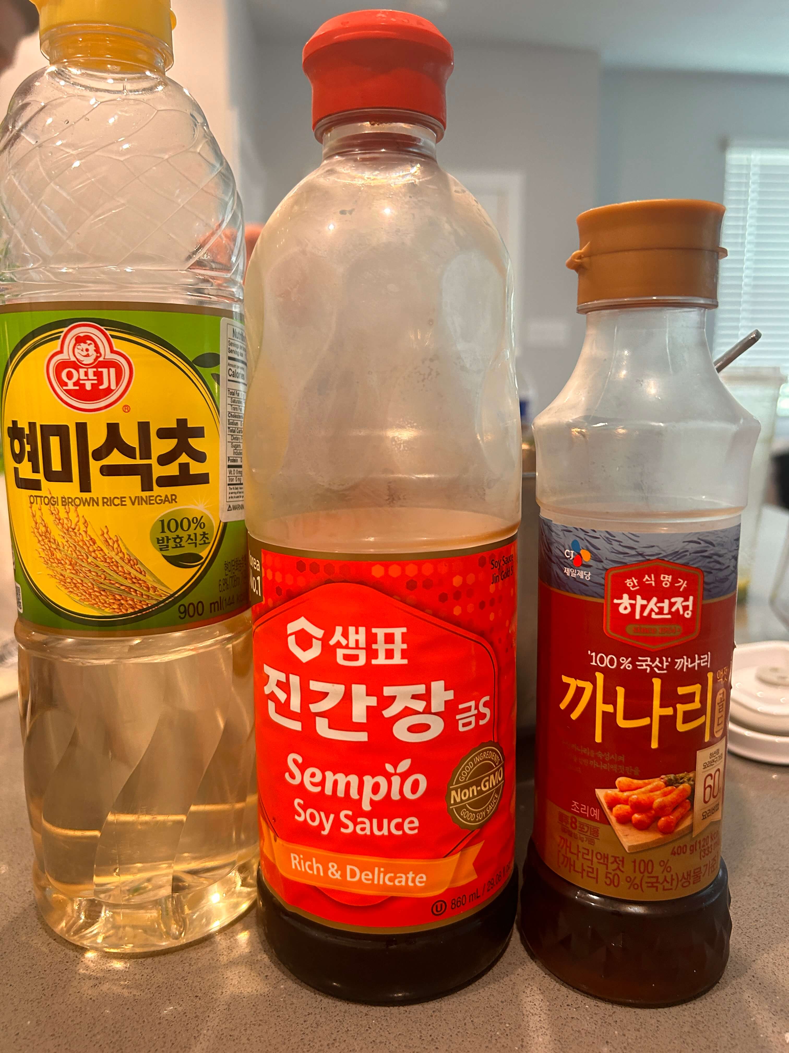 고춧가루 : 설탕 : 식초 : 진간장 : 액젓 : 소금 = 5 : 4 : 3 : 2 : 1 : 0.5