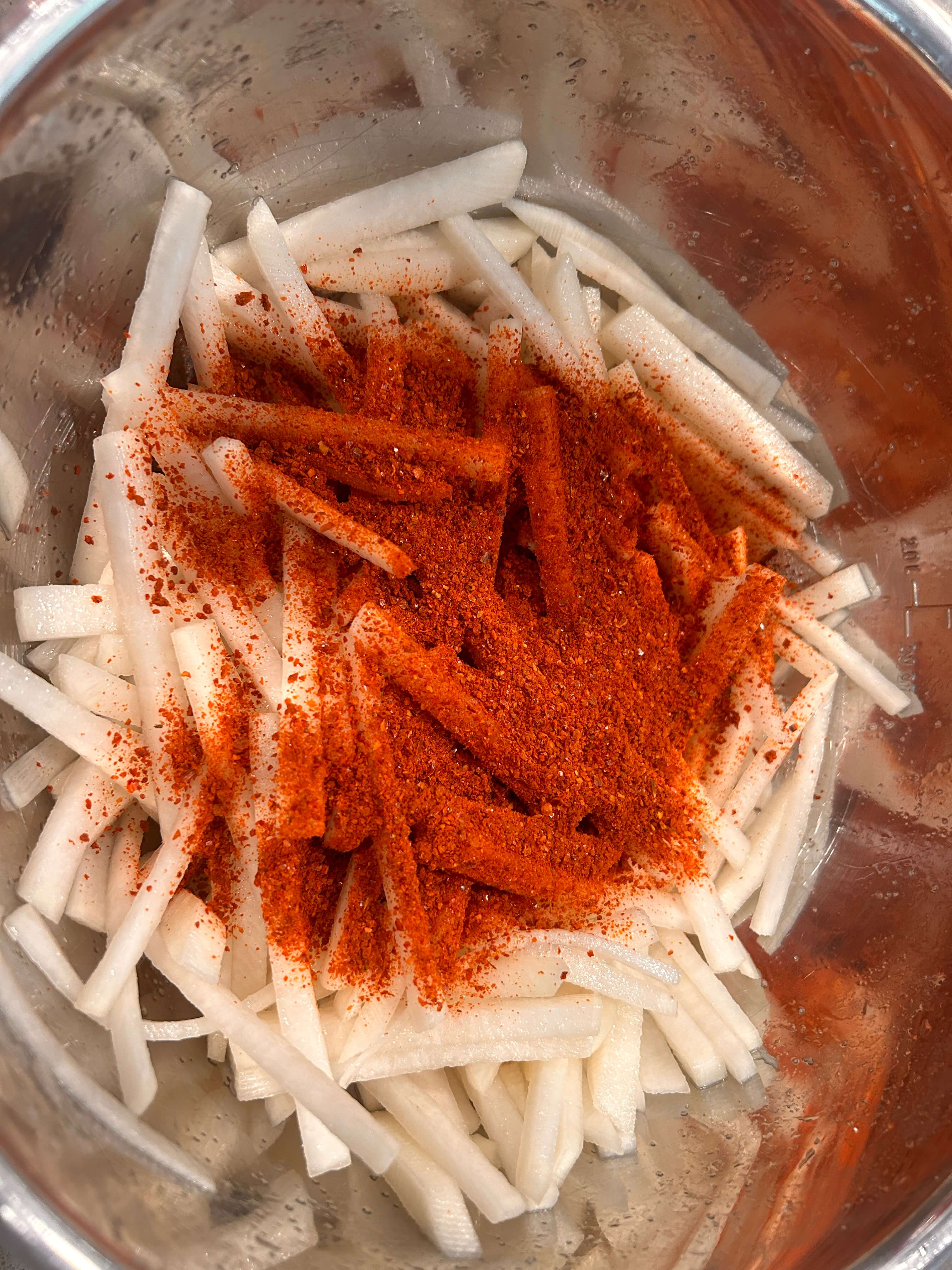 4. 고춧가루 2.5 숟갈을 넣고 잘 버무려줍니다.
