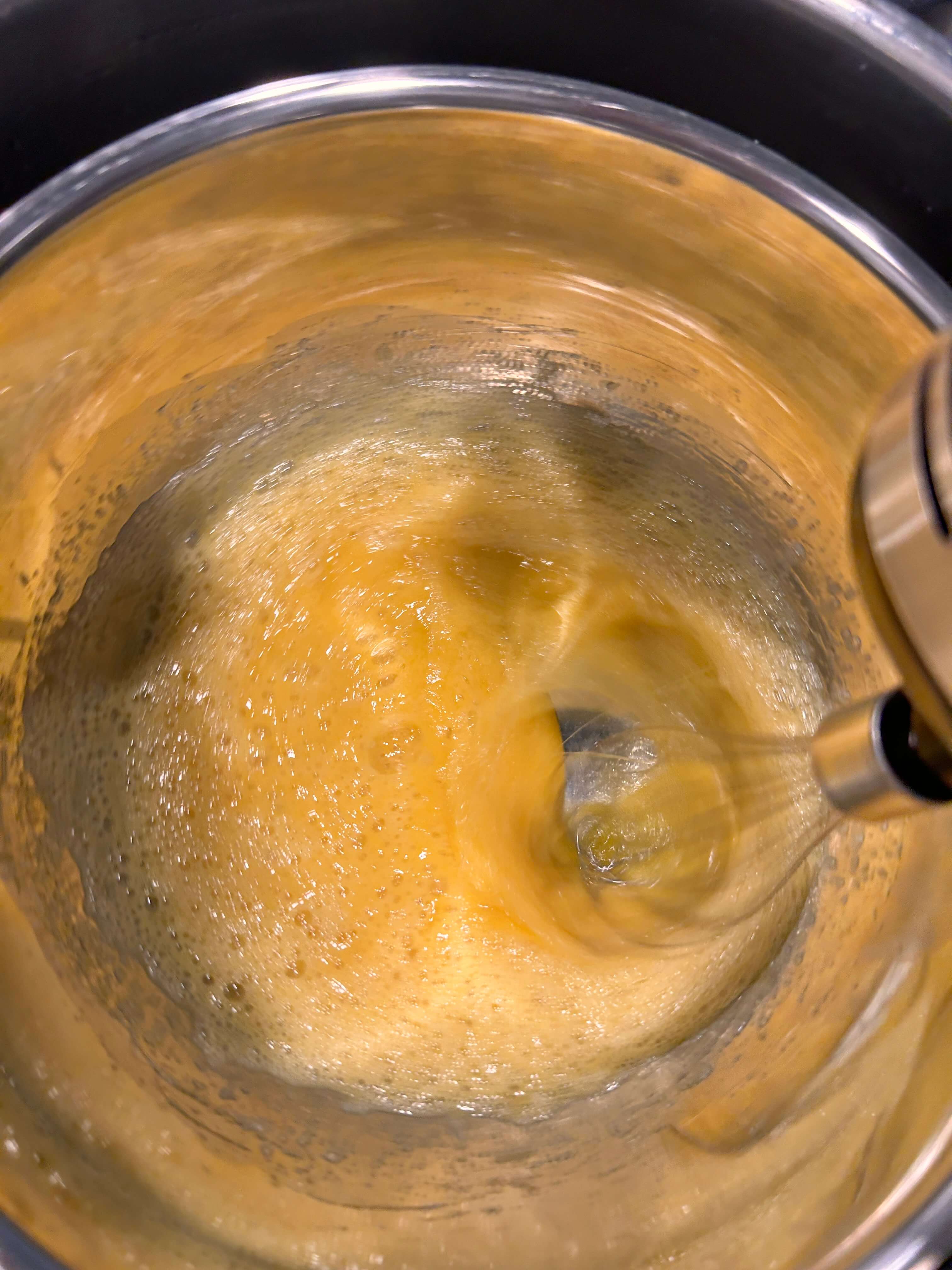 6. 계란이 익지 않게 세 번째 그림의 아이보리색이 나올 때까지 휘핑을 내어줍니다.