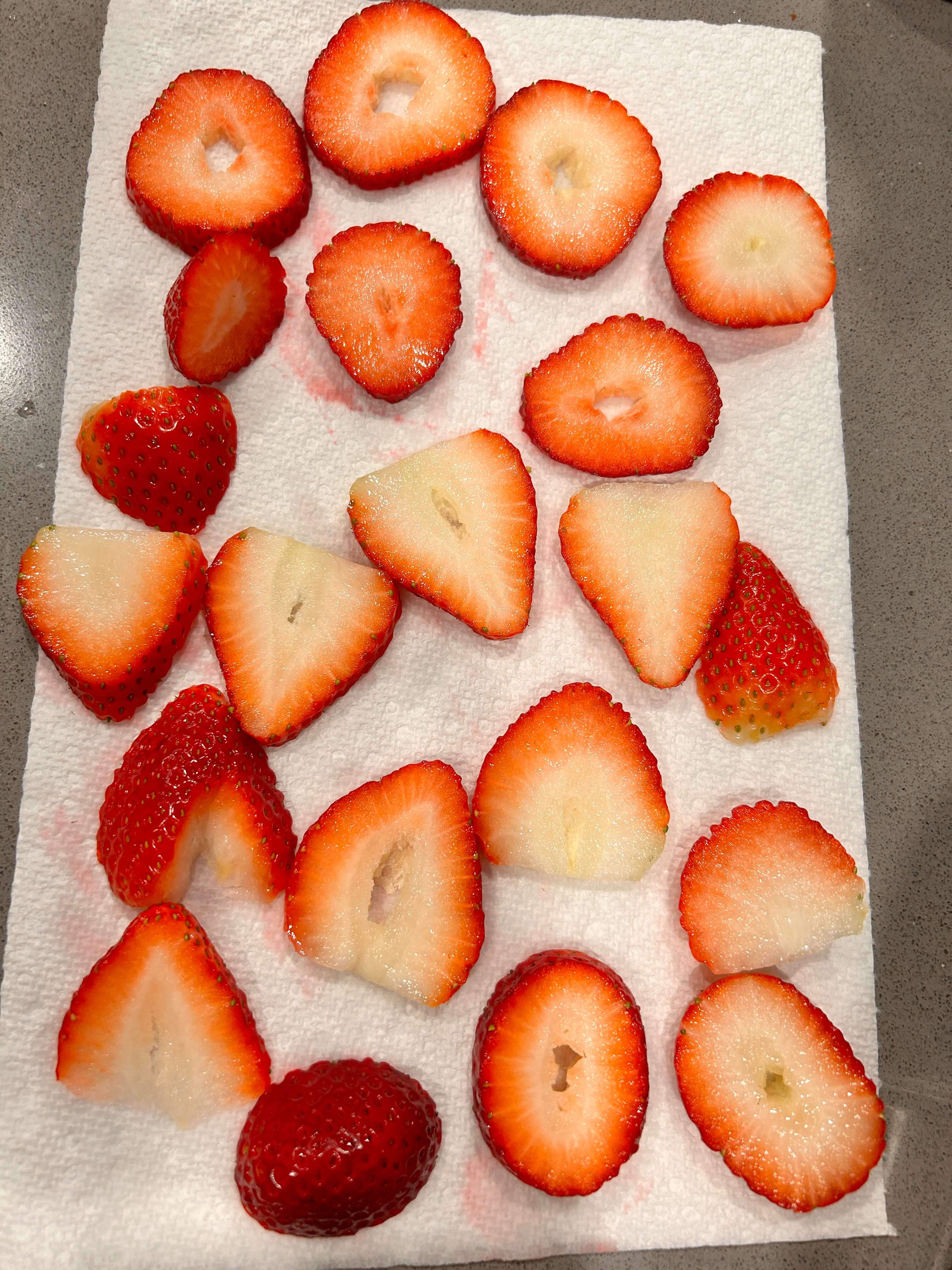 18. 딸기를 씻어 적당한 두께로 썰어 물기를 제거해 줍니다.
