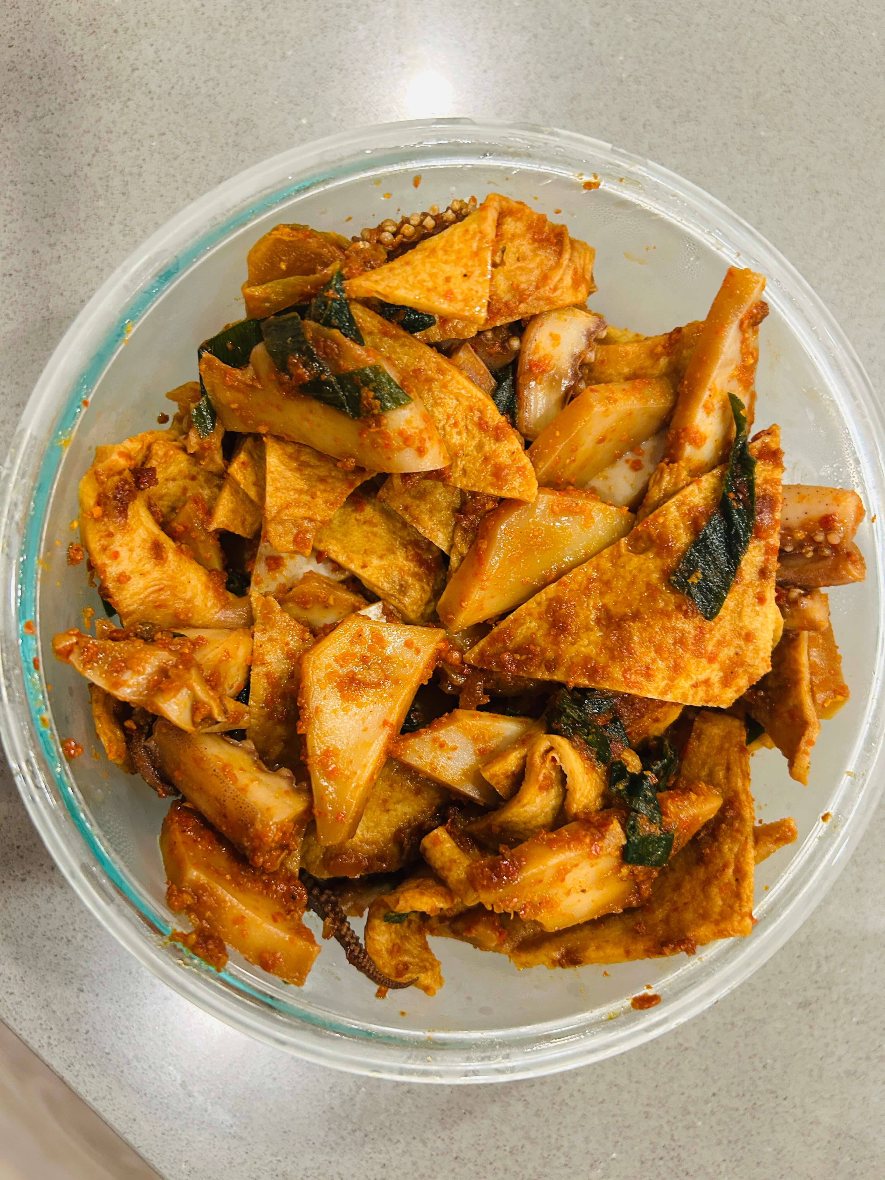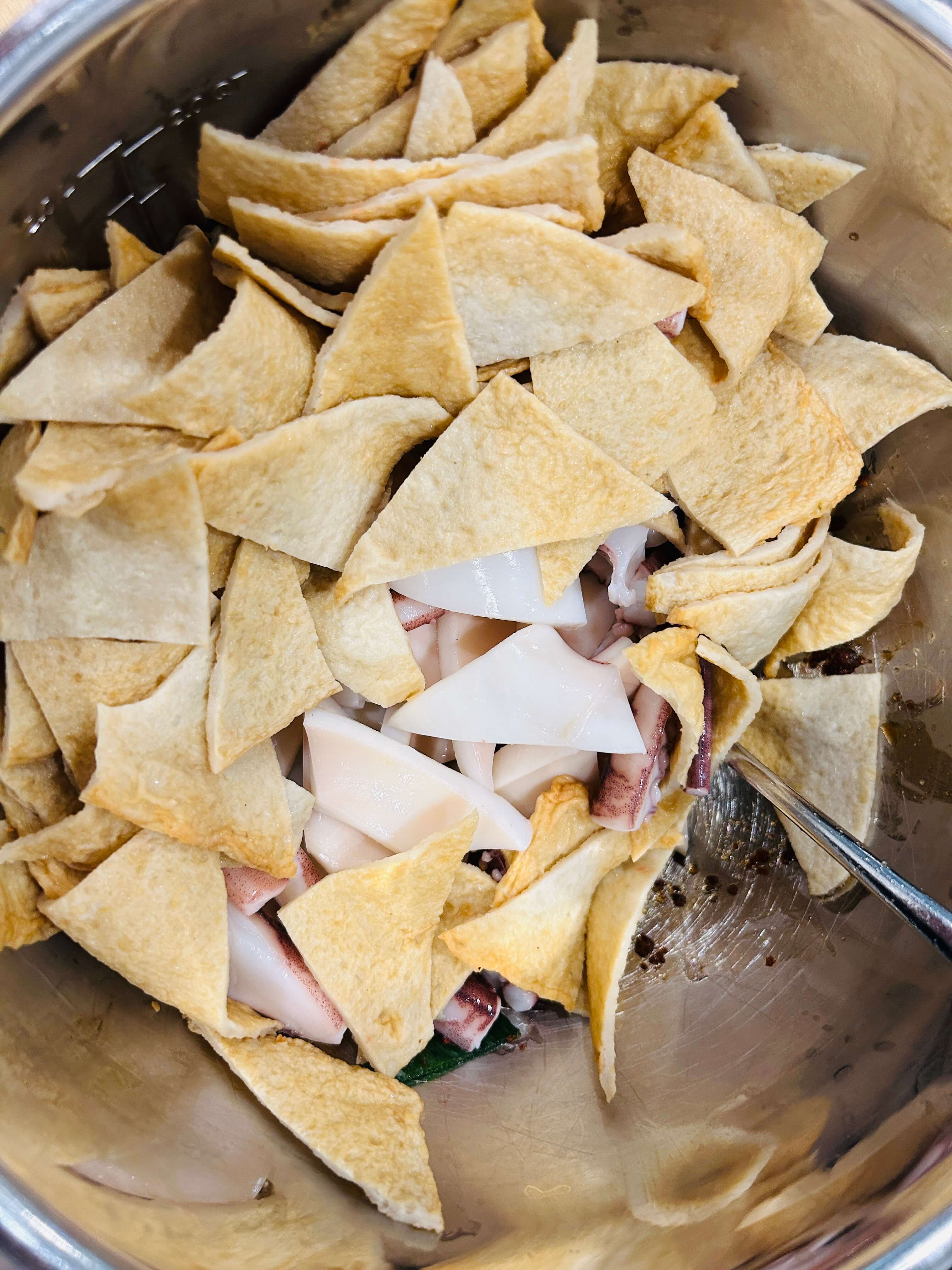 8. 양념에 데쳐서 준비한 어묵과 오징어를 잘 버무려 줍니다.