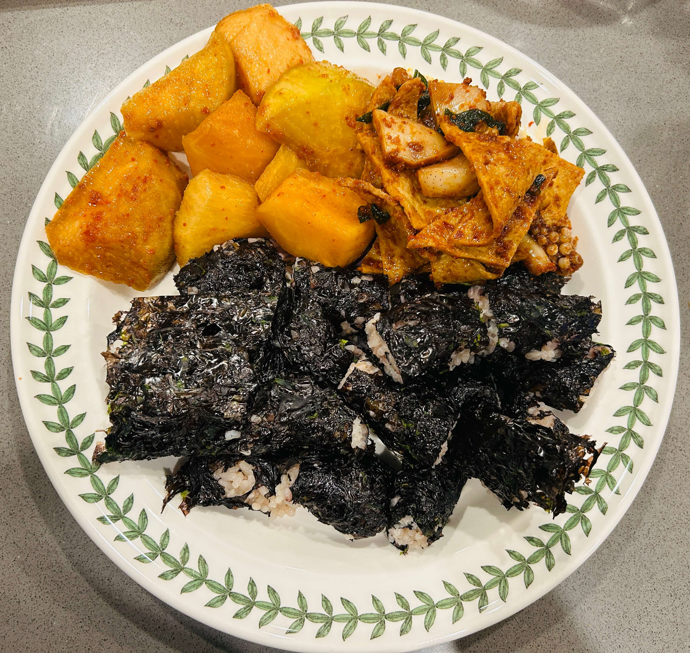 4. 접시에 오징어 어묵 무침과 무를 담아주고 김밥을 담아 줍니다.